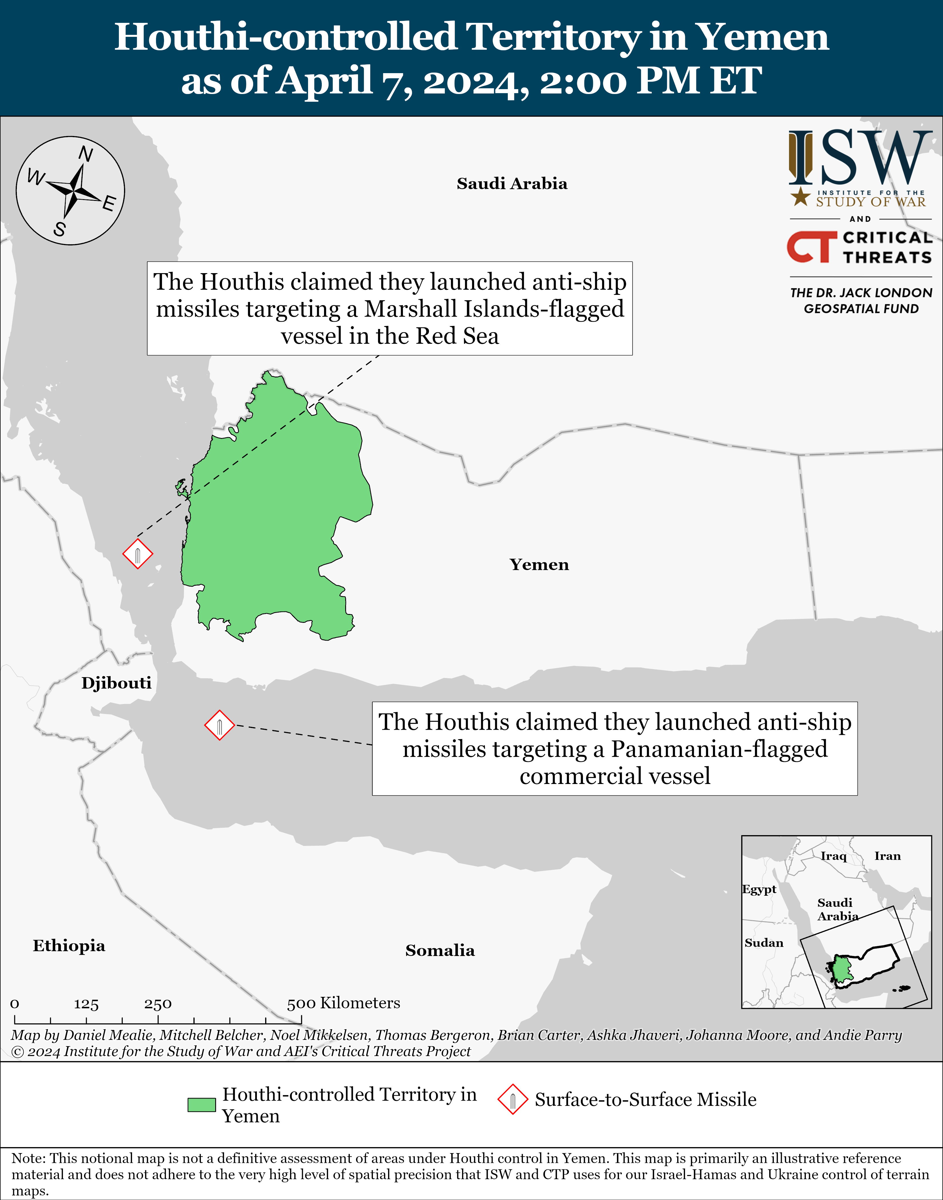 The Houthis claimed on April 7 that they conducted five drone and missile attacks targeting civilian and military vessels over the previous 72 hours.[30] The Houthis claimed that they conducted anti-ship missile attacks targeting a Marshall Islands-flagged “British ship” in the Red Sea and two Panamanian-flagged “Israeli ships” in the Arabian Sea and Indian Ocean.[31]