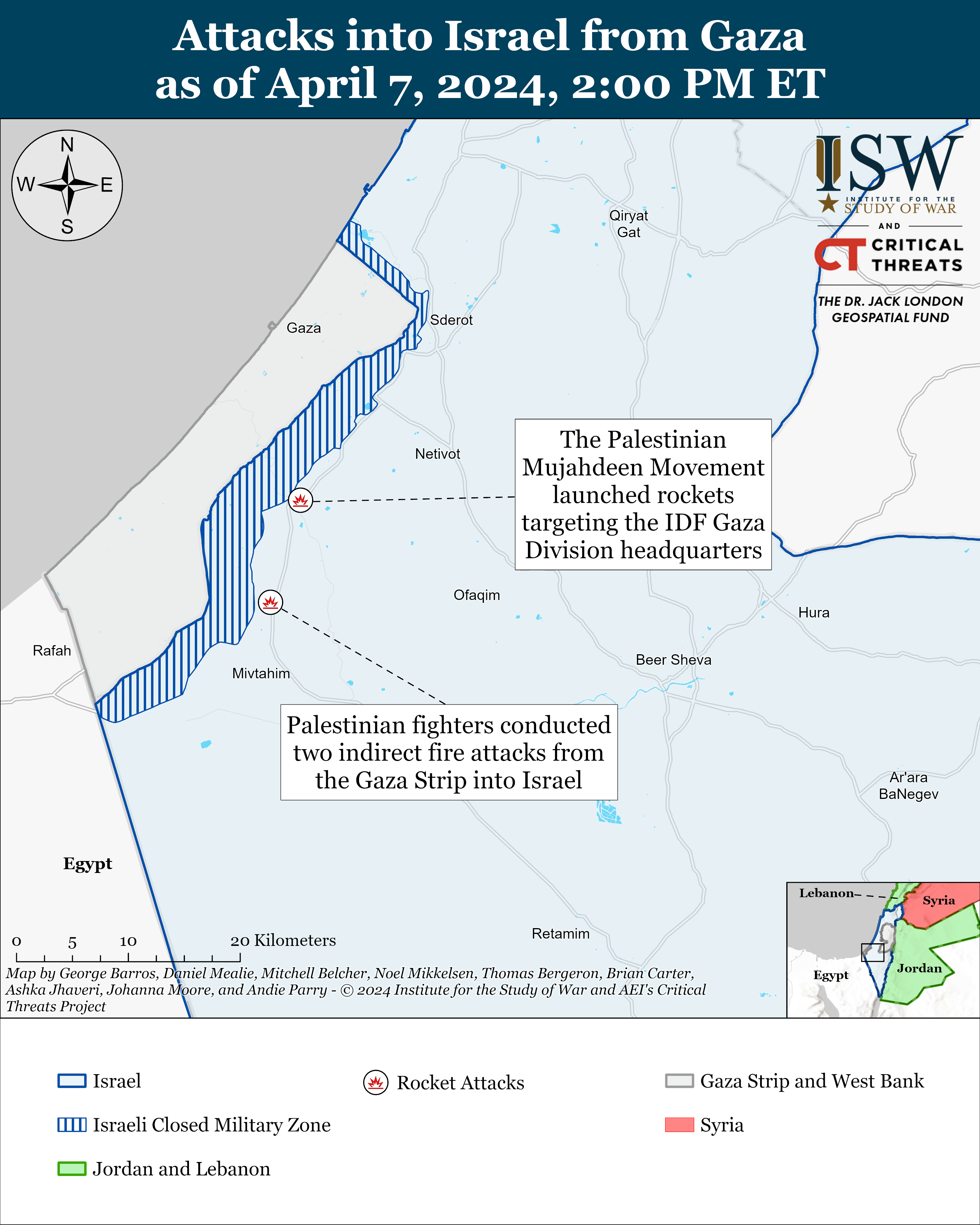 Palestinian fighters conducted two indirect fire attacks from the Gaza Strip into Israel on April 7. PIJ targeted towns in southern Israel with a five-rocket barrage shortly after all Israeli forces withdrew from the southern Gaza Strip.[19] An Israeli military correspondent said that the Iron Dome intercepted all the rockets.[20] The Palestinian Mujahideen Movement separately targeted the IDF Gaza Division headquarters in Reim, southern Israel.[21]