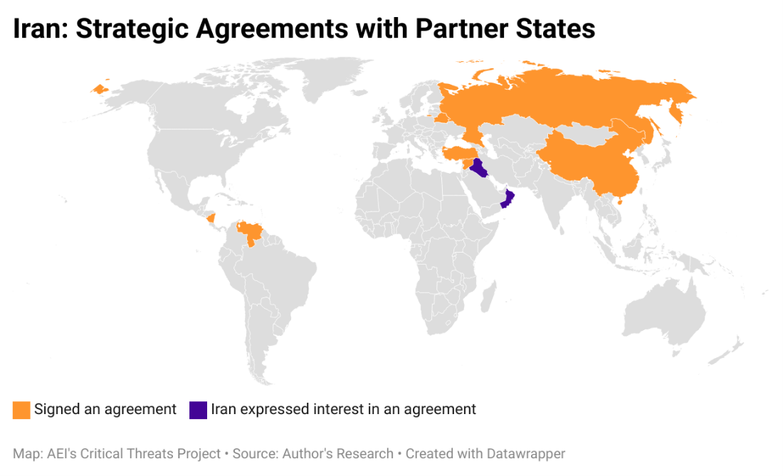 Iran’s close cooperation with Belarus and Russia may stem, in part, because Iran has signed long-term strategic agreements with these countries. The graphic below depicts which countries Iran has signed or is pursuing cooperation agreements with.