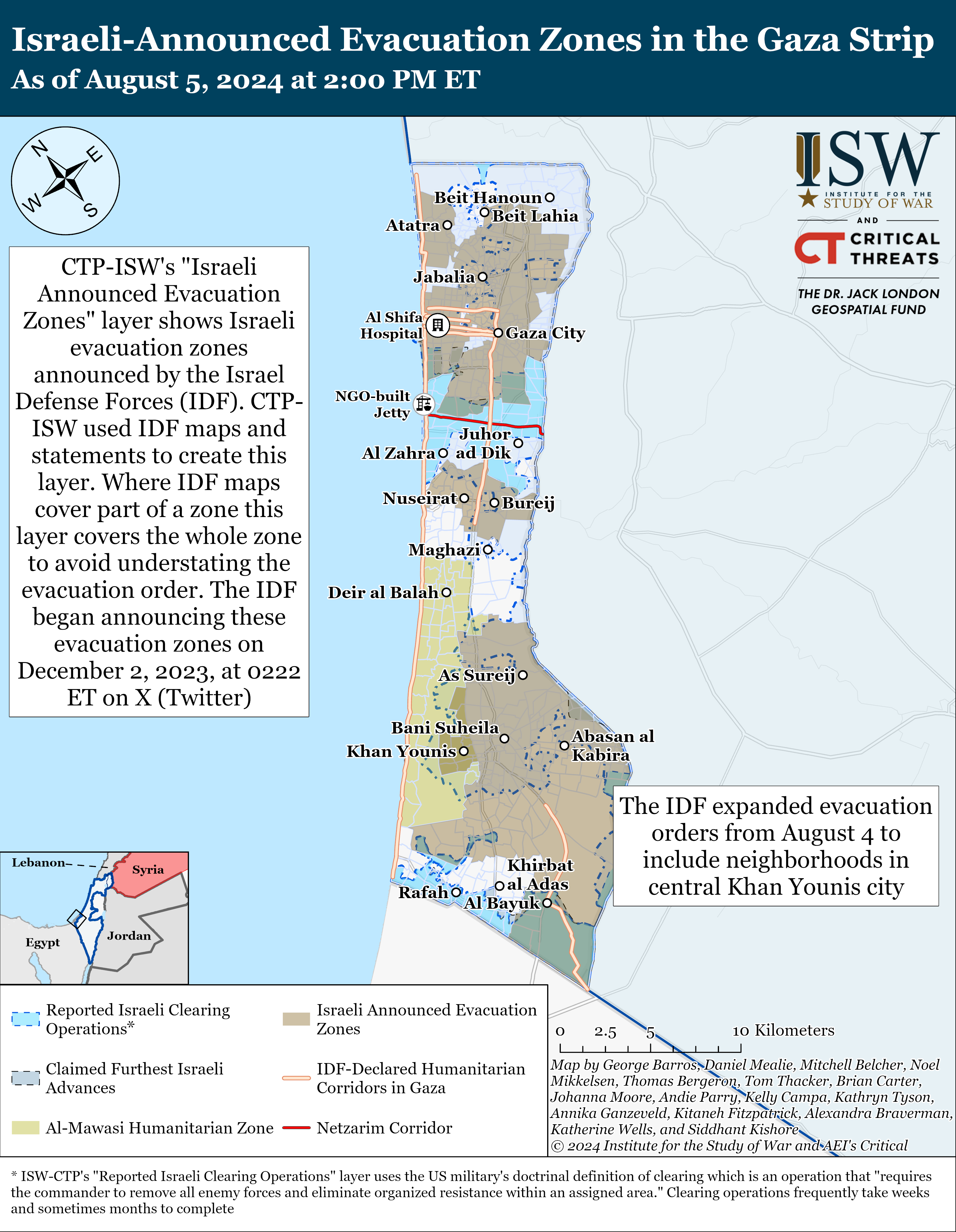 The IDF expanded its evacuation orders to include neighborhoods in central Khan Younis and encouraged Palestinian residents to follow the IDF’s previous evacuation orders for southern Khan Younis and northern Rafah on August 5.[74] The IDF previously issued evacuation orders for southern Khan Younis and northern Rafah on August 4 and said that it would operate in the evacuation zone in the coming days “with force” due to continued rocket attacks from this area.[75] The IDF expanded its evacuation orders slightly north on August 5 to include neighborhoods in central Khan Younis.[76] The IDF Arabic spokesperson told residents that remain within the evacuation zone to leave immediately for al Mawasi humanitarian zone.[77]