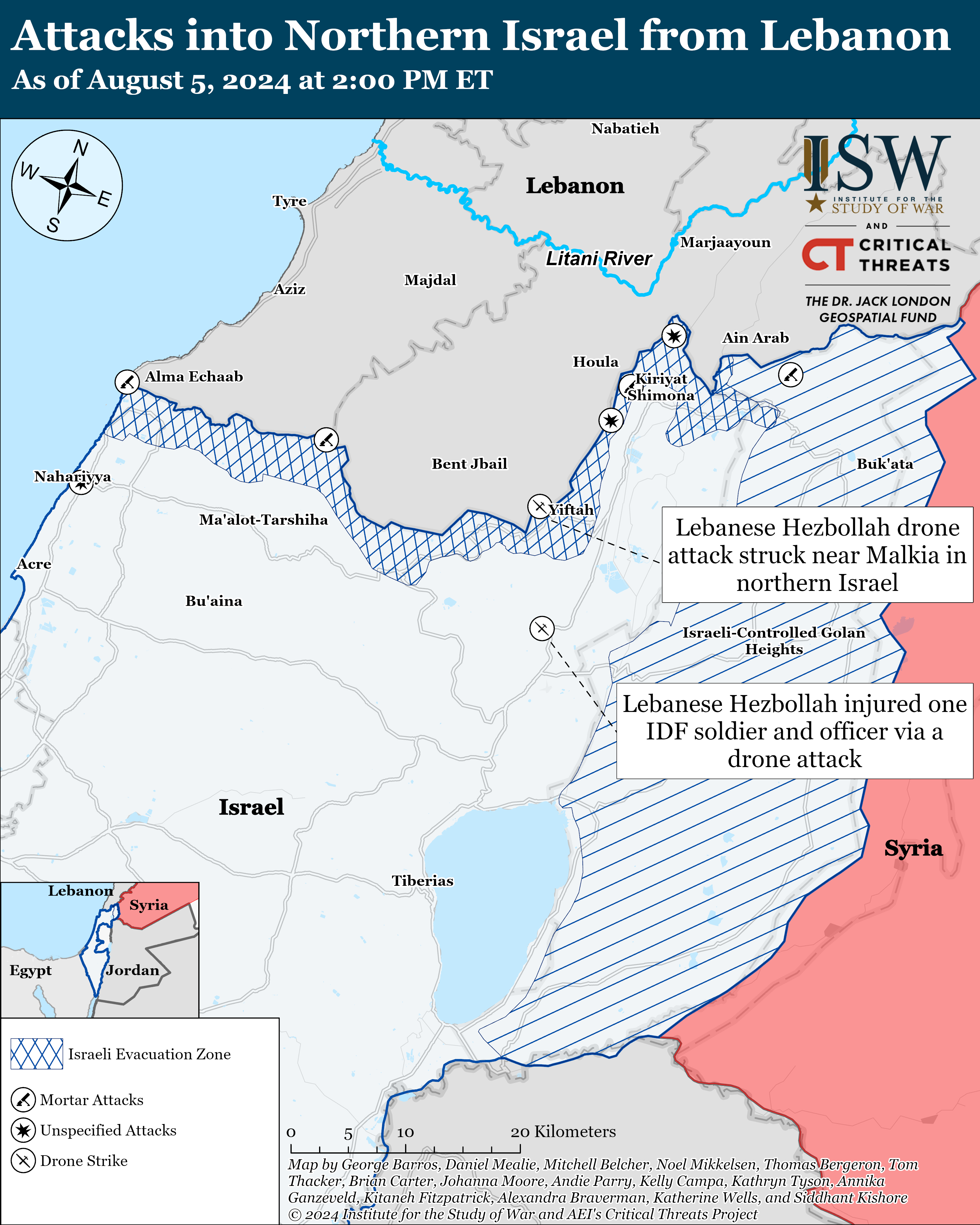 Iranian-backed militias, including Lebanese Hezbollah, have conducted at least 10 attacks into northern Israel since CTP-ISW’s last data cut-off on August 4.[112] Hezbollah launched a drone wave targeting the barracks of the IDF 91st division in Ayelet HaShahar on August 5.[113] The IDF attempted to intercept “suspicious aerial targets it identified,” but did not confirm if the interceptors successfully shot down the drones. One drone struck near Ayelet HaShahar, moderately injuring an IDF soldier and officer.[114] The attack also started a small fire in the area.[115] Hezbollah claimed the attack, adding that the attack was in response to previous Israeli strikes.[116]
