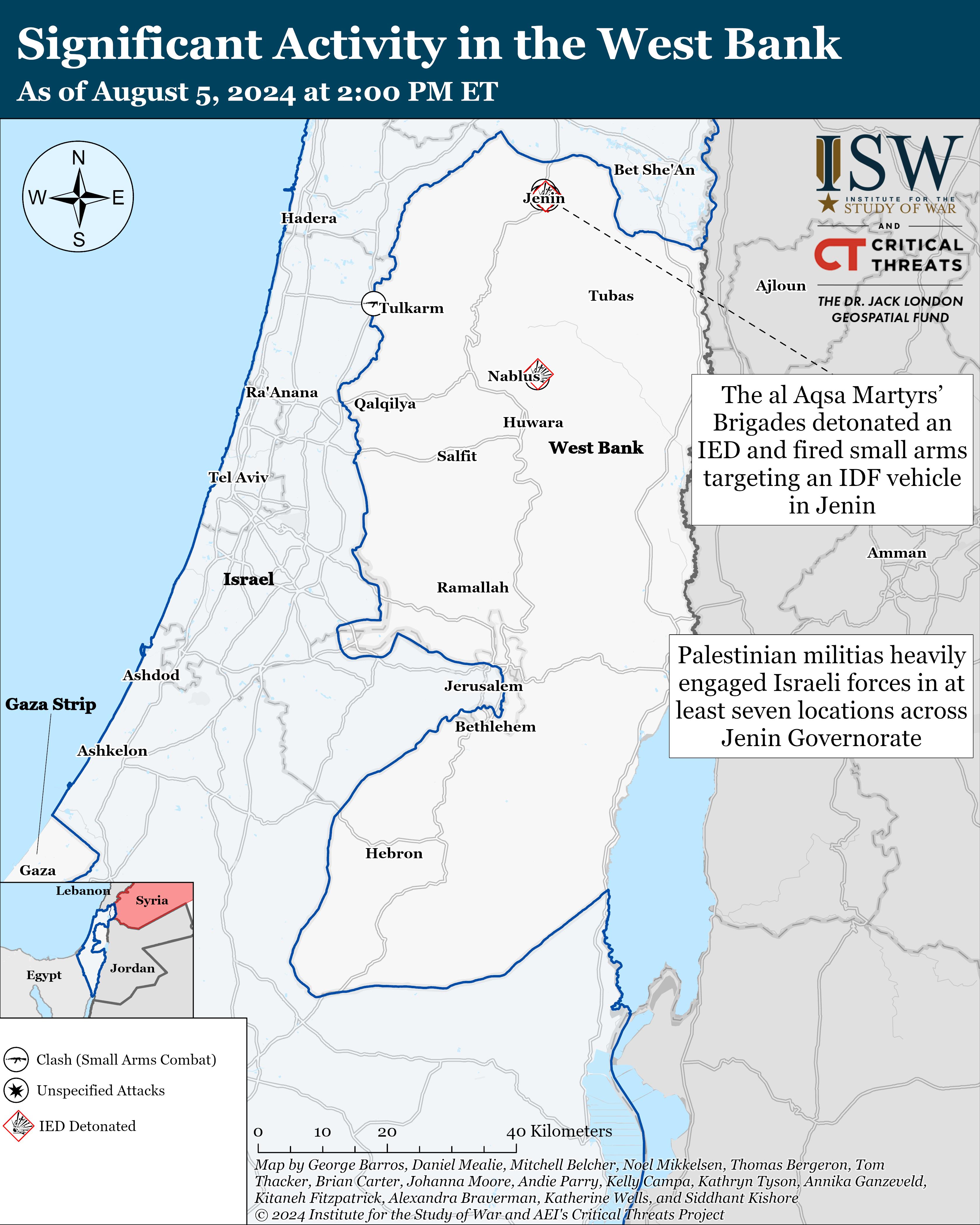 Israeli forces have engaged Palestinian fighters in at least ten locations in the West Bank since CTP-ISW’s last data cut-off on August 4.[105] Palestinian militias including the al Aqsa Martyrs’ Brigades, Palestinian Islamic Jihad (PIJ), and the Mujahideen Brigades engaged Israeli forces in at least eight locations across Jenin Governorate in the West Bank.[106] The al Aqsa Martyrs’ Brigades detonated an improvised explosive device (IED) and fired small arms targeting an IDF vehicle in Jenin.[107] The al Aqsa Martyrs’ Brigades separately targeted Israeli forces in Tulkarm and Nablus, in the West Bank.[108] PIJ fired small arms and detonated IEDs targeting Israeli forces in at least six locations across Jenin.[109]