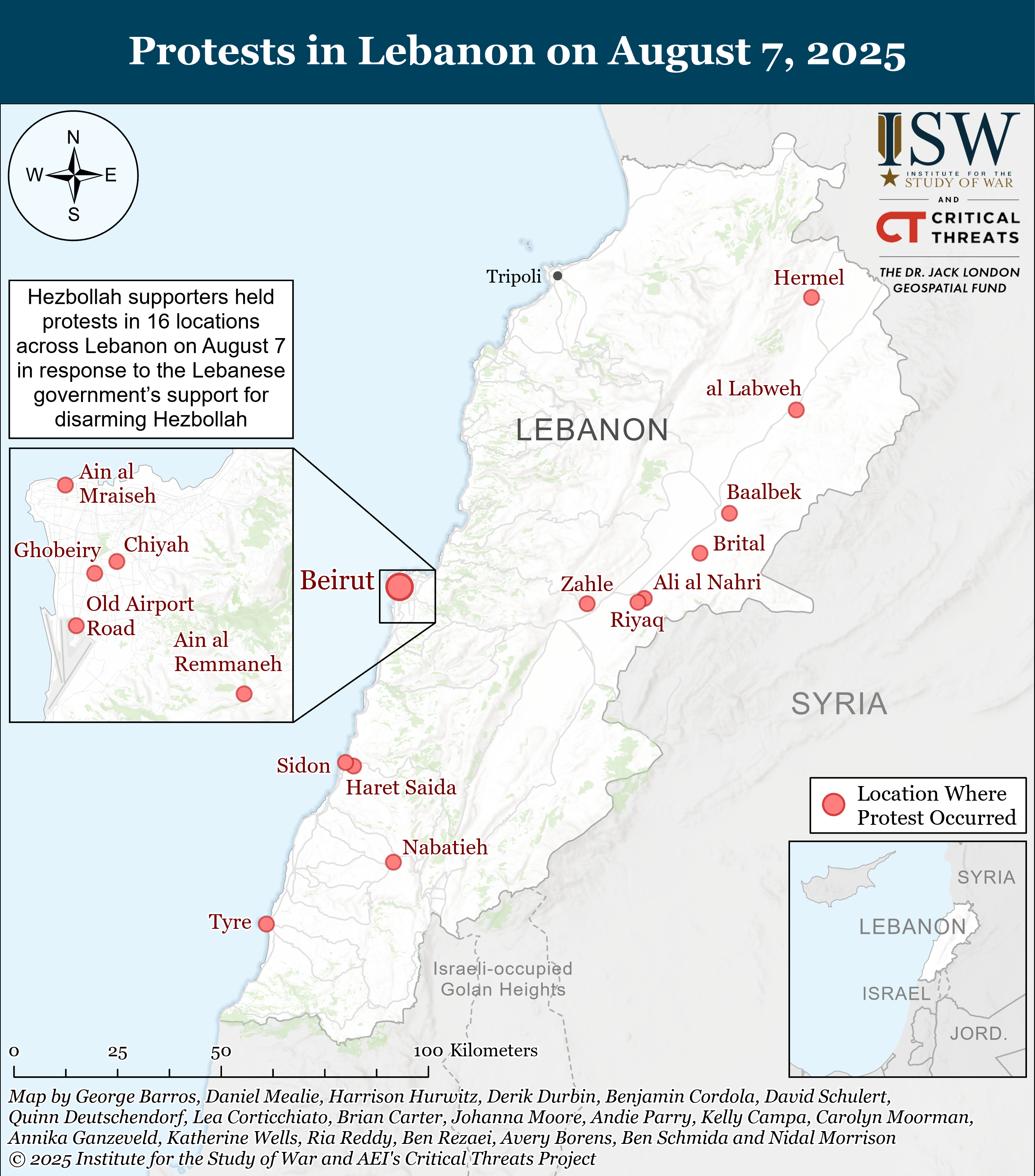 - Hezbollah supporters held protests in 16 locations across Lebanon on August 7 in response to the Lebanese government’s support for disarming Hezbollah. Public support for Hezbollah presents a significant obstacle to decreasing Hezbollah’s influence in Lebanon in the short term.