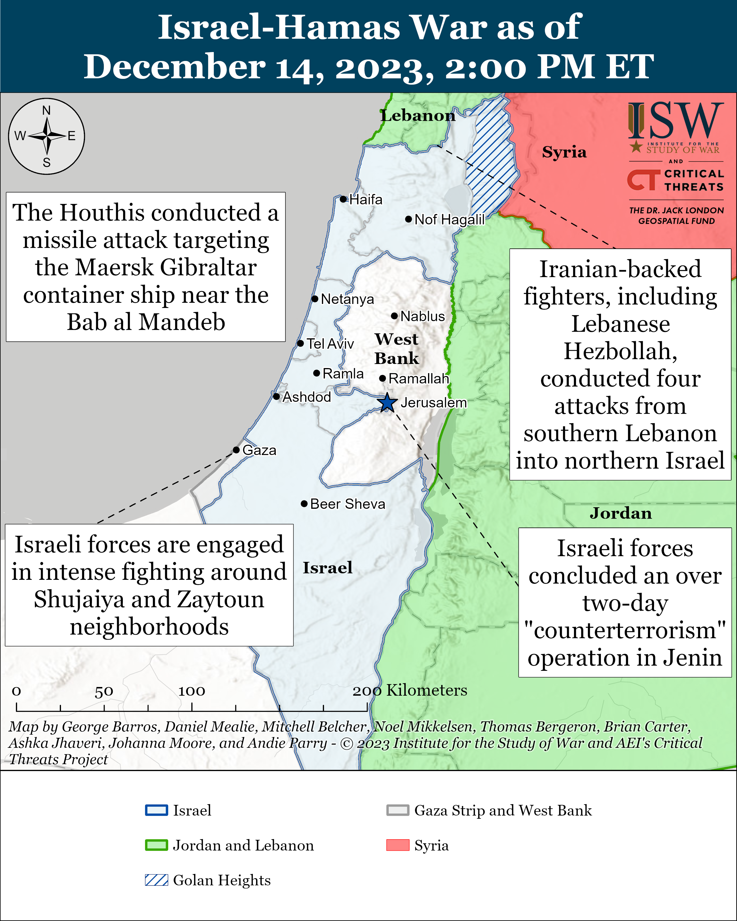Israeli forces clashed with Palestinian fighters nine times in the West Bank on December 14.[37] The al Qassem Brigades’ Qabatiya Battalion engaged Israeli forces in small arms clashes and detonated IEDs targeting these forces in Jenin.[38] Palestinian fighters also clashed with Israeli forces in the Jenin refugee camp.[39] Israeli forces conducted drone strikes in Jenin, which Palestinian authorities said killed at least two people.[40] Palestinian fighters separately clashed with Israeli forces in Beita, near Nablus.[41] The IDF said that it detained 14 individuals, including three Hamas fighters, in overnight raids across the West Bank.[42]