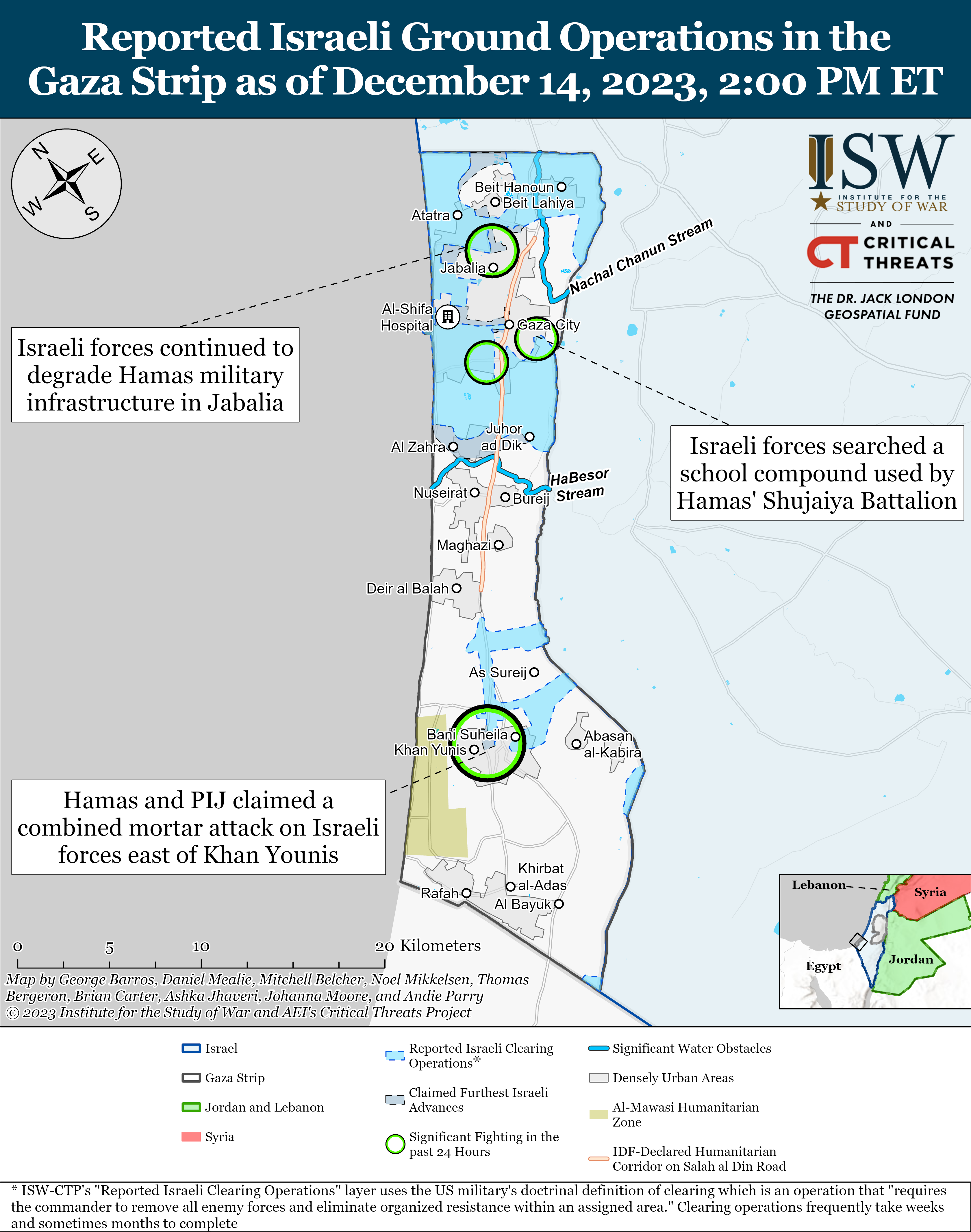 Israeli forces are engaged in intense fighting around Shujaiya and Zaytoun neighborhoods of Gaza city. Israel Defense Forces (IDF) Chief of Staff Herzi Halevi told Israeli forces in the Gaza Strip that they are facing challenging terrain in these areas.[1] These remarks are unsurprising in part because Shujaiya is one of the most densely populated areas of the Gaza Strip.[2] Israeli forces searched on December 13 a school compound that Hamas’ Shujaiya Battalion used.[3] Israeli forces also cleared nearby tunnels.[4]