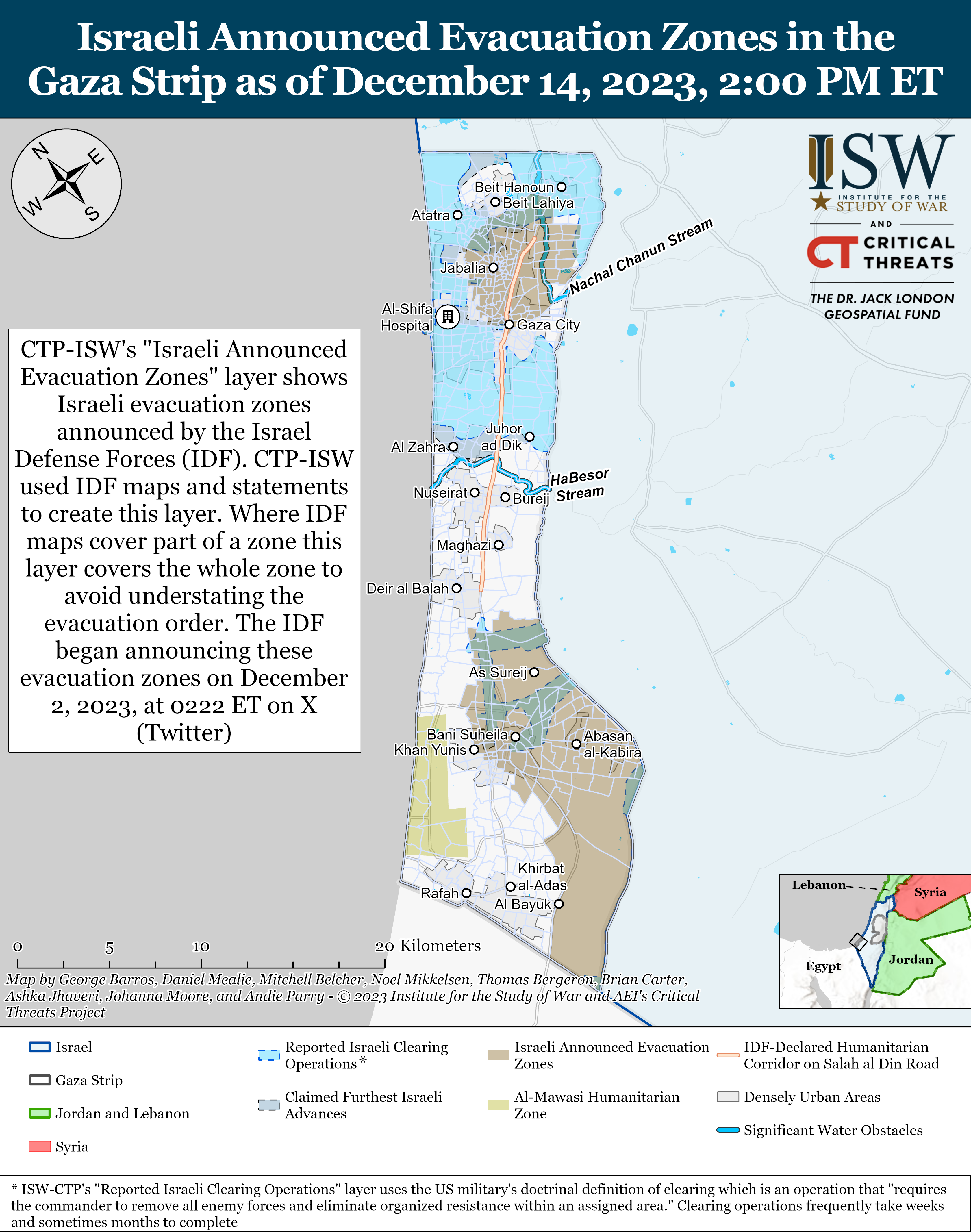 Note: CTP and ISW have refocused the update to cover the Israel-Hamas war. The new sections address developments in the Gaza Strip, the West Bank, Lebanon, and Syria, as well as noteworthy activity from Iran’s Axis of Resistance. We do not report in detail on war crimes because these activities are well-covered in Western media and do not directly affect the military operations we are assessing and forecasting. We utterly condemn violations of the laws of armed conflict and the Geneva Conventions and crimes against humanity even though we do not describe them in these reports.