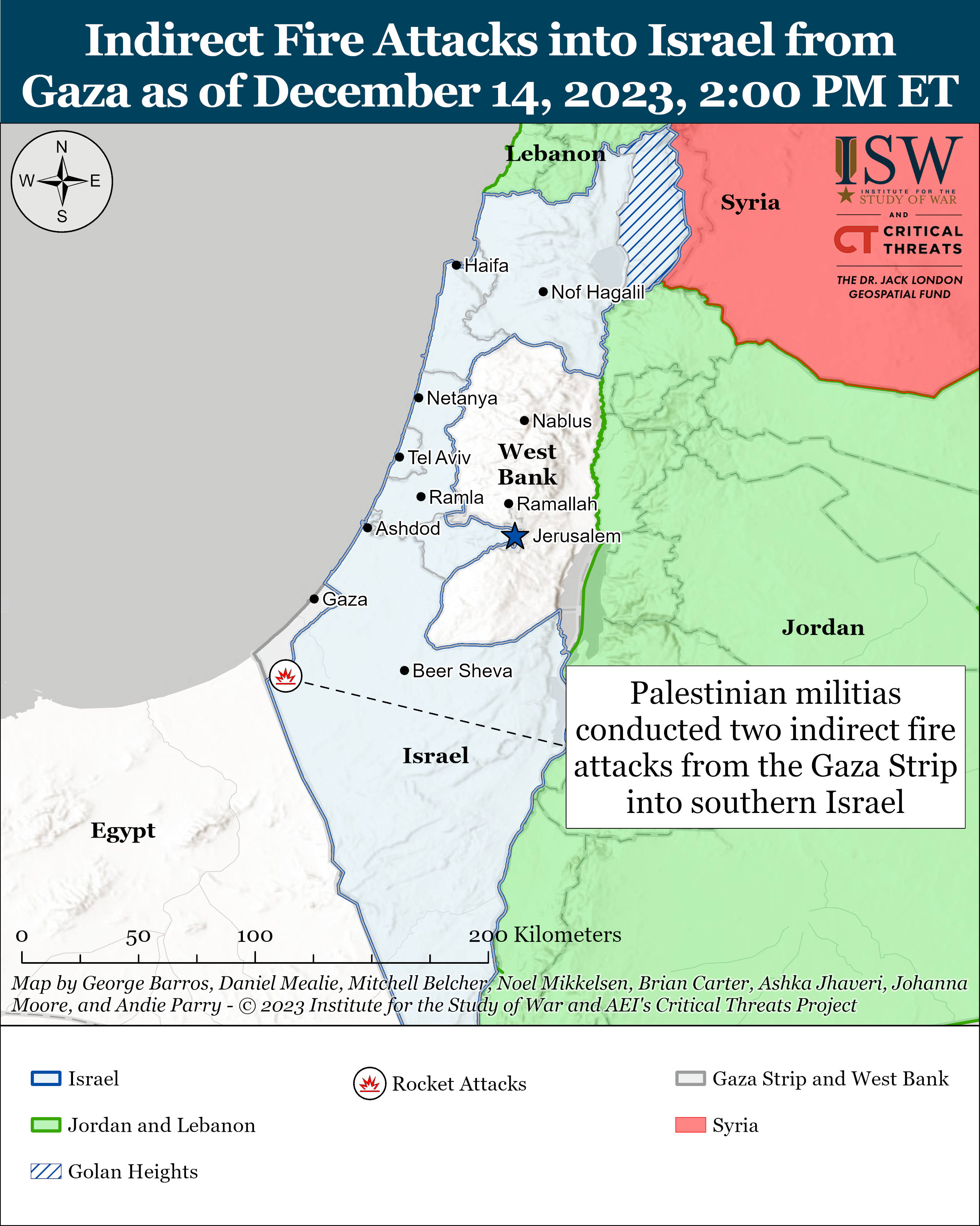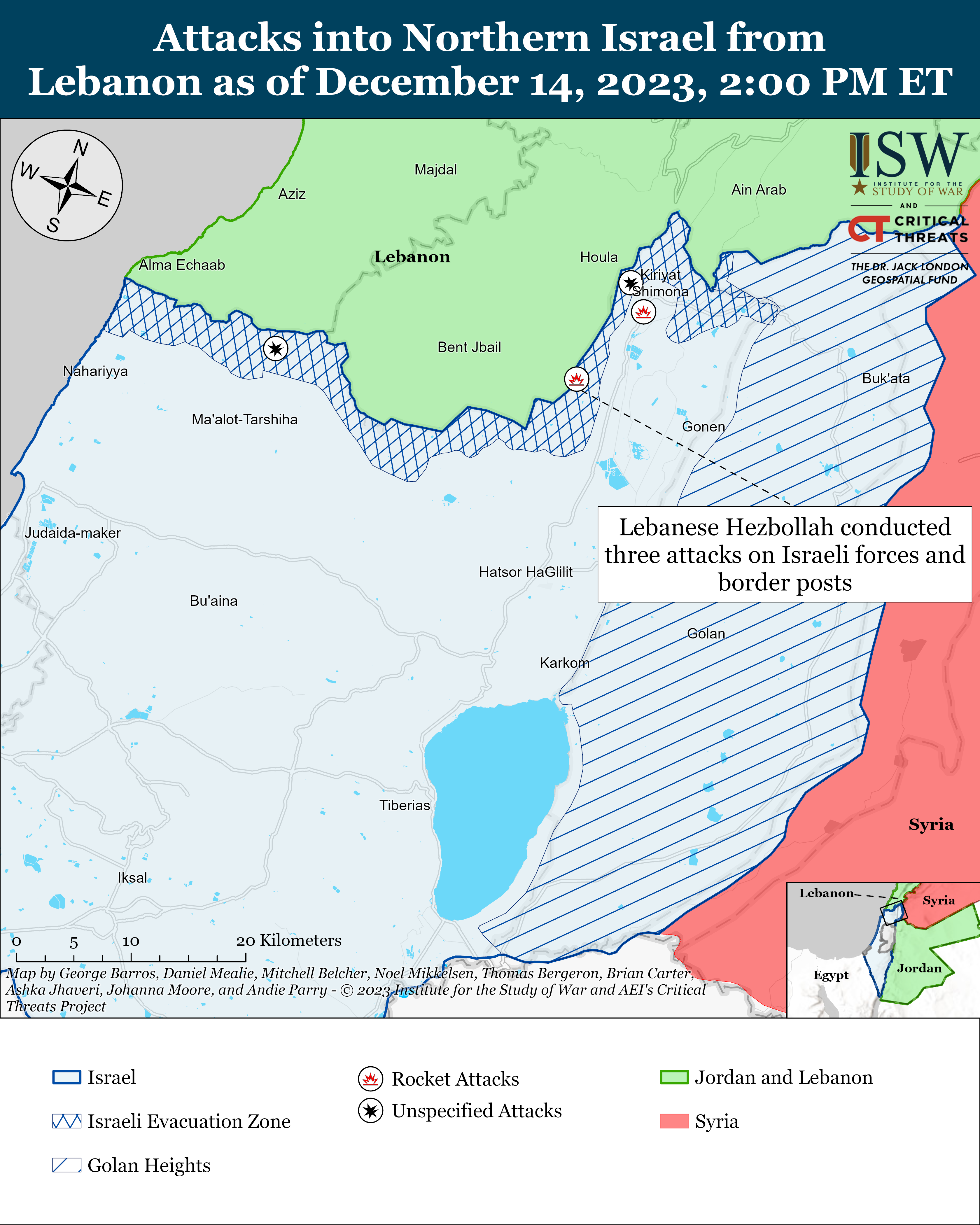 Iranian-backed fighters, including Lebanese Hezbollah (LH), conducted four attacks from southern Lebanon into northern Israel on December 14.[46] This rate of attack marks a noteworthy dip from the average rate of 12 attacks per day since December 1. LH claimed three of the four attacks, which targeted Israeli military positions along the border.[47] Unidentified Palestinian fighters conducted one rocket attack into northern Israel targeting civilian areas.[48]