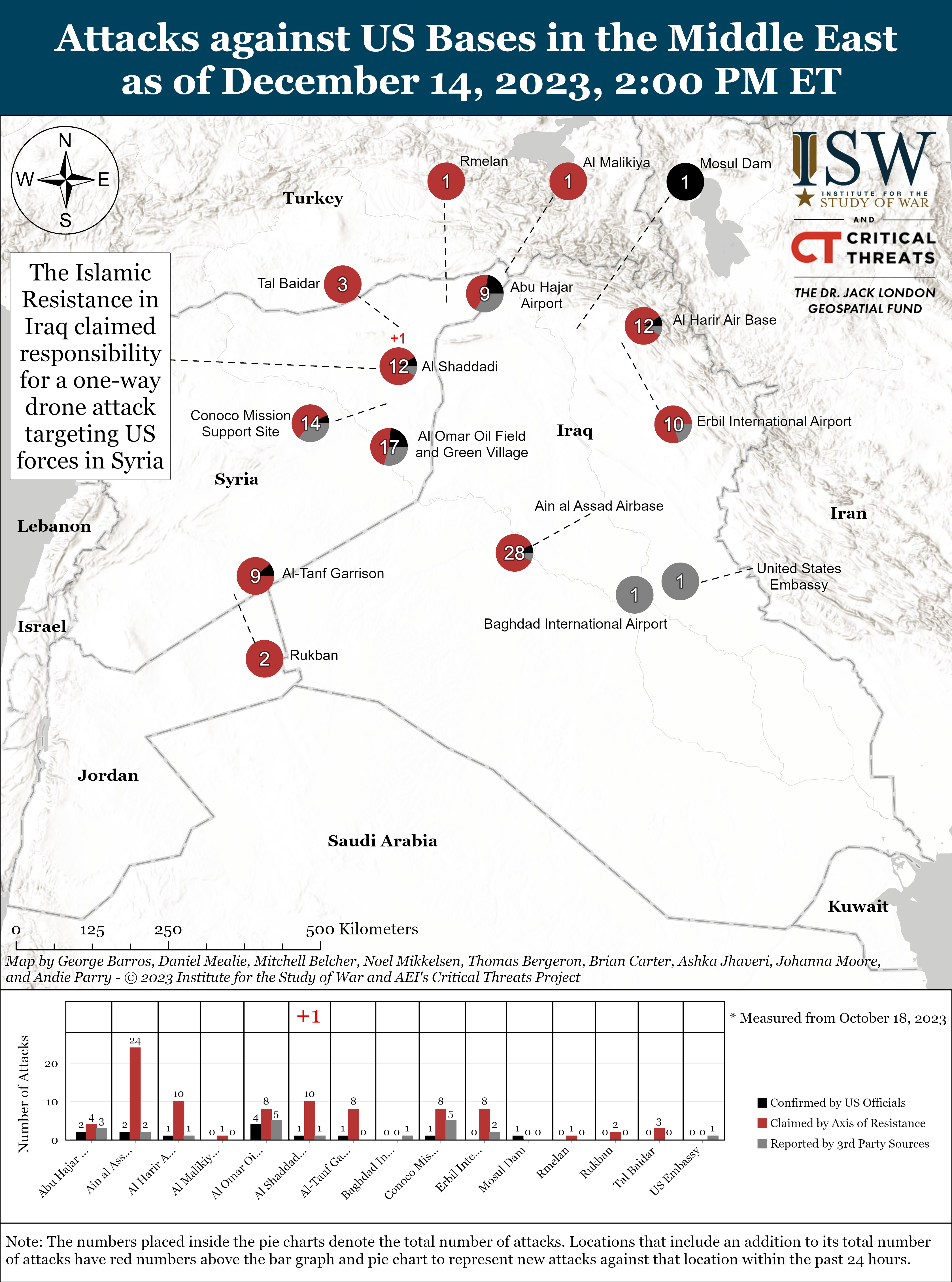 The Islamic Resistance in Iraq—a coalition of Iranian-backed Iraqi militias—claimed responsibility for a one-way drone attack targeting US forces in Syria on December 14.[49] The group claimed that it targeted US forces at al Shaddadi, Hasakah Province, Syria. The group has claimed 11 previous attacks on al Shaddadi since the Israel-Hamas war began.