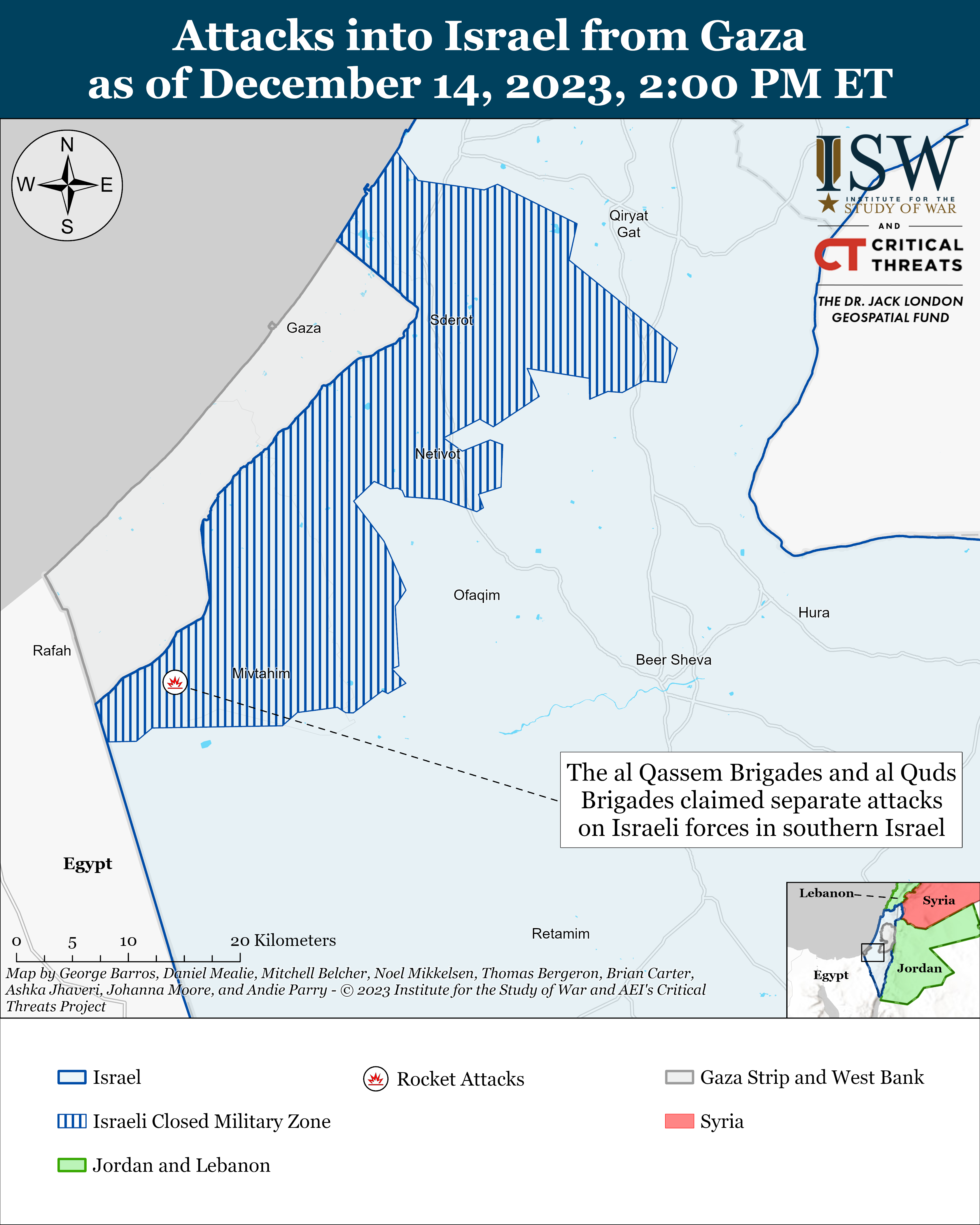 Palestinian militias conducted two indirect fire attacks from the Gaza Strip into Israel on December 14. The al Qassem Brigades and al Quds Brigades both claimed responsibility for separate attacks on Sufa in southern Israel.[35] The IDF reported on December 13 that Hamas has fired 116 rockets from the Israeli-declared al Mawasi humanitarian zone in southern the Gaza Strip into Israel.[36]