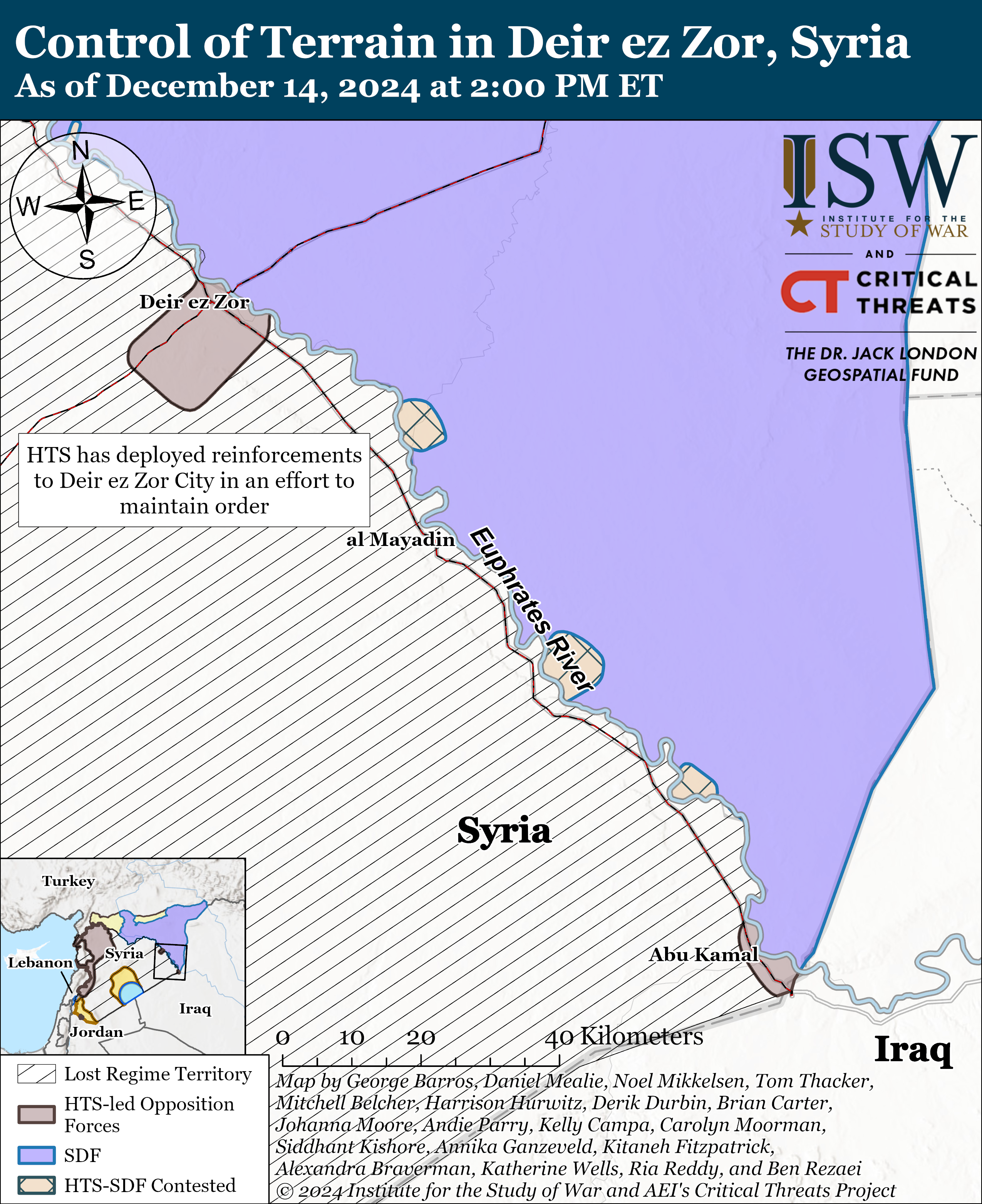 Hayat Tahrir al Sham (HTS) leader Abu Mohammed al Jolani is consolidating political and security power under HTS in a post-Assad Syrian government. HTS-led forces assumed control of Daraa City and the Nassib border crossing from the Southern Operations Room on December 14.[1] Jolani and Southern Operations Room leaders met on December 11 to discuss coordination in military and civil affairs.[2] It is notable that these Syrian groups have agreed to cooperate with HTS despite historical animosity with HTS’s predecessor and al Qaeda affiliate Jabhat al Nusra in the mid-2010s.[3]