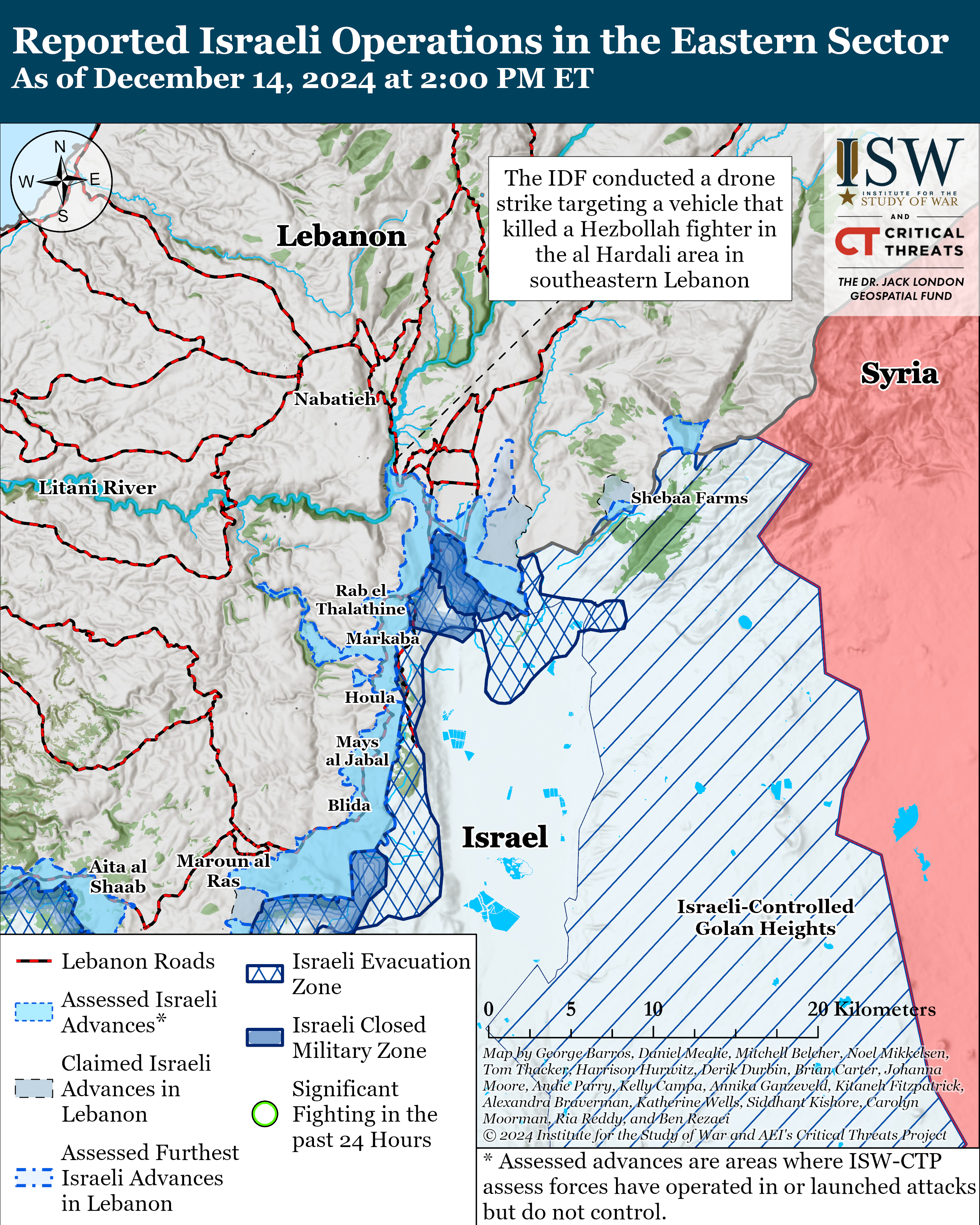 The IDF conducted a drone strike targeting a vehicle that killed a Hezbollah fighter in the al Hardali area in southeastern Lebanon, on December 14.[70]