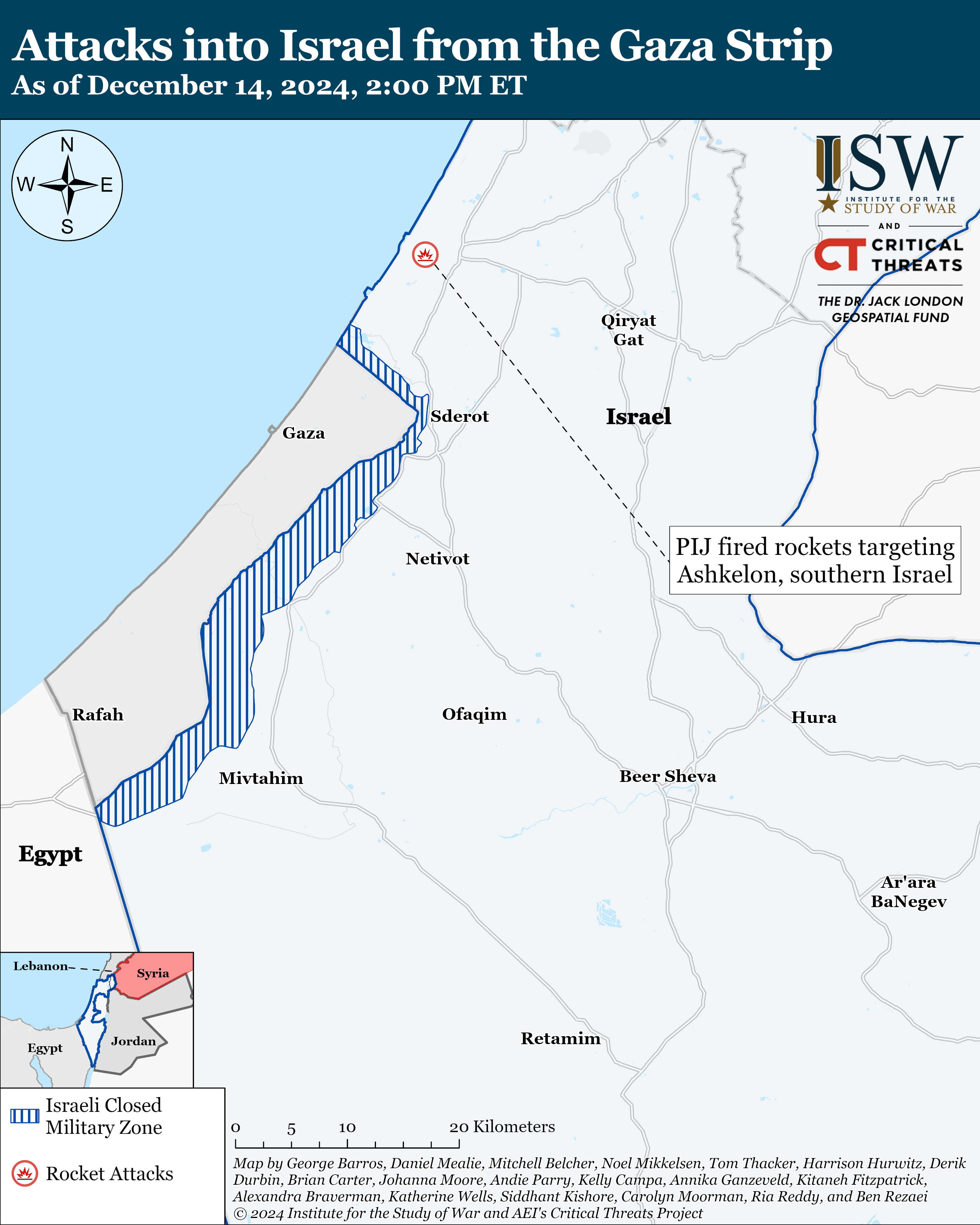 The Palestinian Islamic Jihad (PIJ) fired rockets targeting Ashkelon, southern Israel on December 13.[54] The IDF intercepted two rockets fired from the central Gaza Strip.[55] The IDF conducted retaliatory airstrikes targeting the launch site and destroyed it.[56] The IDF located PIJ rocket launchers 50 meters away from a humanitarian aid storage facility. The airstrikes also killed an unspecified number of Palestinian militia fighters, according to the IDF. The IDF issued an evacuation order for areas northeast of Jabalia in the northern Gaza Strip before conducting the airstrikes.[57] The order requested Gazans to immediately evacuate to the IDF-designated humanitarian zone in Gaza City.[58] The IDF separately detected an unspecified projectile launched from the central Gaza Strip on December 14 that fell in an open area in southern Israel.[59]