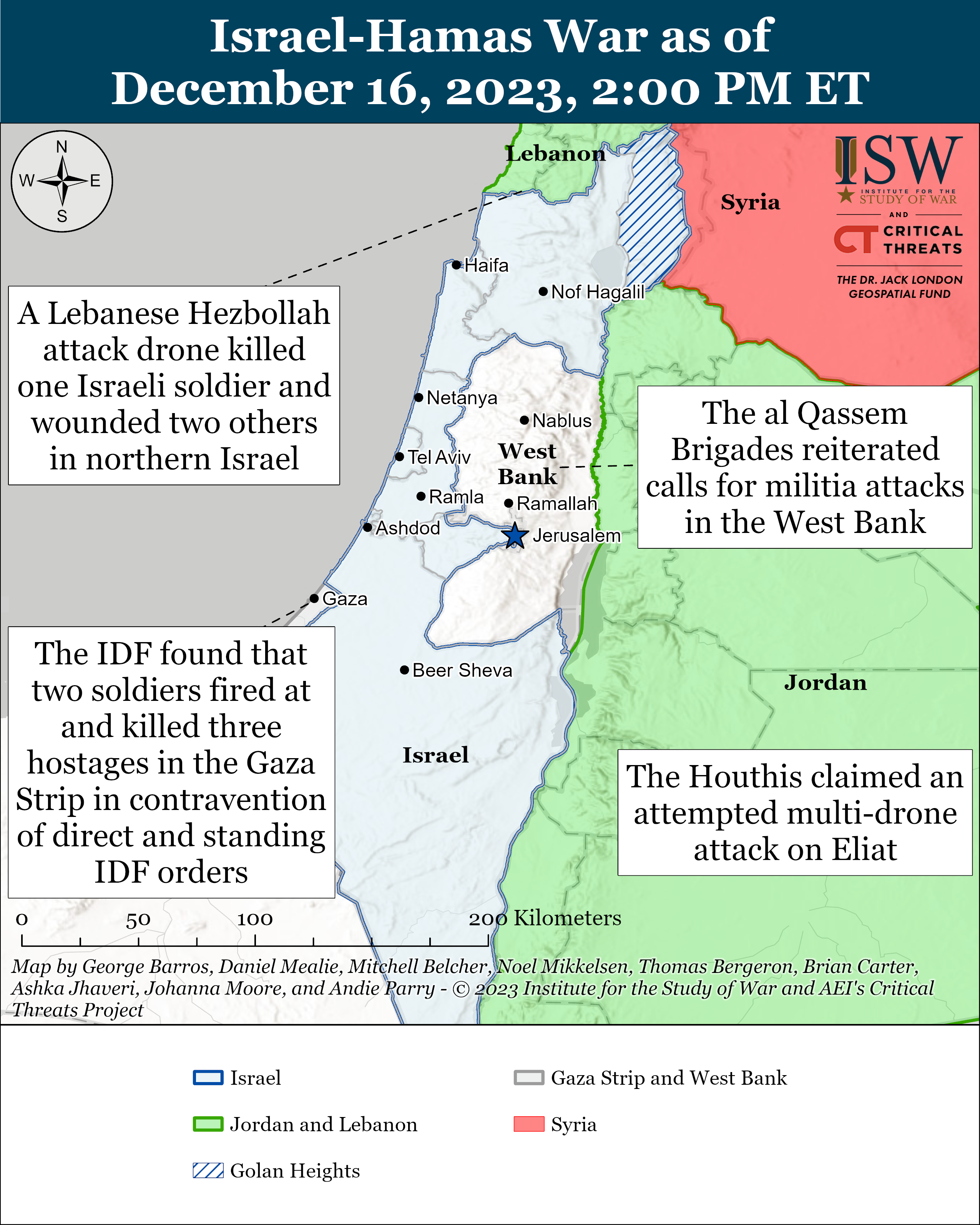 Hamas fighters are attacking IDF units near Juhor ad Dik likely from Hamas’ relative safe haven in the Gaza Strip’s Central Governorate. Multiple Hamas fighters raided the IDF’s combat outpost near Juhor ad Dik on December 16. The group claimed that it killed ten Israelis and posted a video showing its fighters, killing one IDF soldier.[11] Hamas and other Palestinian militias have conducted three raids against an IDF outpost in the Juhor ad Dik area since December 3, which suggests Hamas and other Palestinian fighters are using the central Gaza Strip to launch operations against Israeli forces near Juhor ad Dik.[12] The IDF has not conducted clearing operations in the central Gaza Strip, and CTP-ISW has previously assessed that all four Hamas battalions in the central Gaza Strip remain combat effective.[13] Both the al Qassem Brigades–Hamas’ militant wing–and the al Quds Brigades–Palestinian Islamic Jihad (PIJ)’s military wing–shelled Israeli positions near Juhor ad Dik on December 16.[14]