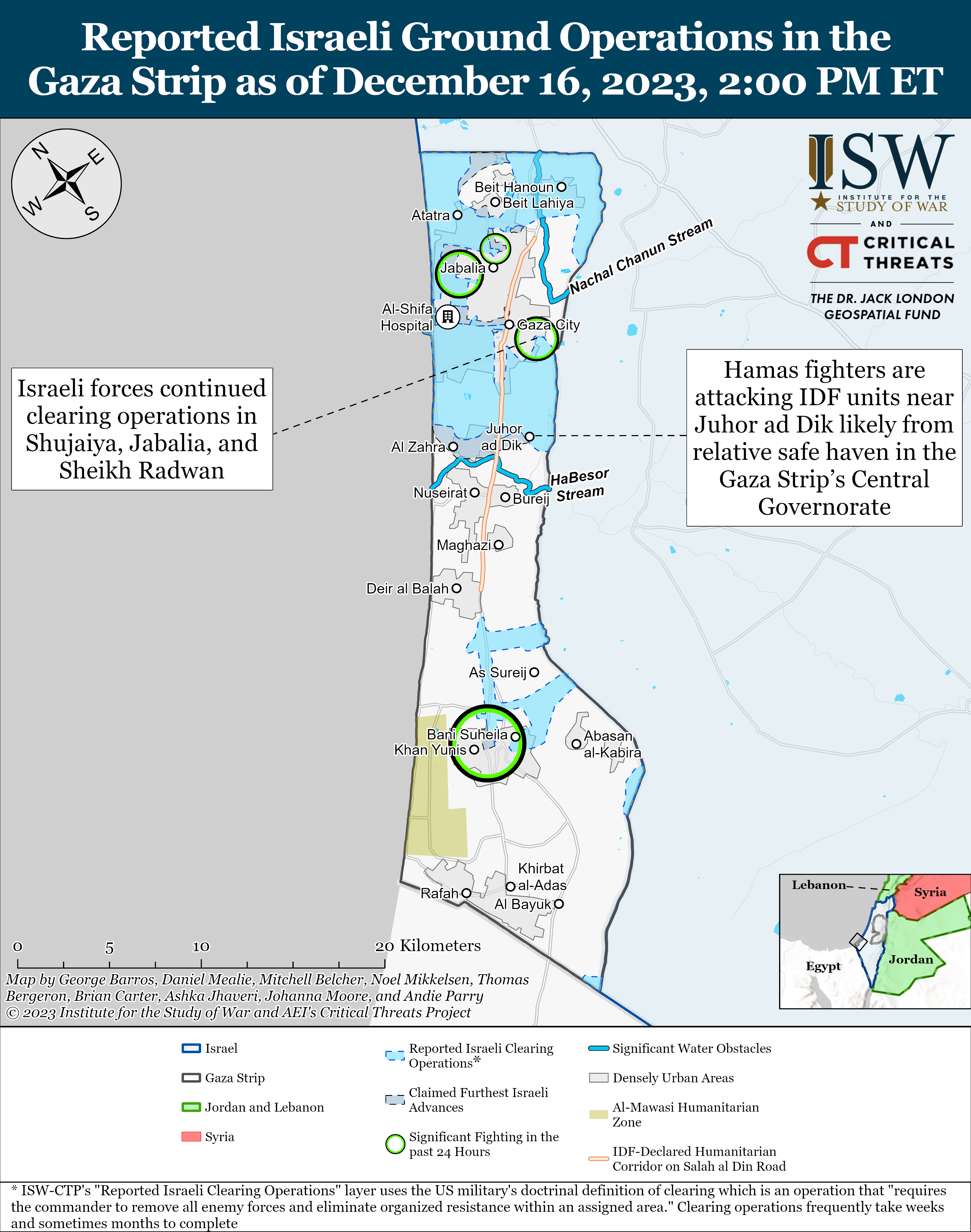 Israeli forces continued clearing operations in Shujaiya, Jabalia, and Sheikh Radwan on December 16. Israeli forces finished clearing the Kamal Adwan Hospital in Jabalia on December 16. The IDF said that Hamas used the hospital as a military compound.[15] The IDF recovered RPGs, explosives, and intelligence material. Israeli forces also detained 90 fighters in the area. Palestinian fighters continued to attack Israeli forces in Jabalia with small arms and anti-tank rockets.[16] Hamas published a video showing a dead Israeli working dog in a Hamas tunnel in Sheikh Radwan on December 15. The group has continued to attack Israeli forces with rocket-propelled grenades, thermobaric rockets, and small arms in Sheikh Radwan.[17] The commander of the 188th Brigade said that his brigade destroyed Hamas infrastructure and that it is currently clearing Shujaiya in a statement on December 16.[18] Unspecified Palestinian fighters fired at 188th Brigade soldiers from a tunnel shaft near a school on Shujaiya. The IDF destroyed the tunnel shaft in response.[19]