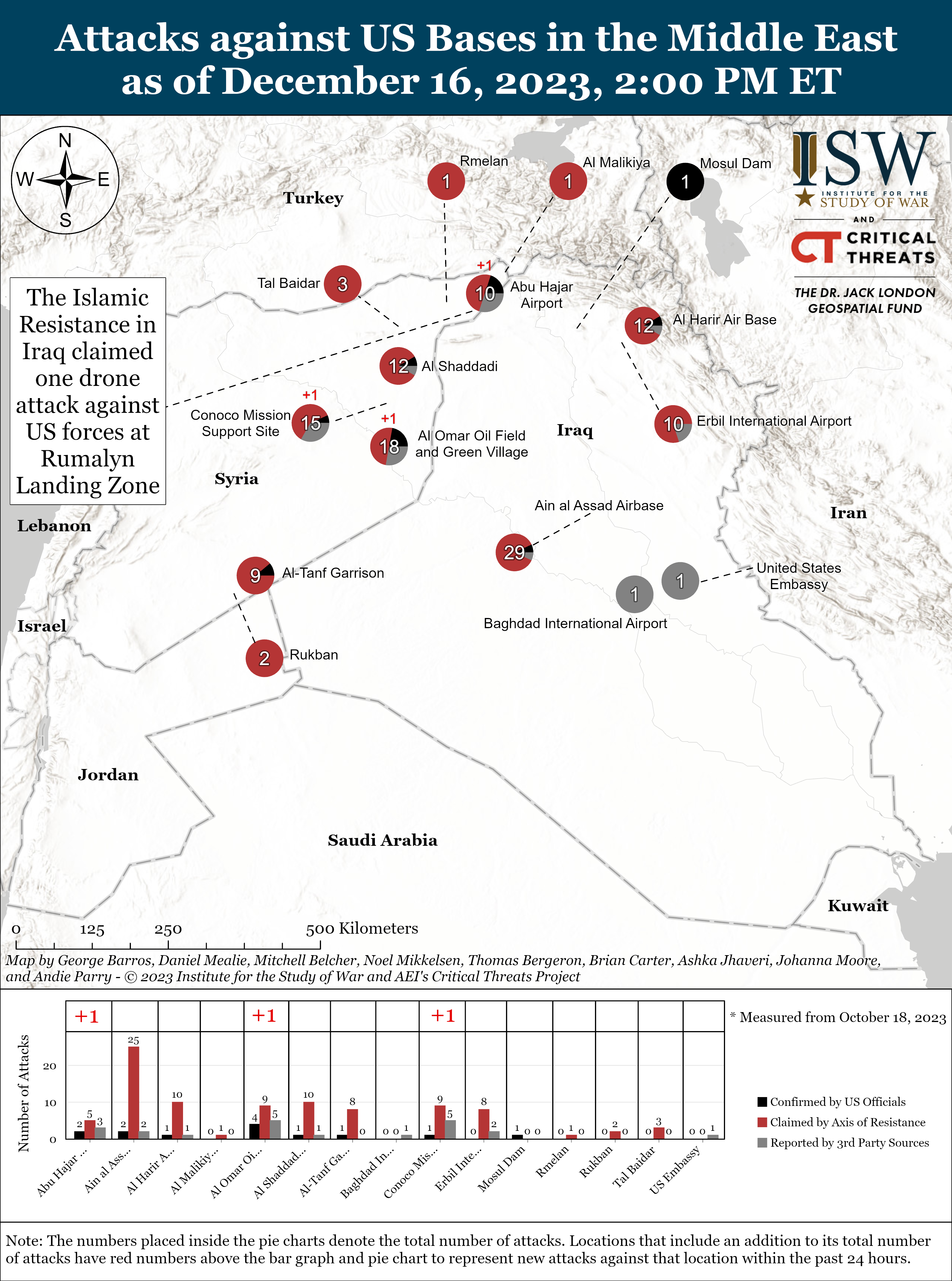 The Islamic Resistance in Iraq—a coalition of Iranian-backed Iraqi militias—claimed responsibility for three attacks against US forces in Syria on December 16.[63] The Islamic Resistance in Iraq claimed a single drone attack against US forces at the Rumalyn Landing Zone in Hasakah Province, Syria. The group has claimed at least five attacks on Rumalyn Landing Zone since the start of the Israel-Hamas war. The Islamic Resistance in Iraq claimed a single drone attack against US forces at US base Conoco Mission Support Site in northeastern Syria. The group has claimed at least 13 attacks on Conoco since the start of the war. The Islamic Resistance in Iraq claimed a single drone attack against US forces at al Omar oil field. The group has claimed at least four attacks on al Omar since the start of the war.