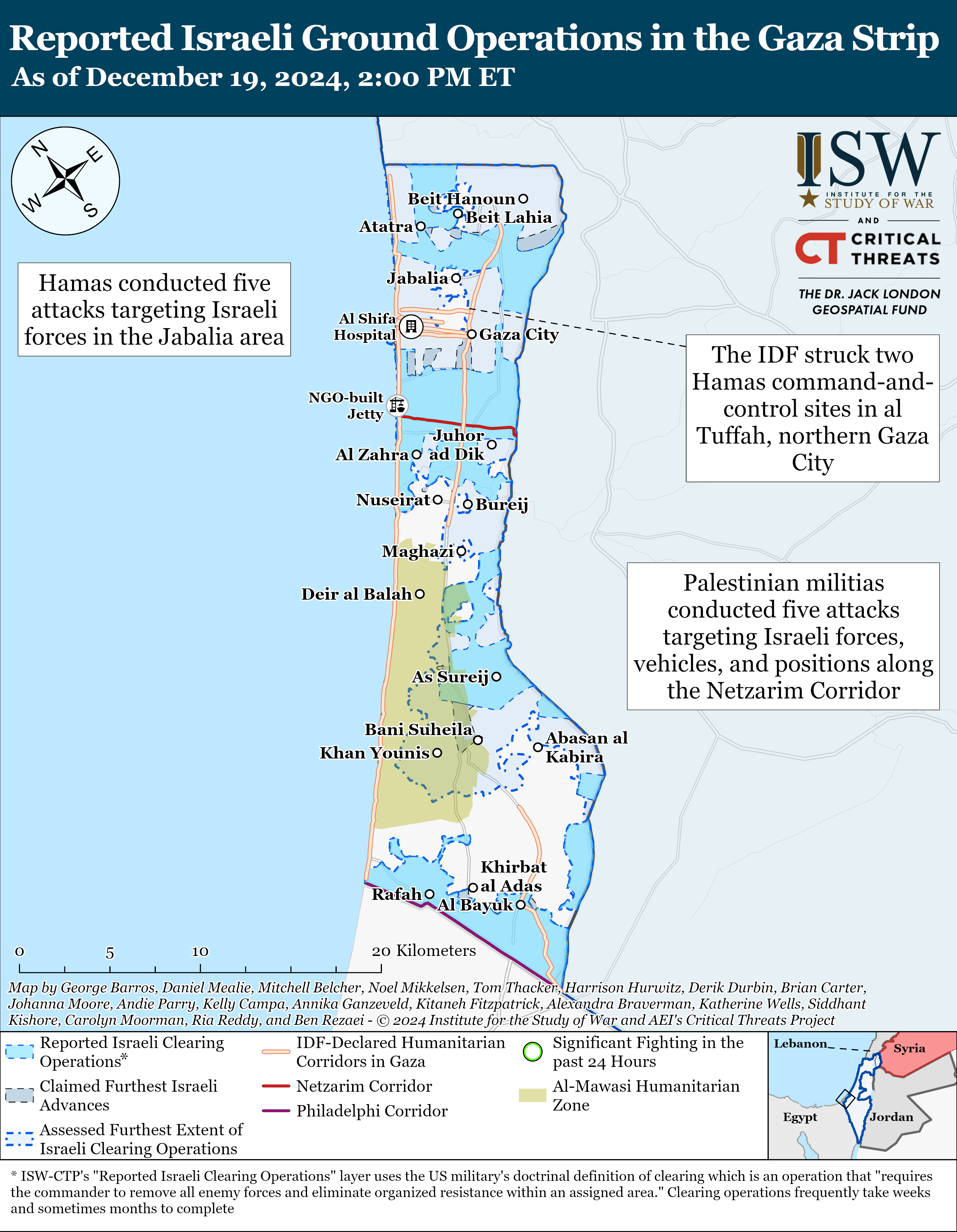 Hamas has conducted five attacks targeting Israeli forces in Jabalia in the northern Gaza Strip since CTP-ISW’s last data cutoff on December 18.[38] Hamas claimed that one of its fighters stabbed an IDF officer and three soldiers in the Jabalia refugee camp on December 19.[39] The IDF has not corroborated the Hamas claim at the time of writing.