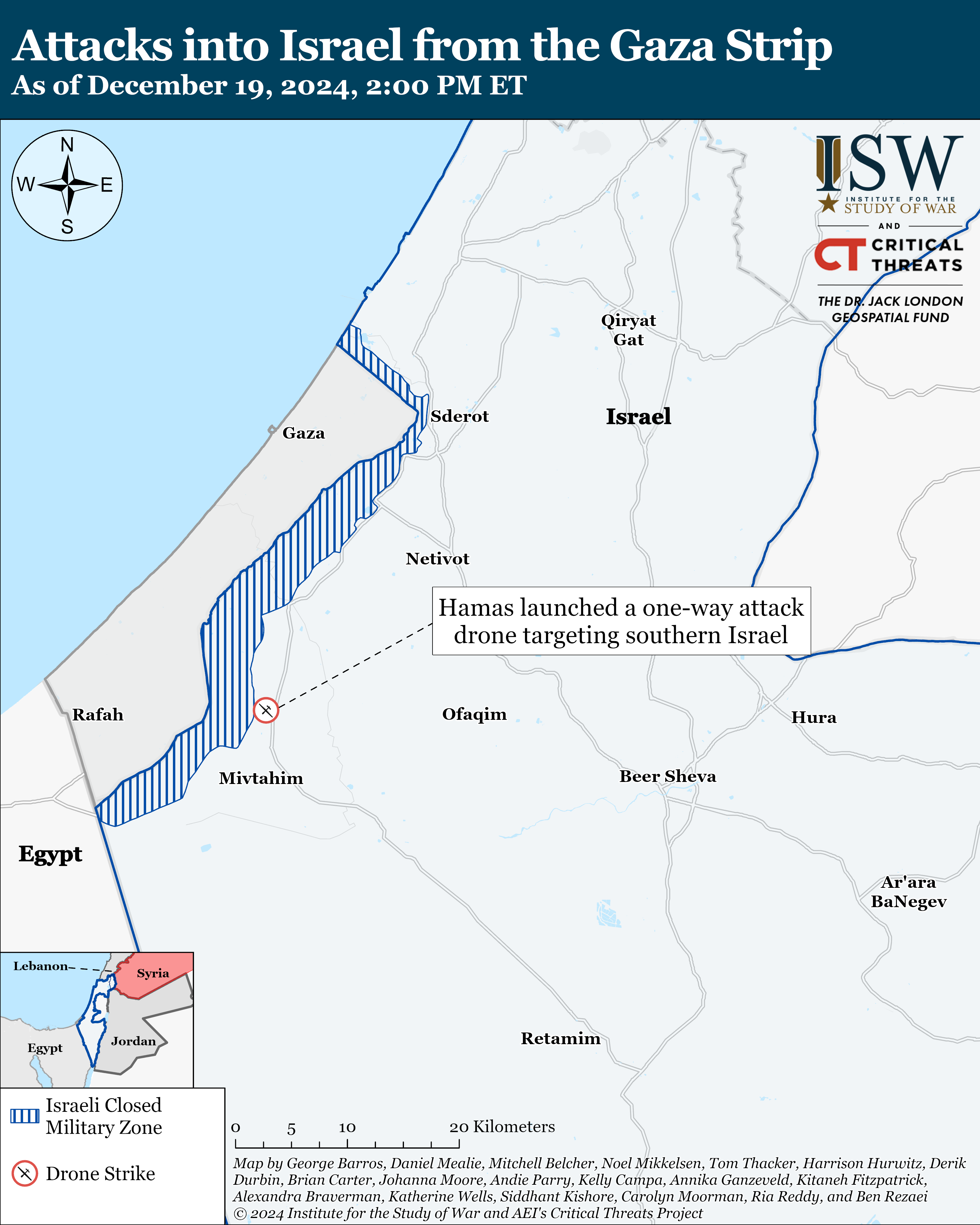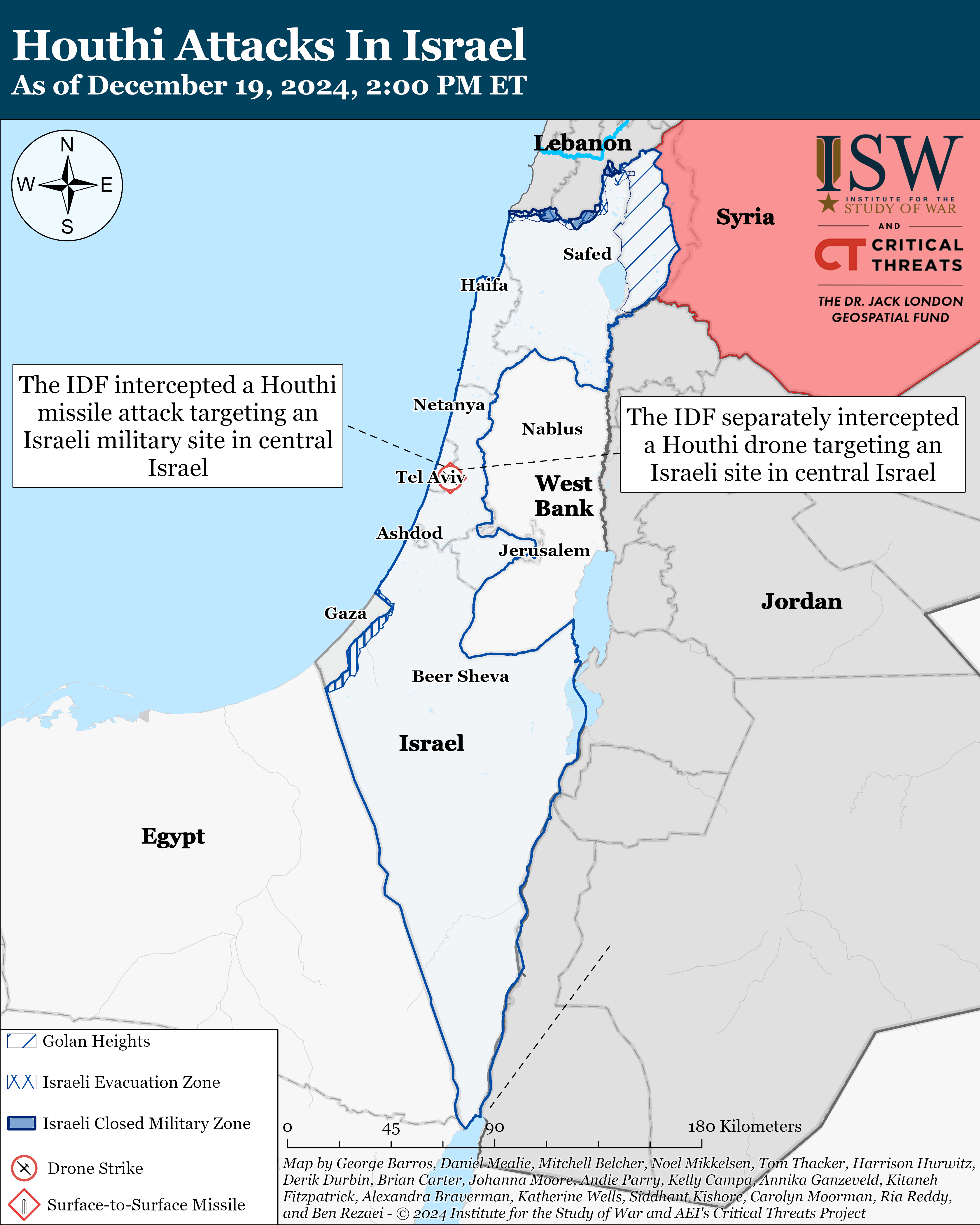 The Houthis have conducted two attacks targeting Israel since CTP-ISW’s last data cutoff on December 18. The Houthis conducted a ballistic missile attack targeting two “specific and sensitive” Israeli military targets in the Tel Aviv-Jaffa area in central Israel on December 18.[31] The Houthis conducted this attack at the same time that the IDF conducted airstrikes targeting infrastructure in Houthi-controlled areas of Yemen..[32] Houthi Supreme Leader Abdulmalik al Houthi claimed on December 19 that one of the missile attacks targeted the Israeli Defense Ministry.[33] The IDF intercepted a Houthi missile before it entered Israeli territory on December 18.[34] Shrapnel from a Houthi missile damaged a school building near Tel Aviv.[35] The Houthis separately claimed a drone attack targeting the Tel Aviv-Jaffa area on December 19.[36] The IDF intercepted ”a suspicious aerial target” over the Mediterranean Sea before it entered Israeli territory on December 19.[37]