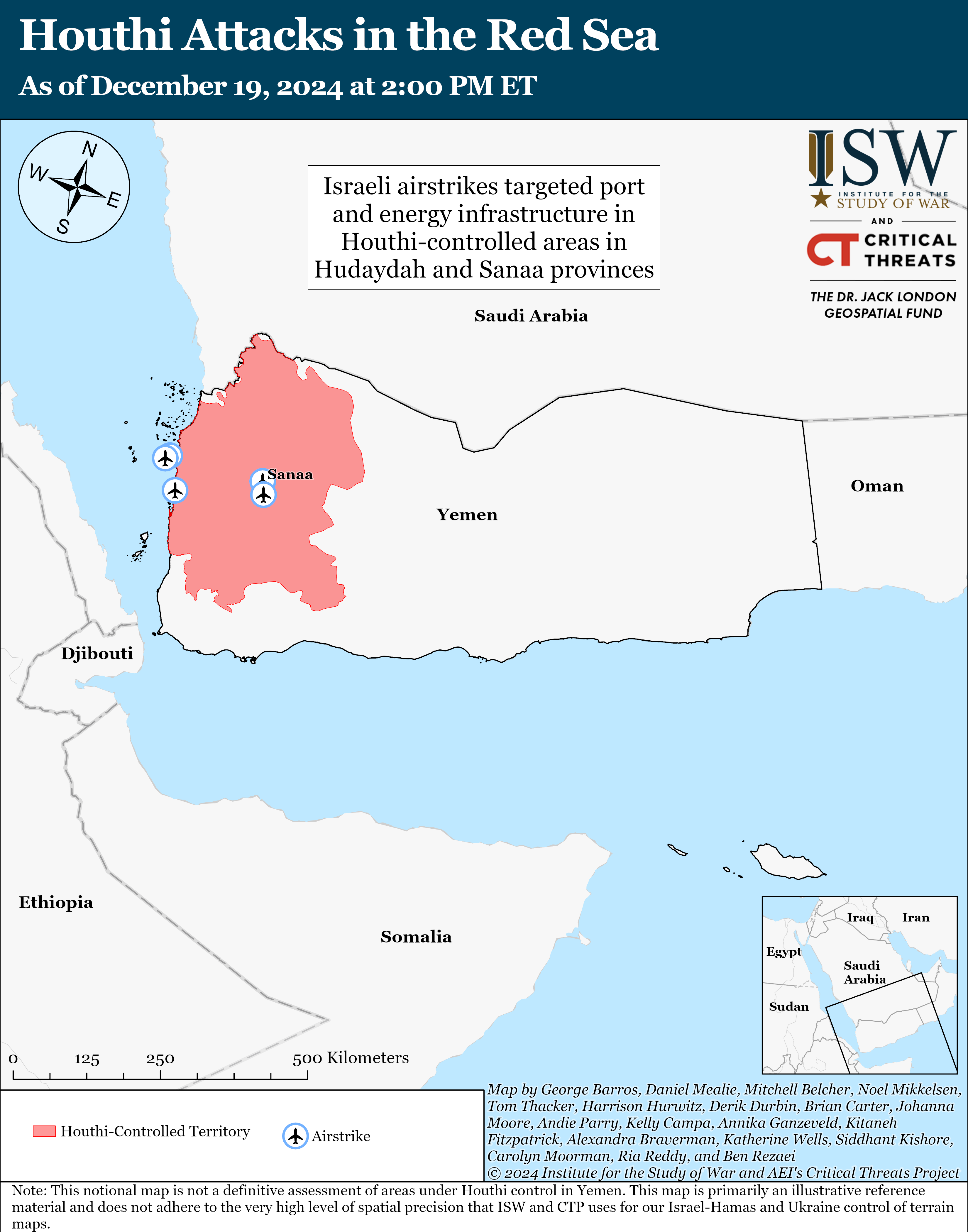 The IDF conducted two waves of airstrikes targeting port and energy infrastructure in Houthi-controlled areas of Yemen on December 18.[25] Fourteen IDF Air Force aircraft conducted the strikes in Hudaydah and Sanaa provinces as part of a plan that the IDF made several weeks ago in response to persistent Houthi drone and missile attacks on Israel.[26] The IDF targeted six tugboats in the Hudaydah and Salif ports, and the Ras Issa Oil Refinery, on the western coast of Yemen.[27] The IDF also targeted the Dhabhan and Heyzaz power stations in Sanaa.[28] The power stations sustained minimal damage, and the Houthis have reportedly restored power to Sanaa.[29] The IDF previously attacked infrastructure in Hudaydah Port in July 2024 to disrupt Iranian weapons shipments to the Houthis.[30] The Houthis will likely continue to conduct drone and missile attacks targeting Israel given that these strikes do not appear to have disrupted the Houthis’ ability to do so.