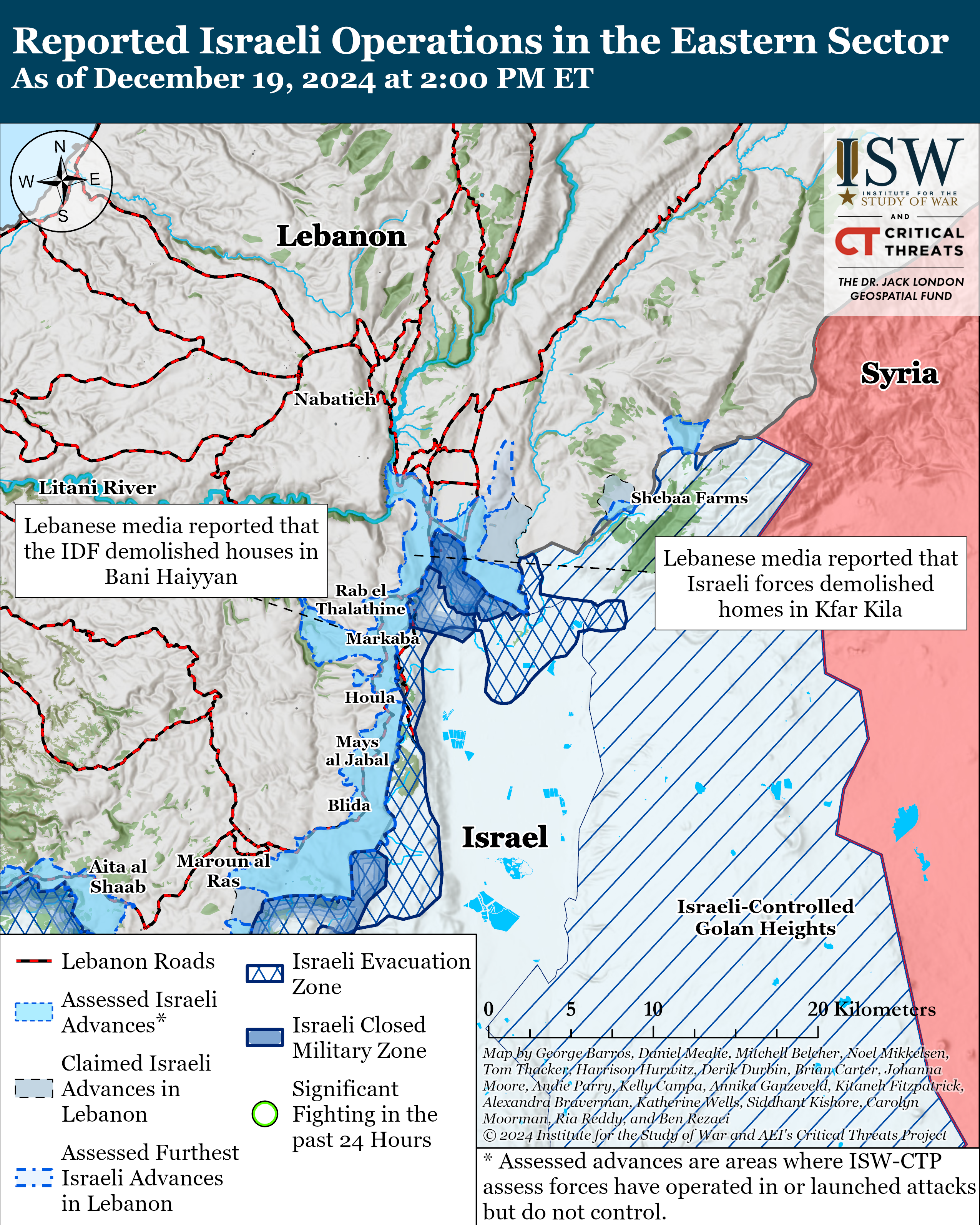 Lebanese media reported that Israeli forces continued to demolish houses and detonate unspecified infrastructure in Bani Haiyyan, southeastern Lebanon, on December 19.[58] Lebanese media reported that Israeli tanks and bulldozers advanced further into Bani Haiyyan.[59] Geolocated footage posted on December 18 showed IDF bulldozers operating near a mosque in Bani Haiyyan.[60]