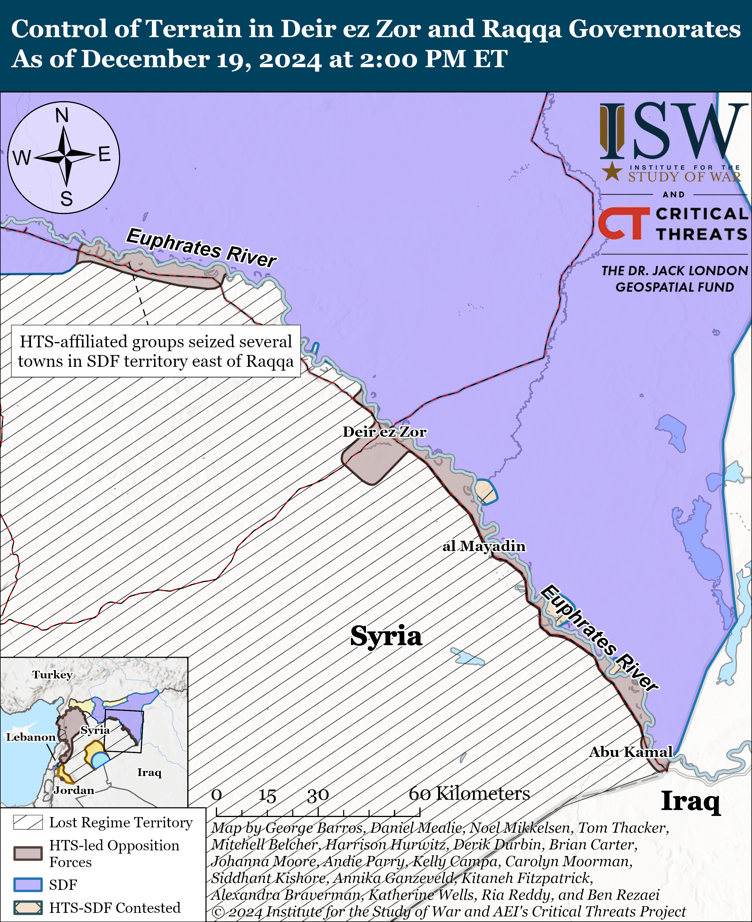 Turkey and Hayat Tahrir al Sham (HTS) are attempting to coerce the Syrian Democratic Forces (SDF) to disarm and integrate into the HTS-led armed forces by threatening the SDF with a full-scale assault against SDF-held areas. Turkey massed forces on the Turkey-Syria border, dismantled the Kobani-Turkey border wall, and increased drone attacks in the Manbij countryside ahead of a potential Turkish invasion into Syria.[1] Turkish Foreign Minister Hakan Fidan stated that Turkey will not need to intervene in Syria if HTS addresses its concerns with the SDF “properly.”[2] Fidan added on December 13 that Turkey’s strategic objective is to “eliminate” the SDF.[3] HTS has called for a unified Syrian state without federal regions, which is an implicit demand for the SDF to disarm and cease to exist as an autonomous organization, consistent with Turkish demands.[4] Unrest, defections, and Turkey’s potential assault pose existential threats to the SDF.[5] Turkey’s offer nominally presents the opportunity for the SDF to avoid a full-scale war but would ultimately still result in the elimination of the SDF.