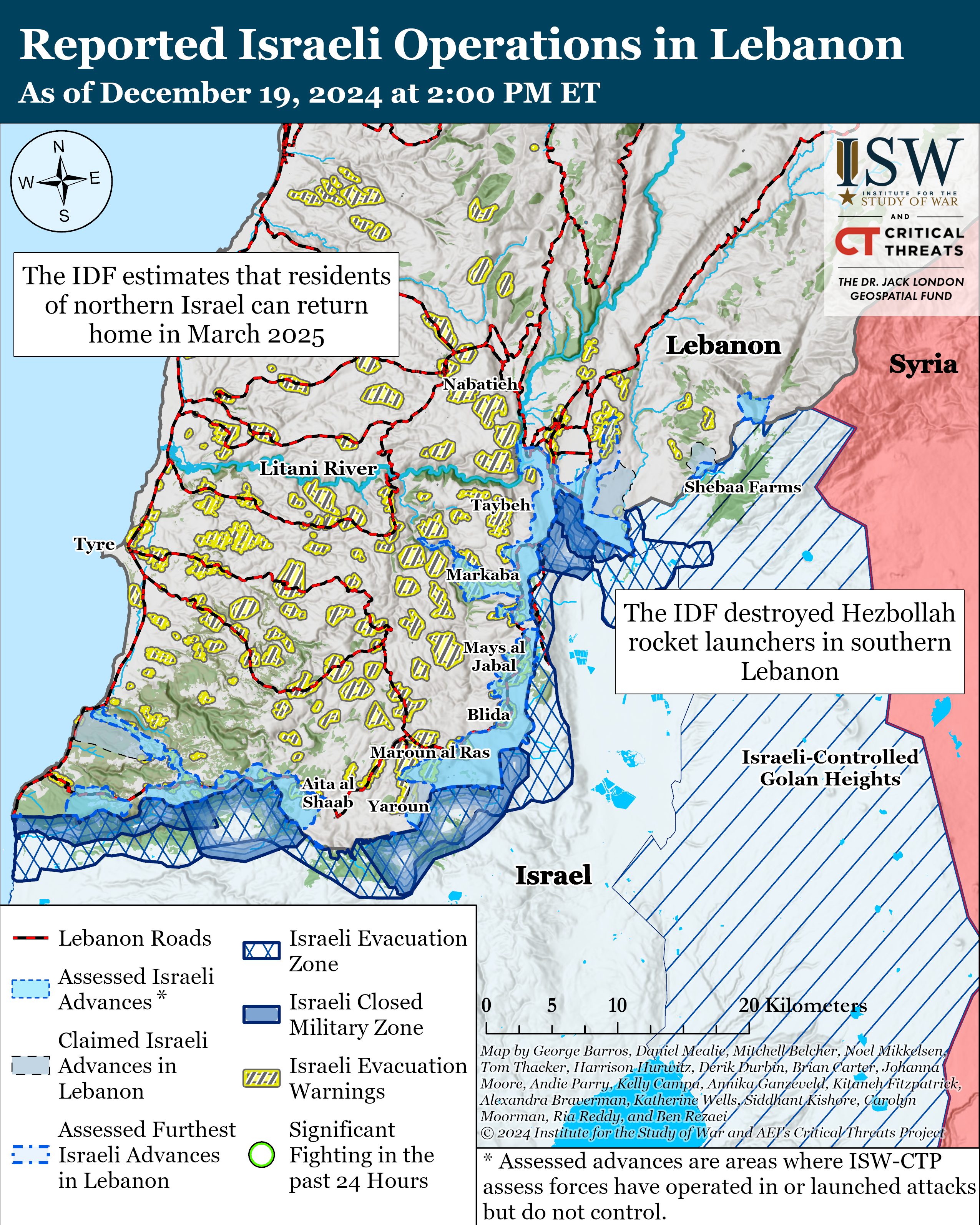 The IDF 300th Territorial Brigade (146th Division) continued to operate in southern Lebanon on December 19.[65] Israeli forces destroyed several Hezbollah rocket launchers aimed at Israeli territory.[66] Israeli forces also destroyed a weapons depot, anti-tank missiles, and an artillery cannon.[67] The IDF reiterated its commitment to the Israel-Hezbollah ceasefire, which permits the IDF to operate in southern Lebanon until the end of January 2025.[68]