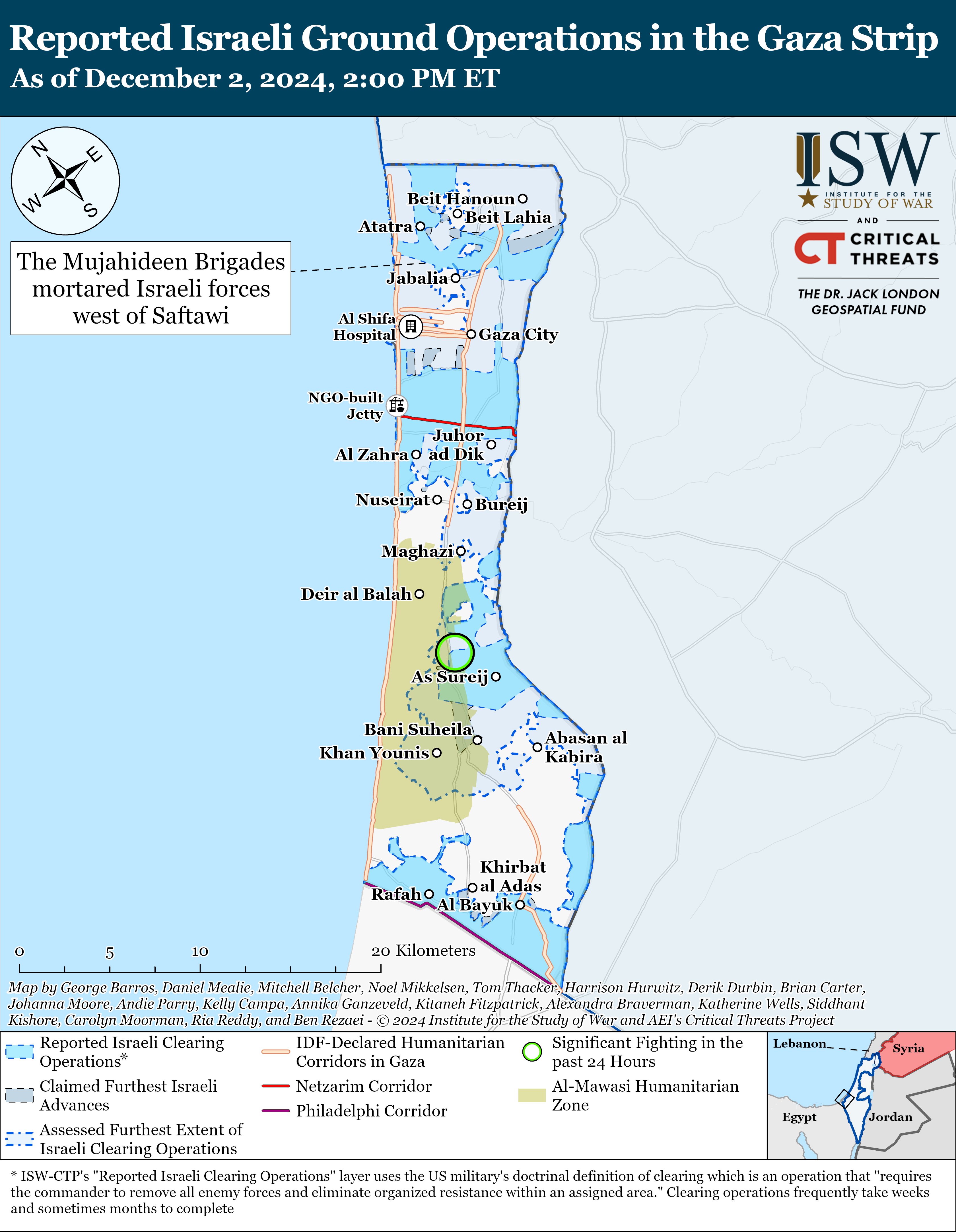 The IDF 162nd Division continued clearing operations in the northern Gaza Strip on December 2. The 900th Infantry Brigade killed Palestinian militia fighters and destroyed IEDs in Jabalia and Beit Lahia.[57] Israeli forces located multiple buildings that stored large quantities of weapons in Beit Lahia.[58] A Palestinian journalist reported Israeli gunfire in Saftawi, northern Gaza Strip on December 1.[59] The Mujahideen Brigades mortared Israeli personnel west of Saftawi on December 2.[60]