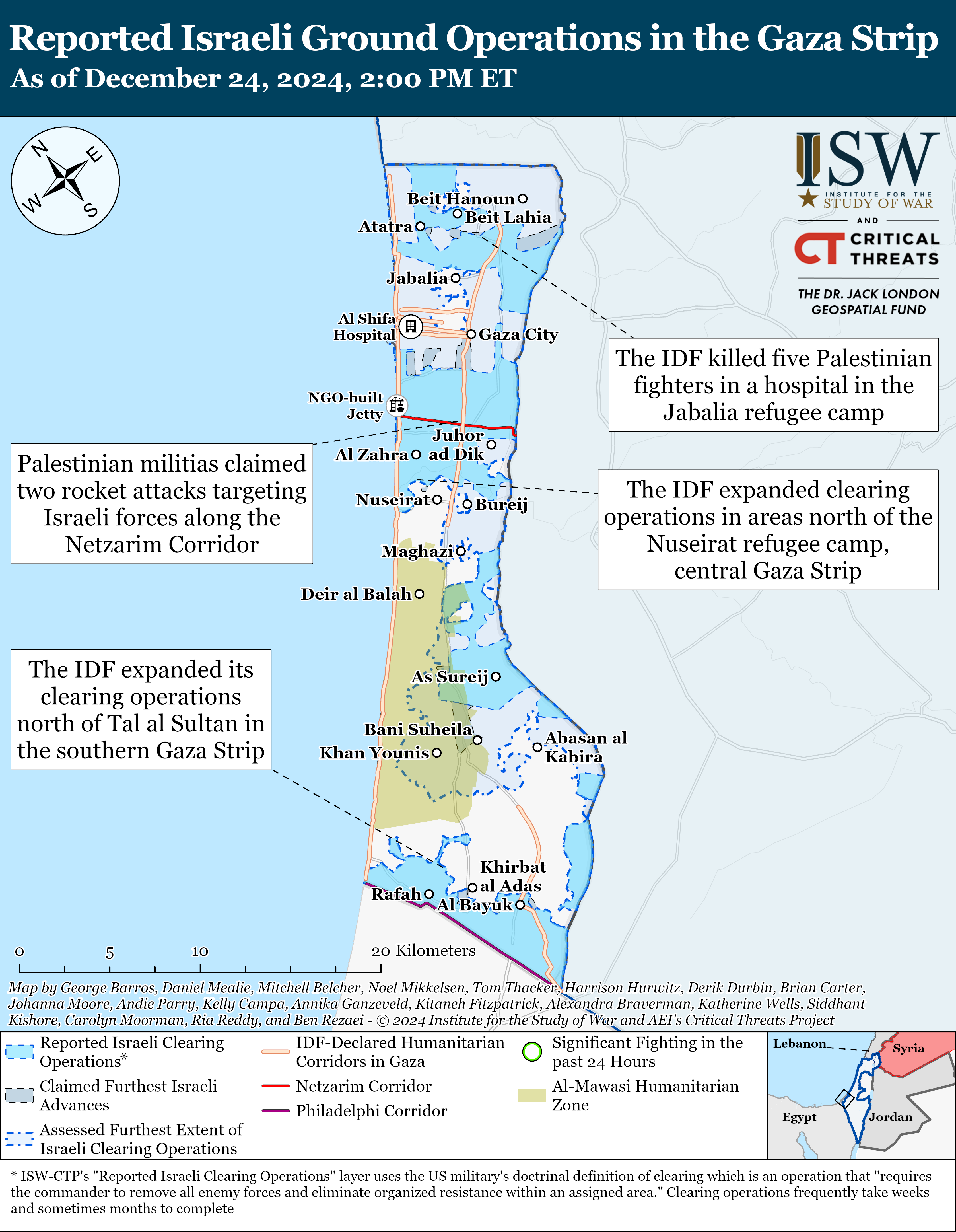 Click here to see CTP and ISW’s interactive map of Israeli ground operations, and here to see CTP and ISW’s interactive map of the ongoing opposition offensive in Syria. These maps are updated daily alongside the static maps present in this report.