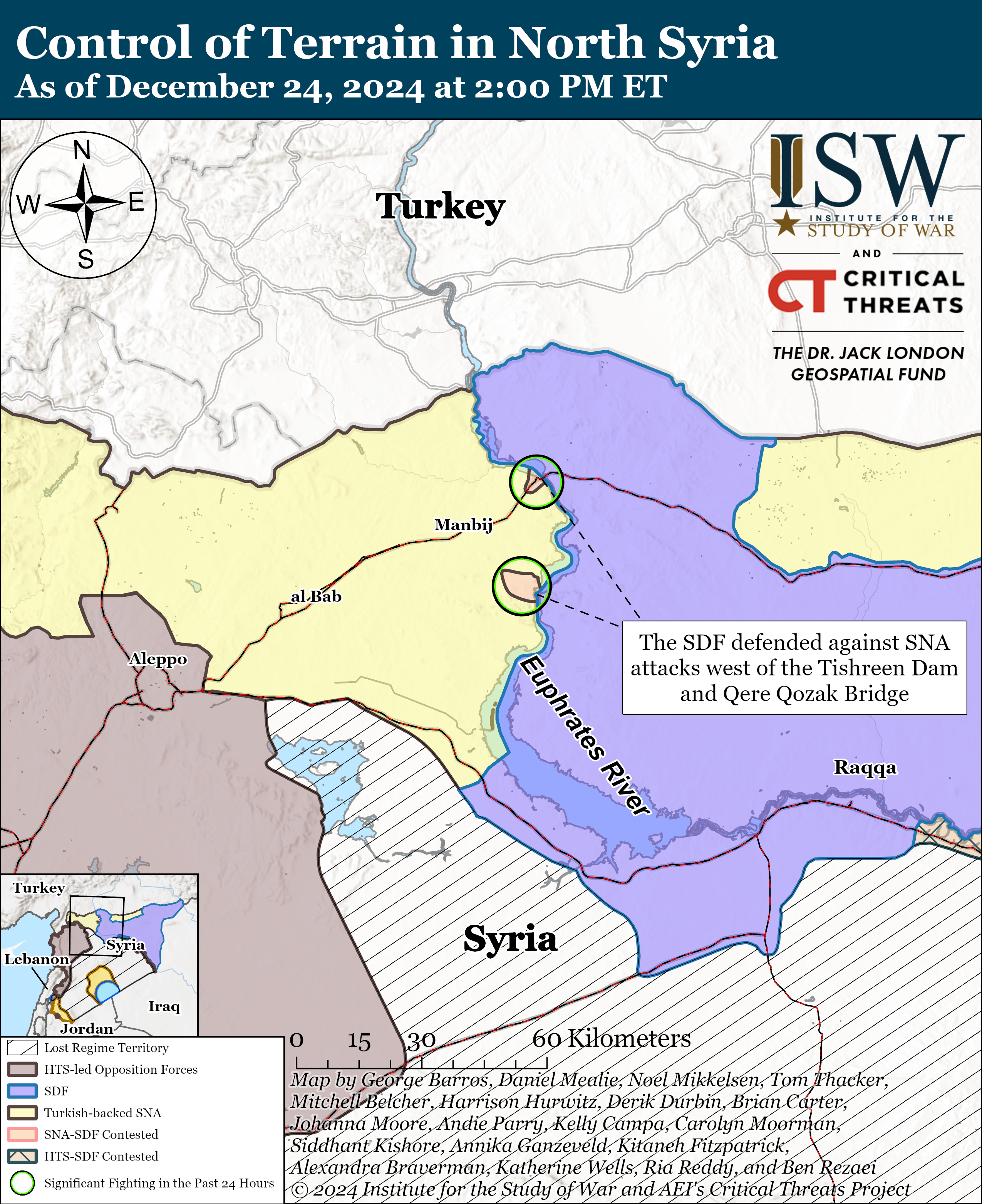 - Syrian Democratic Forces: The US-backed Syrian Democratic Forces (SDF) defended against Turkish-backed Syrian National Army (SNA) attempts to recapture SDF-held ground on the west bank of the Euphrates River near the Tishreen Dam and Qere Qozak Bridge.