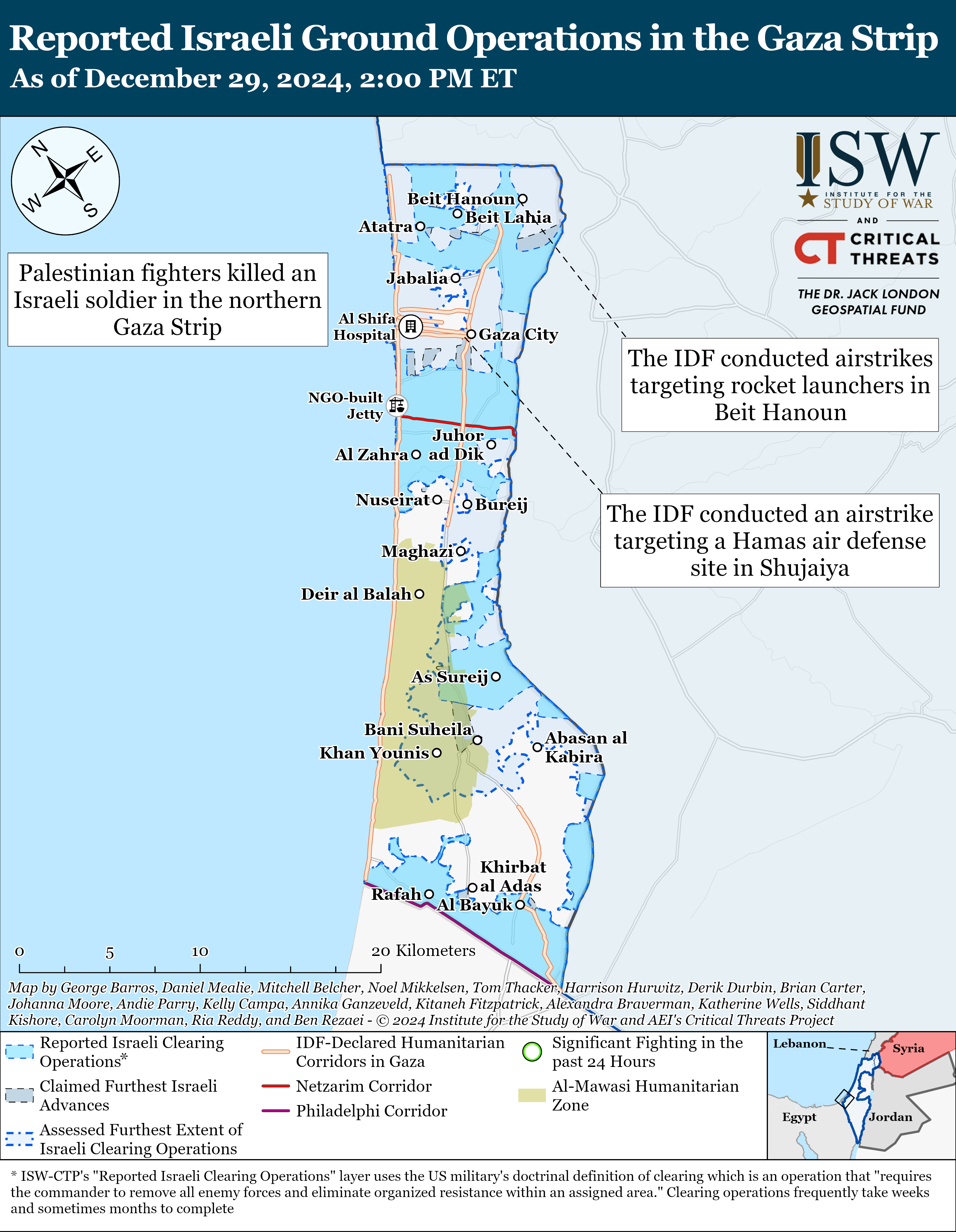 The IDF continued to operate in the northern Gaza Strip on December 29. Palestinian fighters killed a solider in the IDF 401st Armored Brigade (162nd Division) in the northern Gaza Strip.[30] A soldier in the IDF 933rd Infantry Brigade (143rd Division) was seriously injured while fighting Hamas in Beit Hanoun as well.[31] The IDF 933rd Infantry Brigade started operating in Beit Hanoun on December 28.[32] Commercially available satellite imagery from December 29 showed the IDF conducting clearing operations in Beit Lahia. Palestinian Islamic Jihad (PIJ) claimed that it attacked the IDF west of Beit Hanoun.[33] Several Palestinian militias, including Hamas, attacked the IDF east of Jabalia refugee camp.[34]