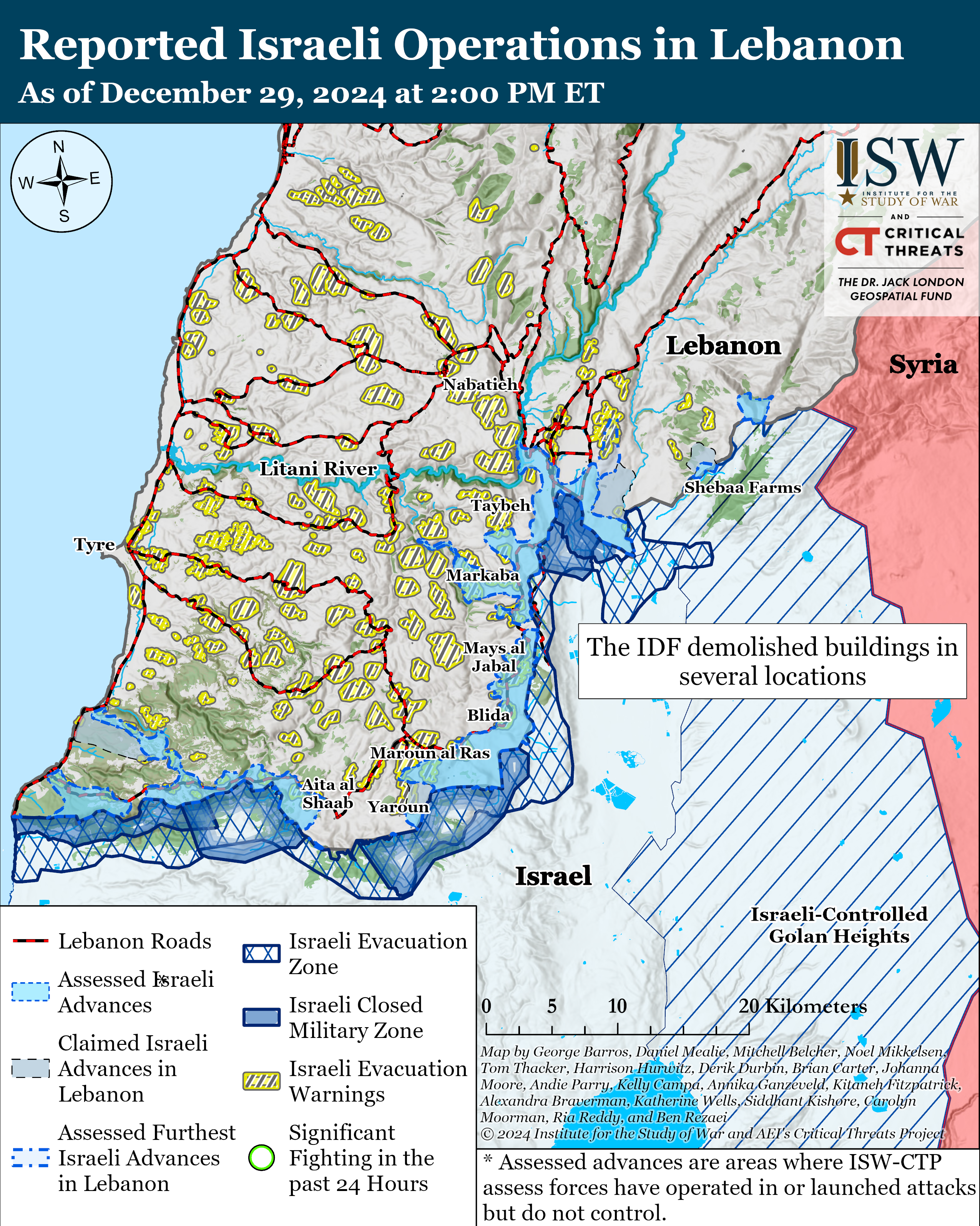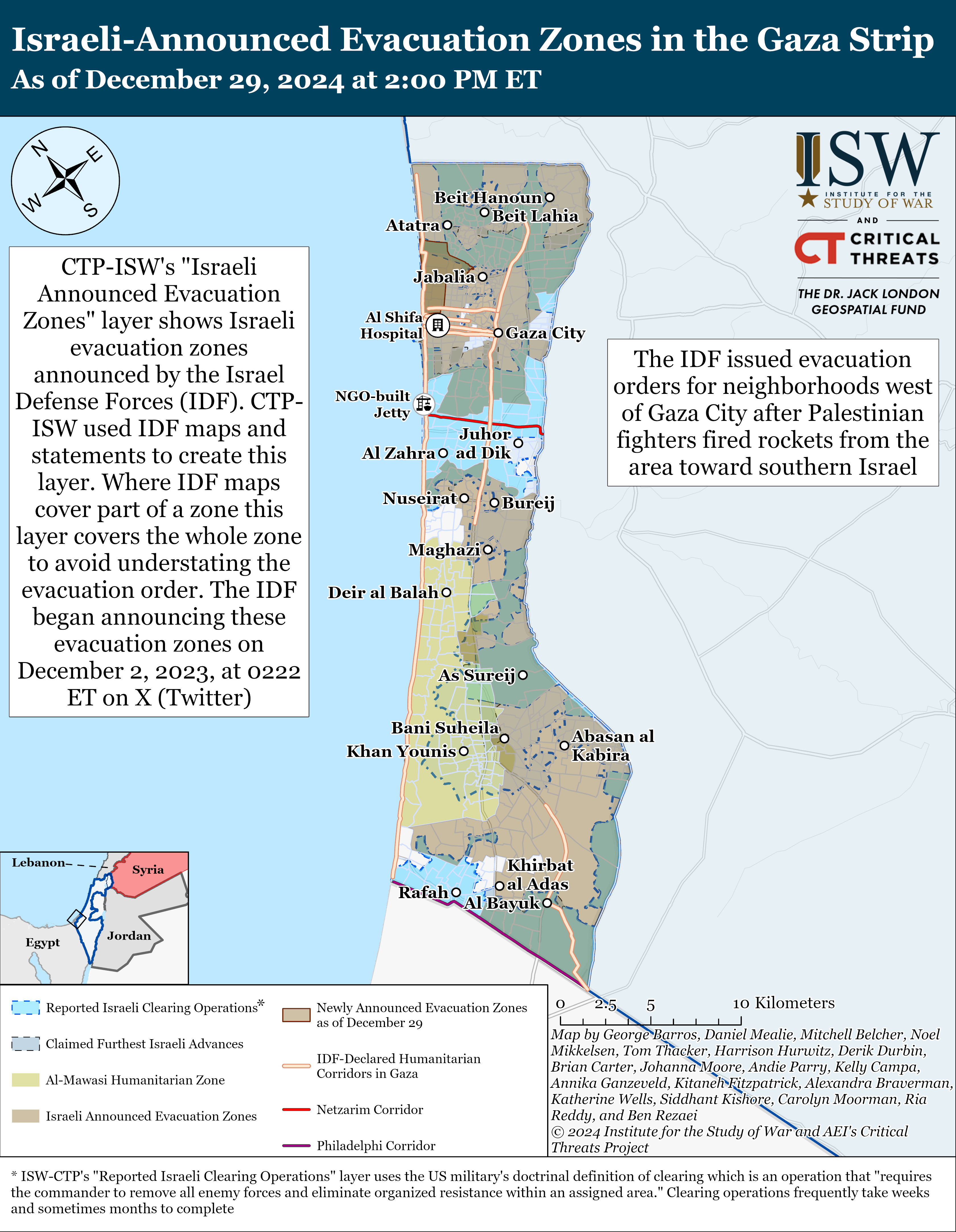 Click here to see CTP and ISW’s interactive map of Israeli ground operations, and here to see CTP and ISW’s interactive map of the ongoing opposition offensive in Syria. These maps are updated daily alongside the static maps present in this report.