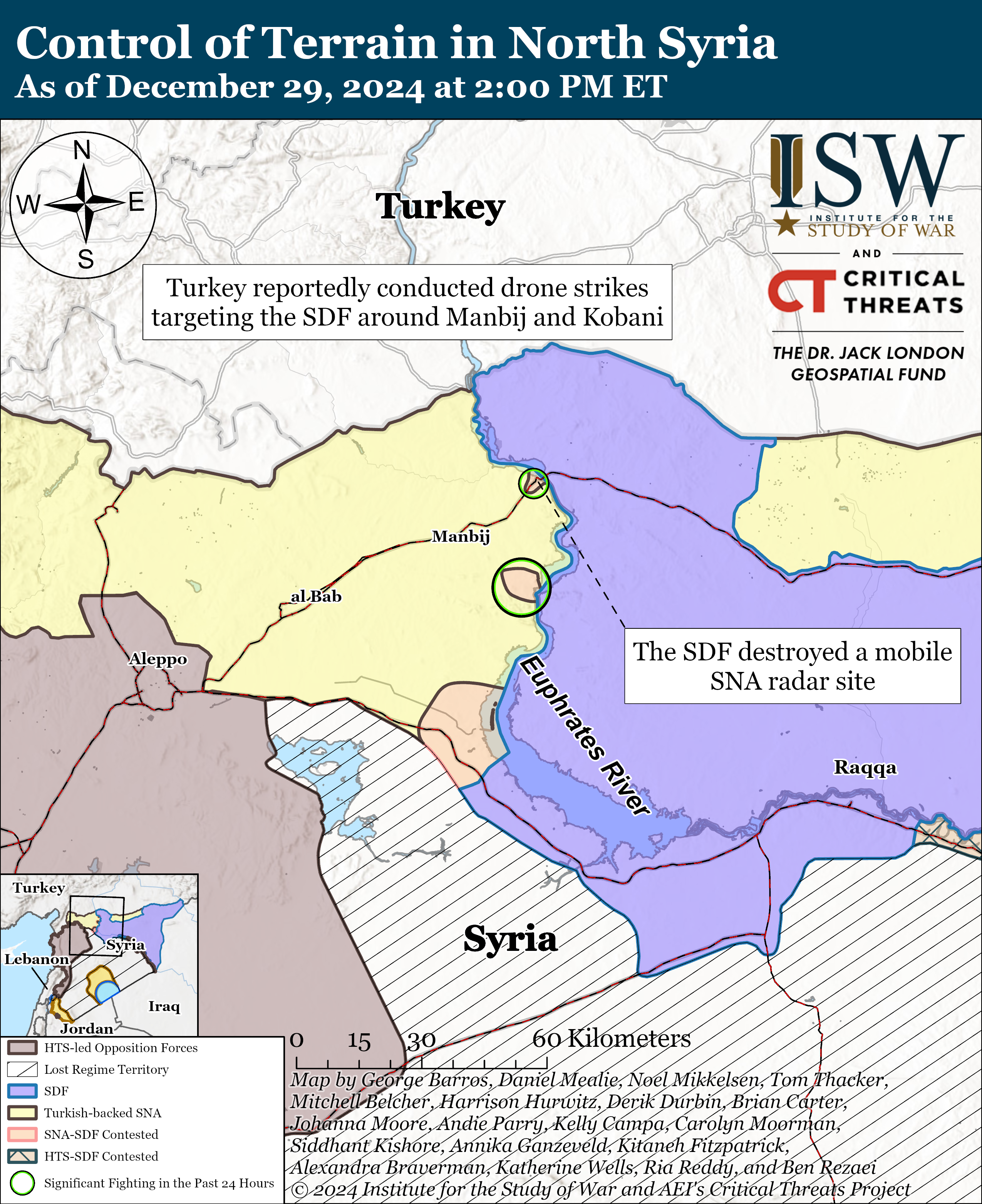 Shara continues to meet with the Turkish-backed Syrian National Army (SNA) while engaging in negotiations with the SDF. Shara met with SNA leaders, including Turkish ultranationalist and Grey Wolves member Fahim Issa, on December 29.[12] Shara has heavily favored the SNA and is pursuing “strategic relations” with Turkey, both of which have stated their intent to “eliminate” the SDF.[13]
