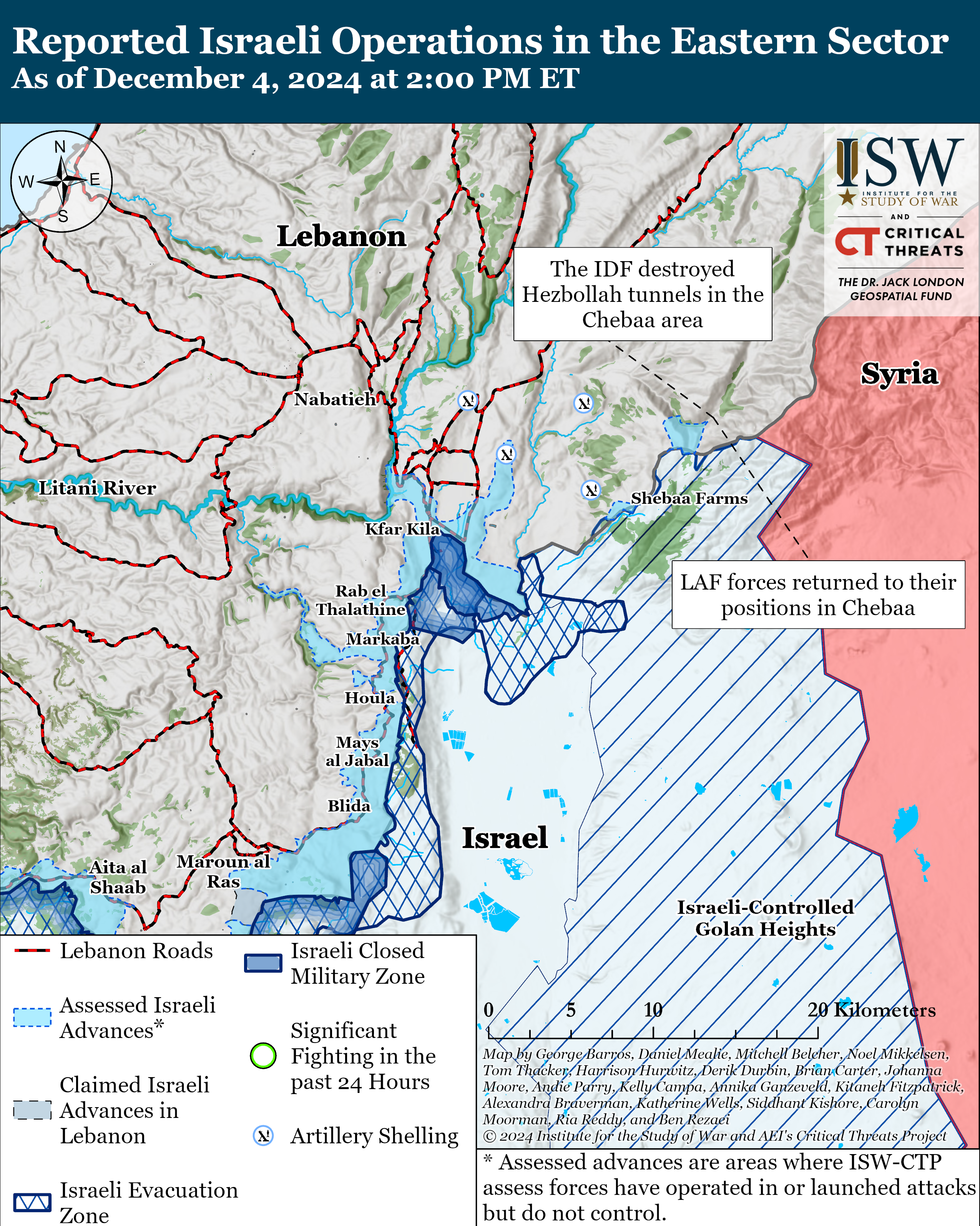 Geolocated images showed the IDF 810th Mountain Brigade (210th Division) conducting destroying tunnels in the Chebaa area.[44] Israeli media reported on December 3 that the IDF 810th and 1st Infantry brigades and combat engineers demolished Hezbollah bunkers north of the Israeli border in the Chebaa area in recent weeks.[45] Israeli troops seized weapons in several underground sites and destroyed the underground infrastructure[46] Hezbollah fired two rockets at an IDF border position in the Israeli-controlled Shebaa Farms on December 2.[47]