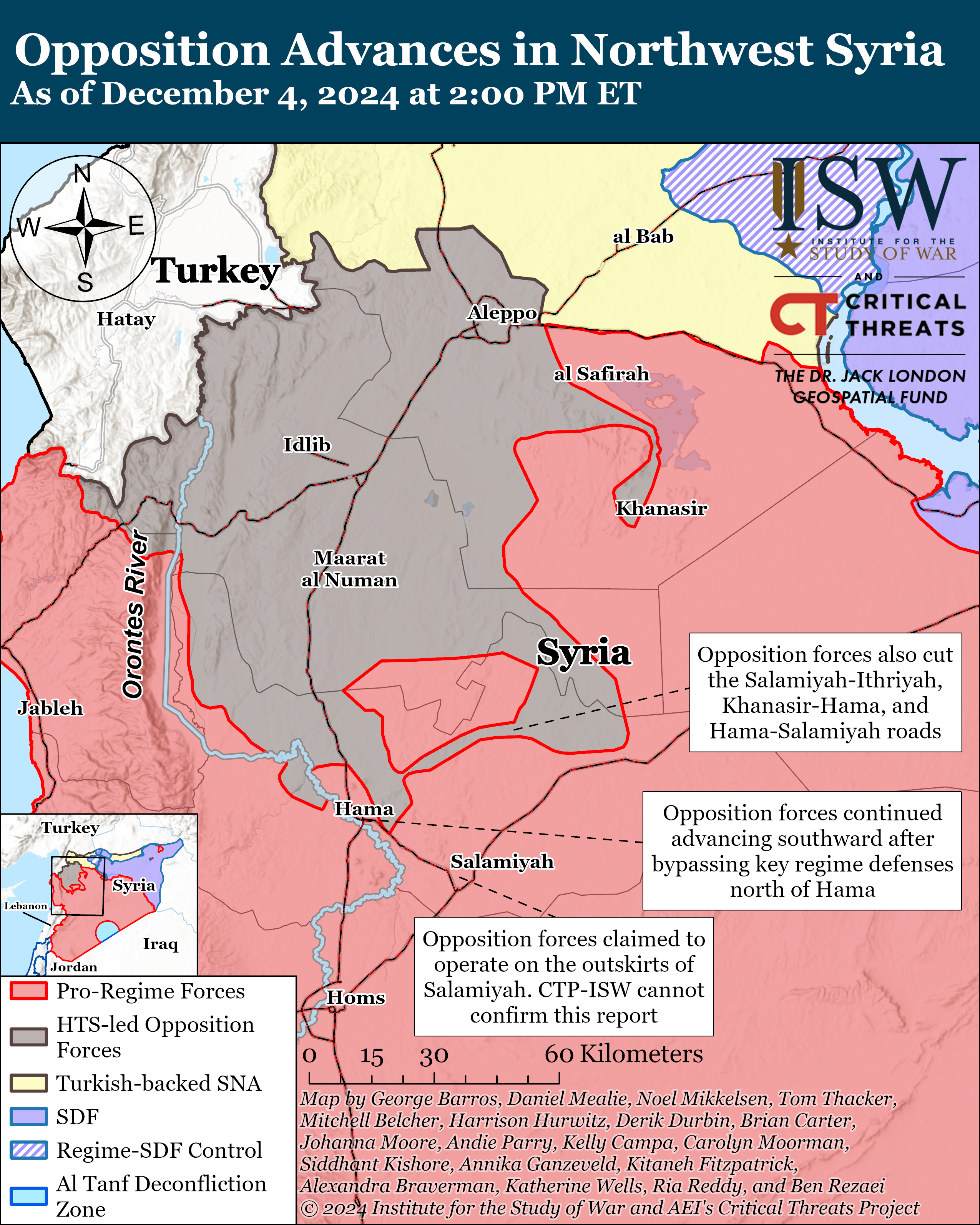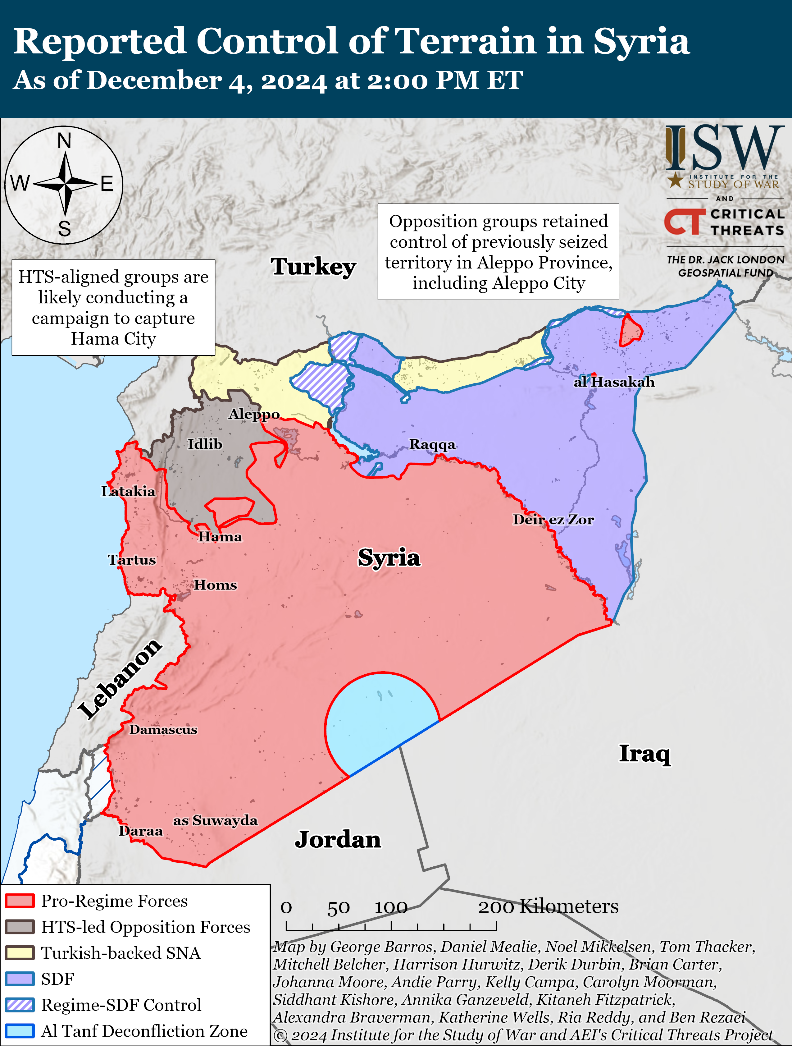 Opposition groups retained control of previously seized territory in Aleppo Province, including Aleppo City, on December 4. Social media users posted footage of HTS leader Abu Mohammad al Julani visiting Aleppo Citadel on December 4, emphasizing the extent of control that opposition forces maintain in Aleppo City.[9]