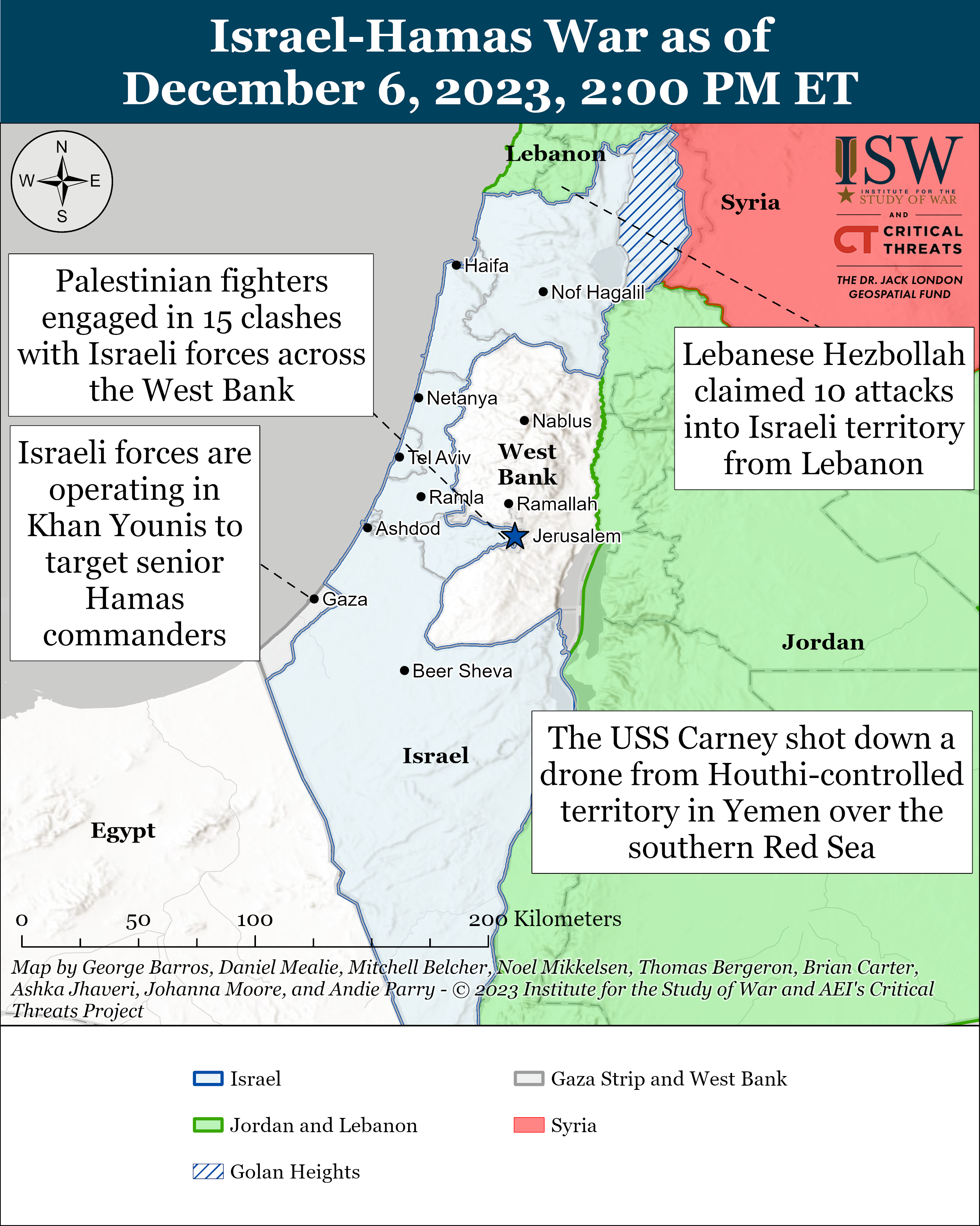 Israeli forces and Palestinian fighters engaged in 15 clashes across the West Bank on December 6. This level of violence is consistent with the daily average rate of clashes in the West Bank over the last seven days. Palestinian fighters, including al Qassem Brigades fighters, engaged Israeli forces in two small arms clashes and detonated at least two IEDs targeting Israeli vehicles as Israeli units conducted raids in Jenin.[32] Palestinian fighters also detonated five other IEDs targeting Israeli forces and engaged Israeli forces in seven other small arms clashes elsewhere in the West Bank.[33] Palestinians demonstrated against Israeli operations in Gaza in Ramallah and Tulkarm on December 6.[34]