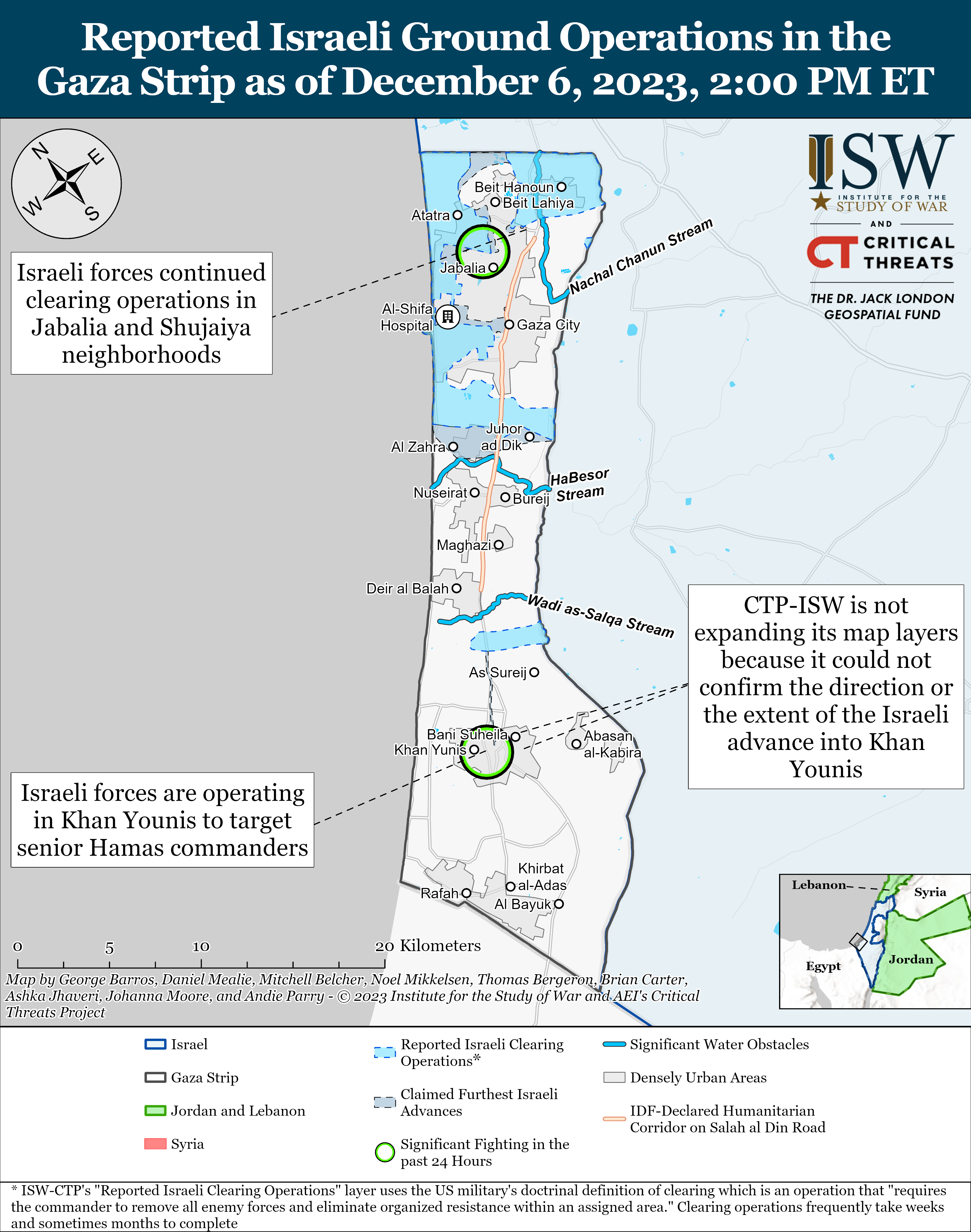 The IDF 98th Paratrooper Division led the attack on Khan Younis to target Hamas’ ”centers of gravity,” which is presumably a reference to Hamas’ critical command node in the city.[5] The IDF said that its forces encircled the city after it broke through Hamas’ Khan Younis Brigade’s defenses. The IDF reported that it began conducting targeted raids within the city.[6] The IDF issued urgent warnings to residents in the Khan Younis area against traveling on the Salah al Din Road as Israeli forces are operating on parts of the road.[7] The Israeli Air Force attacked 250 targets across the Gaza Strip on December 6, targeting weapons, tunnels, IEDs, and other military infrastructure.[8] Hagari stated that the four IDF divisions operating across the Gaza Strip are fighting with a high intensity as they break down defensive lines.[9]
