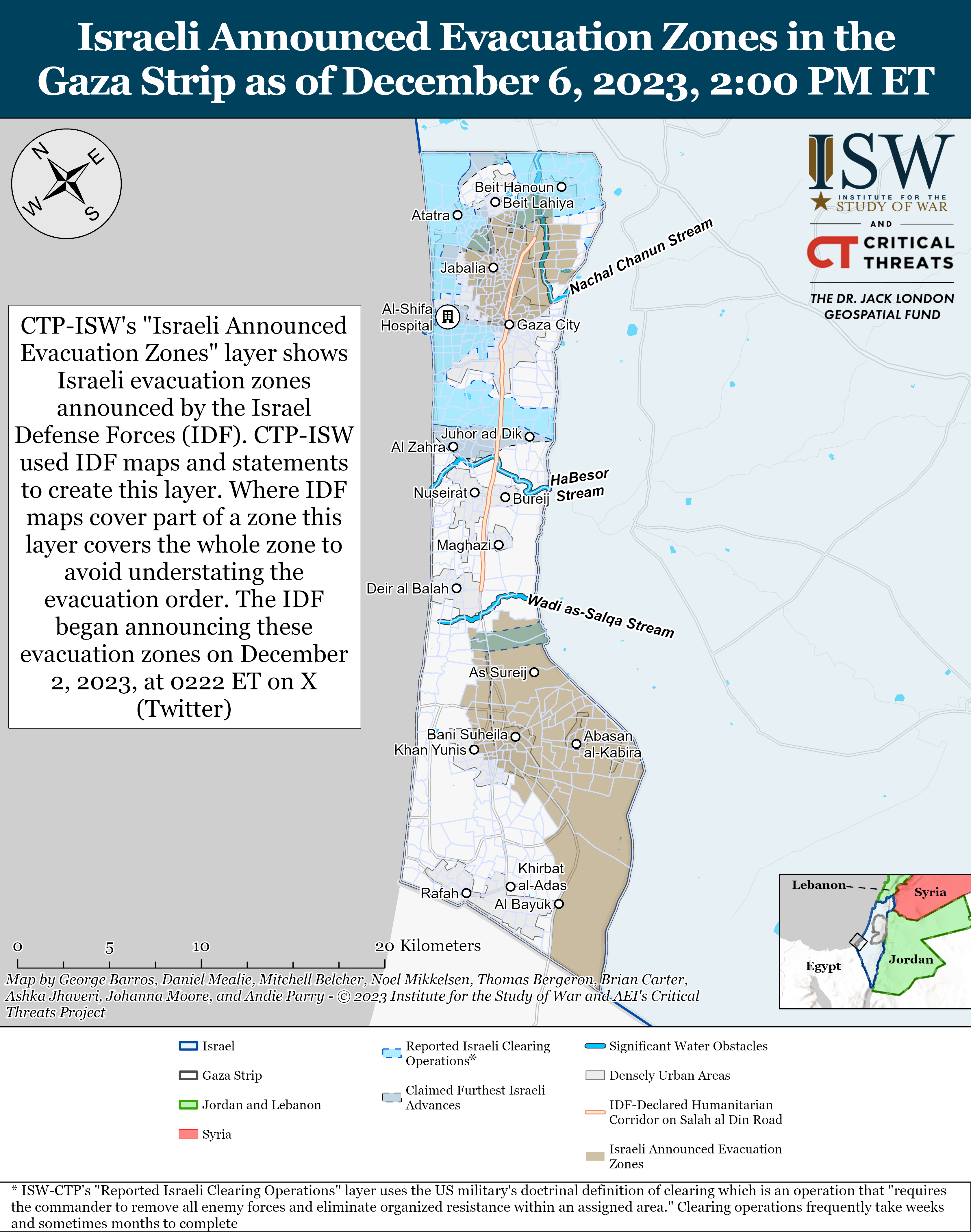 Note: CTP and ISW have refocused the update to cover the Israel-Hamas war. The new sections address developments in the Gaza Strip, the West Bank, Lebanon, and Syria, as well as noteworthy activity from Iran’s Axis of Resistance. We do not report in detail on war crimes because these activities are well-covered in Western media and do not directly affect the military operations we are assessing and forecasting. We utterly condemn violations of the laws of armed conflict and the Geneva Conventions and crimes against humanity even though we do not describe them in these reports.