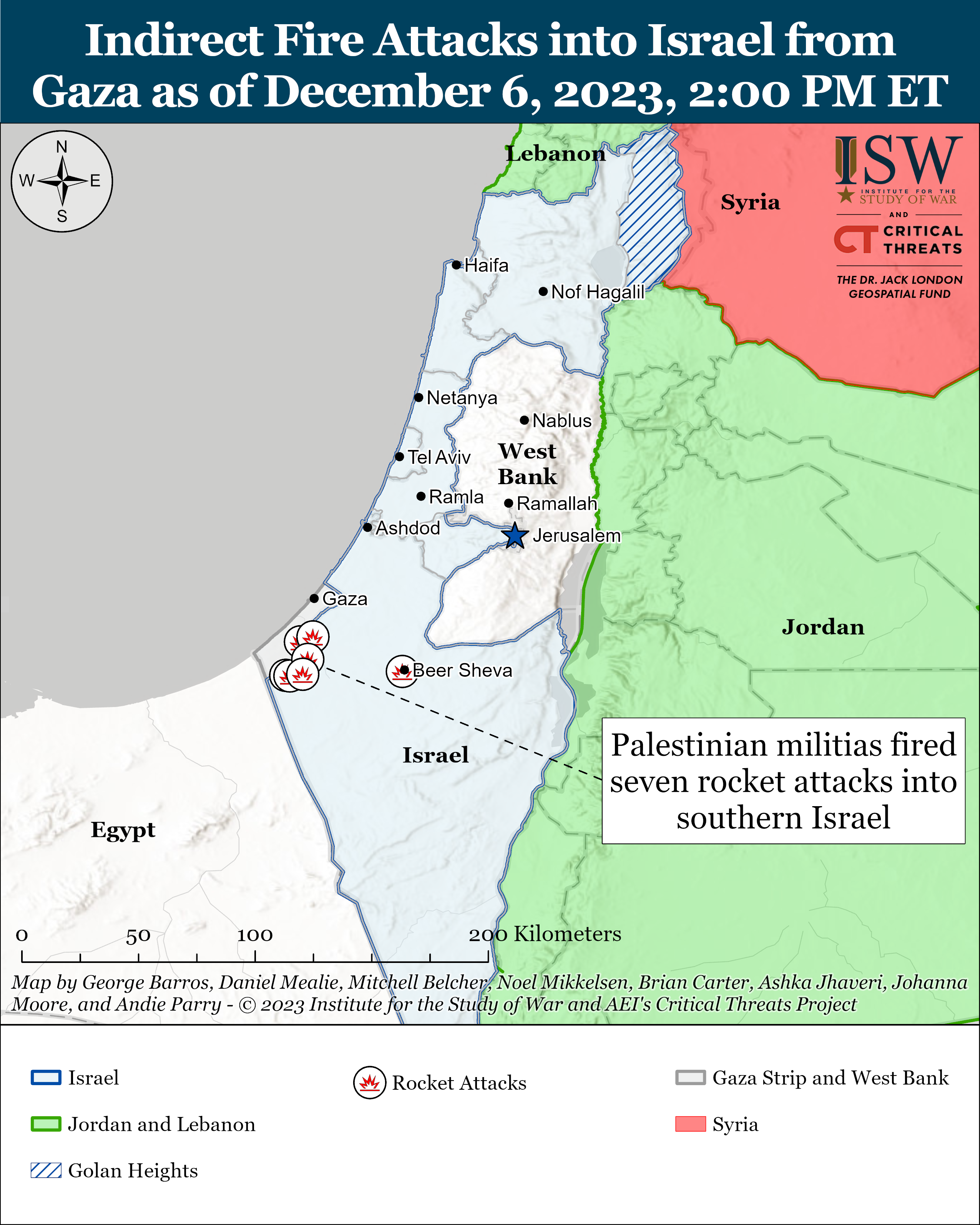 Palestinian militias in the Gaza Strip conducted seven indirect fire attacks into Israel on December 6. The al Qassem Brigades conducted six rocket attacks targeting southern Israel.[30] The al Quds Brigades conducted one rocket attack.[31]