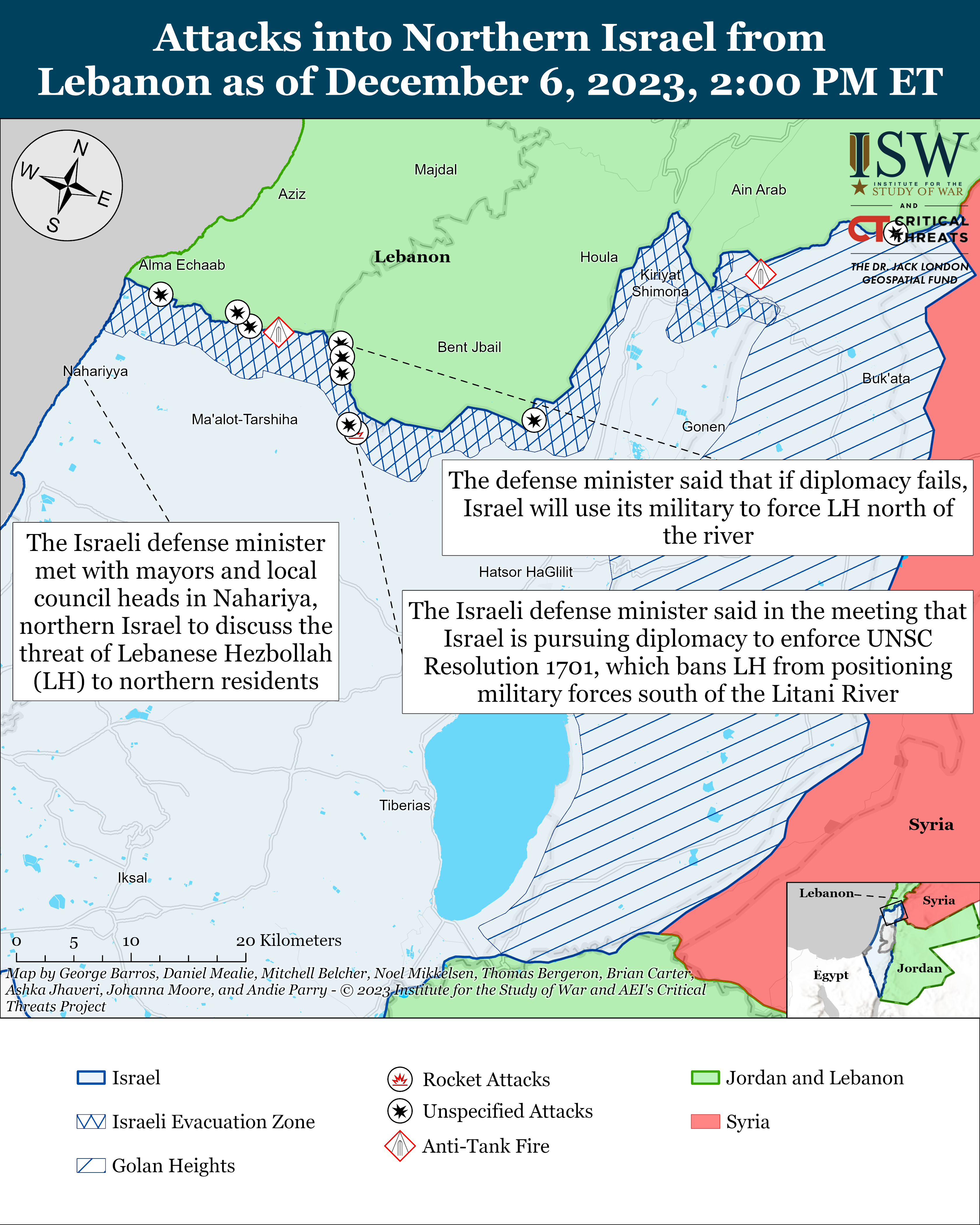 Israeli Defense Minister Yoav Gallant said that Israel is pursuing diplomacy to enforce UN Security Council Resolution 1701, which bans Lebanese Hezbollah (LH) from positioning military forces south of the Litani River.[36] Gallant met with mayors and local council heads in Nahariya, northern Israel, on December 6.[37] Israel evacuated thousands of northern Israelis from their homes after the October 7 attacks.[38] Gallant “promised” that northern Israelis will not return to their homes before Lebanese Hezbollah military forces are north of the Litani River. Gallant said that the “best option” is for a diplomatic agreement in which unspecified actors would enforce UN Security Resolution 1701. The resolution, which ended the 2006 Israel-Lebanon War, created a demilitarized zone between the Blue Line and the Litani.[39] Gallant said that if diplomatic measures fail Israel will use its military to force LH north of the river, according to the Times of Israel.