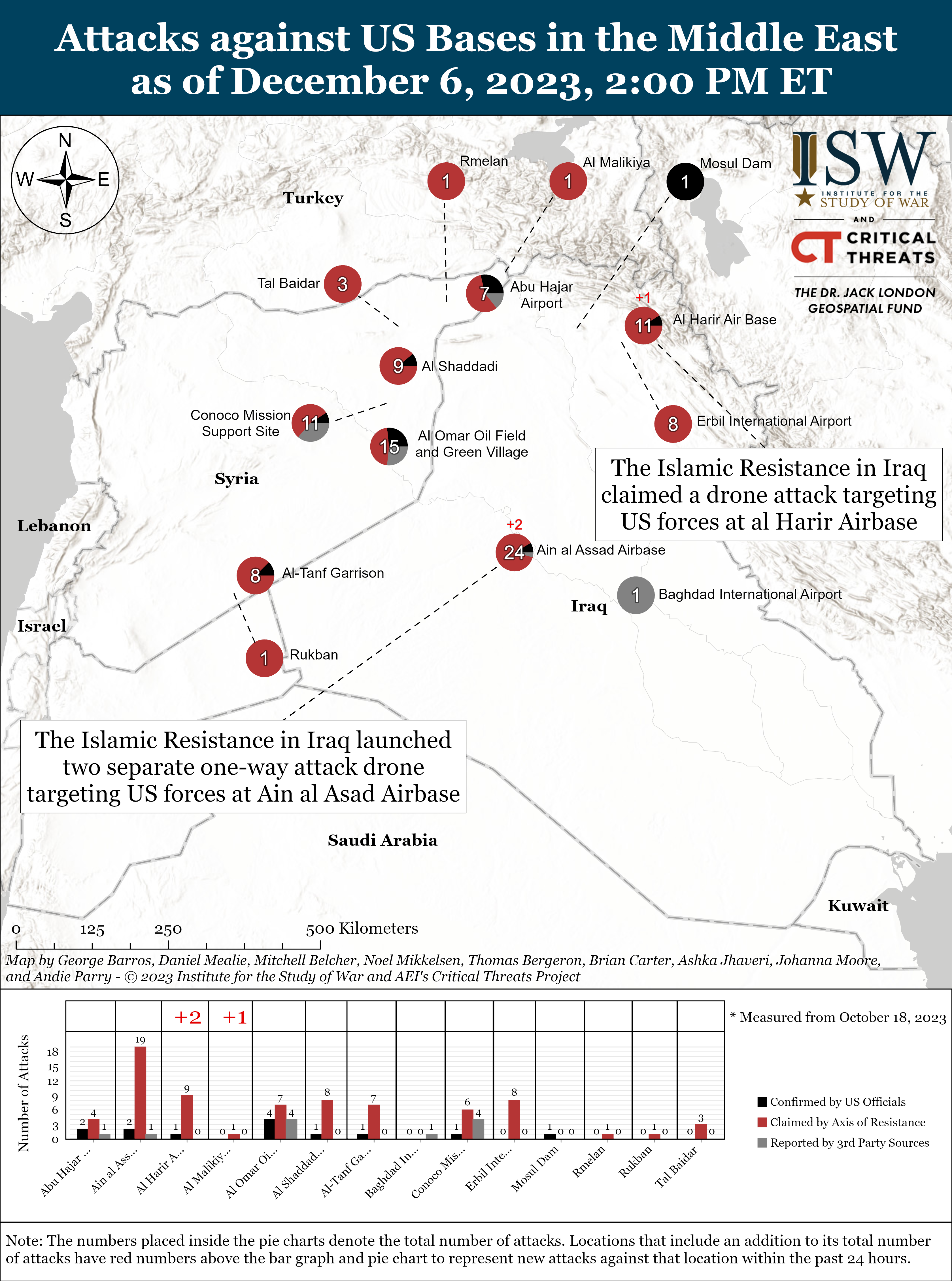 The Islamic Resistance in Iraq—a coalition of Iranian-backed Iraqi militias—claimed responsibility for three attacks targeting US positions in Iraq on December 5 and 6. The Islamic Resistance in Iraq resumed its attacks on US forces on December 3, two days after the humanitarian pause in the Gaza Strip ended on December 1. The Islamic Resistance in Iraq and its affiliated groups have claimed 81 attacks against US forces in the Middle East since October 18.