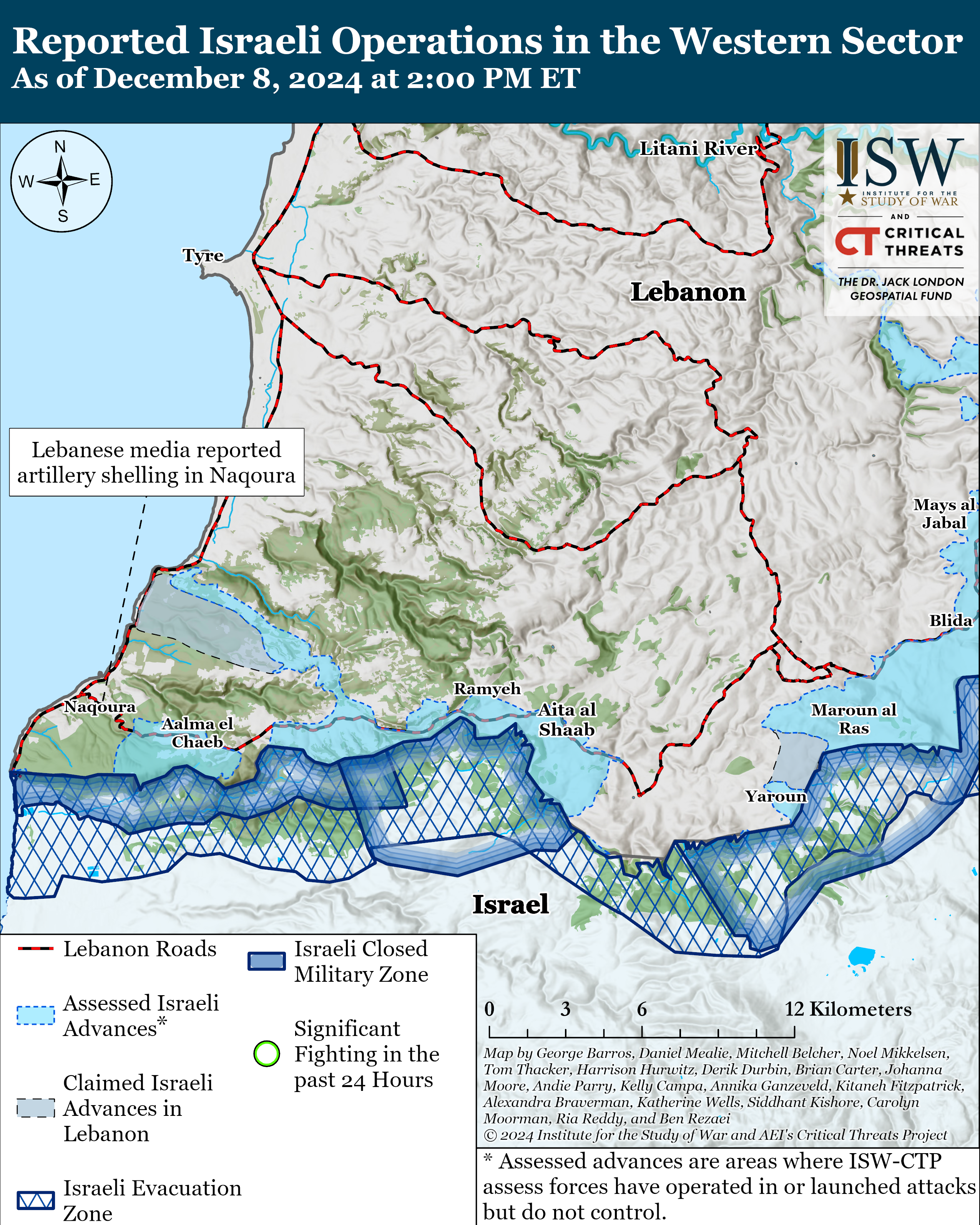 The IDF Air Force has conducted airstrikes targeting Hezbollah fighters and infrastructure in southern Lebanon since CTP-ISW’s data cutoff on December 6. The IDF Arabic-language spokesperson posted footage on December 7 of an IDF airstrike targeting a Hezbollah fighter in violation of the ceasefire.[80] The IDF Air Force struck Hezbollah fighters in a weapons depot near Dibbine, southeastern Lebanon, on December 8.[81] Lebanese media has reported airstrikes in multiple areas of southern Lebanon since CTP-ISW’s last data cutoff on December 6, including around Beit Lif, Kfar Zabad, Mari, and Yohmor.[82]