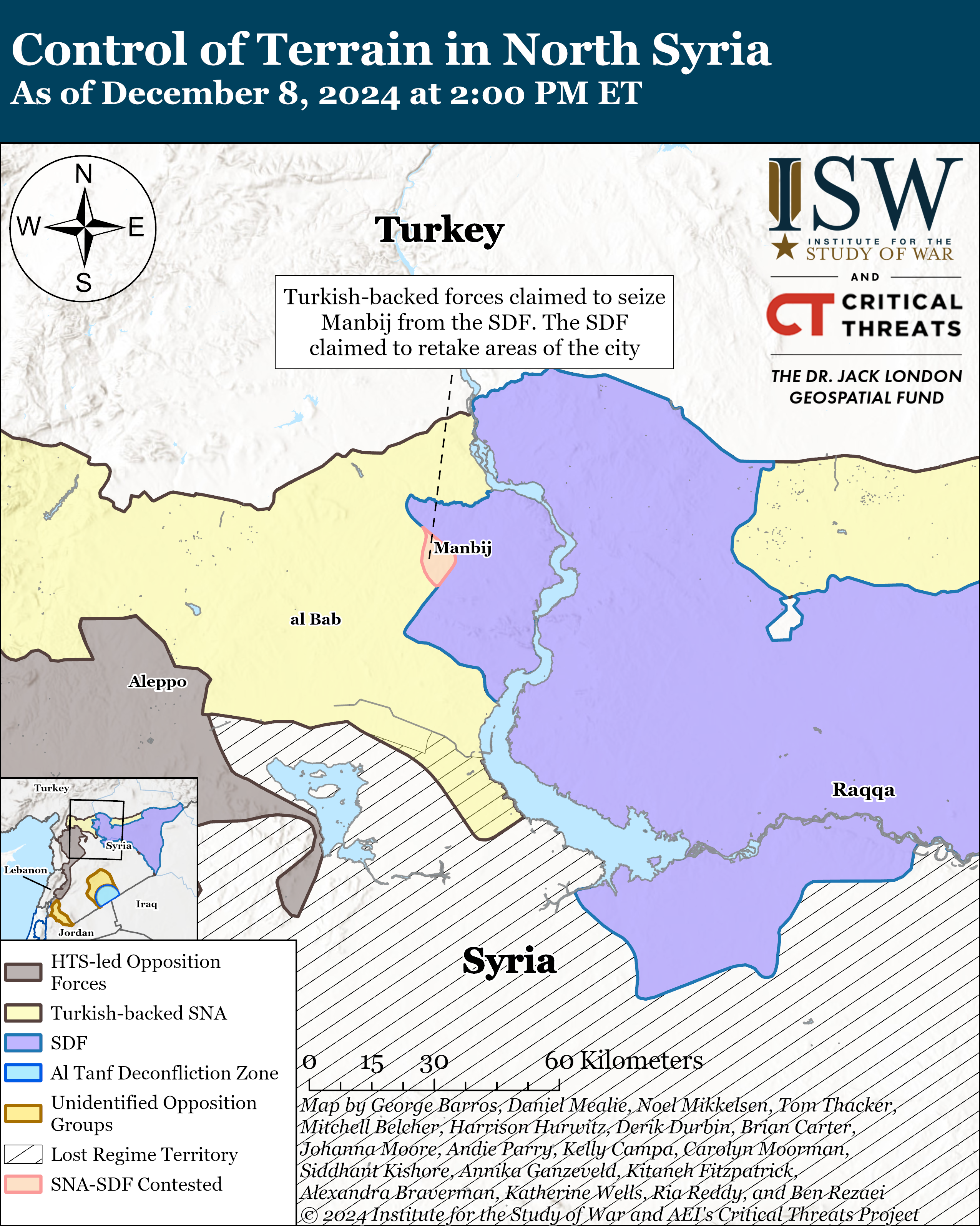 The Turkish-backed Syrian National Army (SNA) clashed with the SDF in Manbij in eastern Aleppo Province on December 8. An SNA-affiliated operations room claimed to seize all of Manbij on December 8 after days of clashes in the surrounding area.[24] The SDF rejected the claim and stated later in the day that clashes were ongoing in several neighborhoods of Manbij.[25] The SNA claimed that it seized several formerly SDF-controlled towns west of Manbij on December 8.[26] CTP-ISW is not prepared to assess control of Manbij at this time.