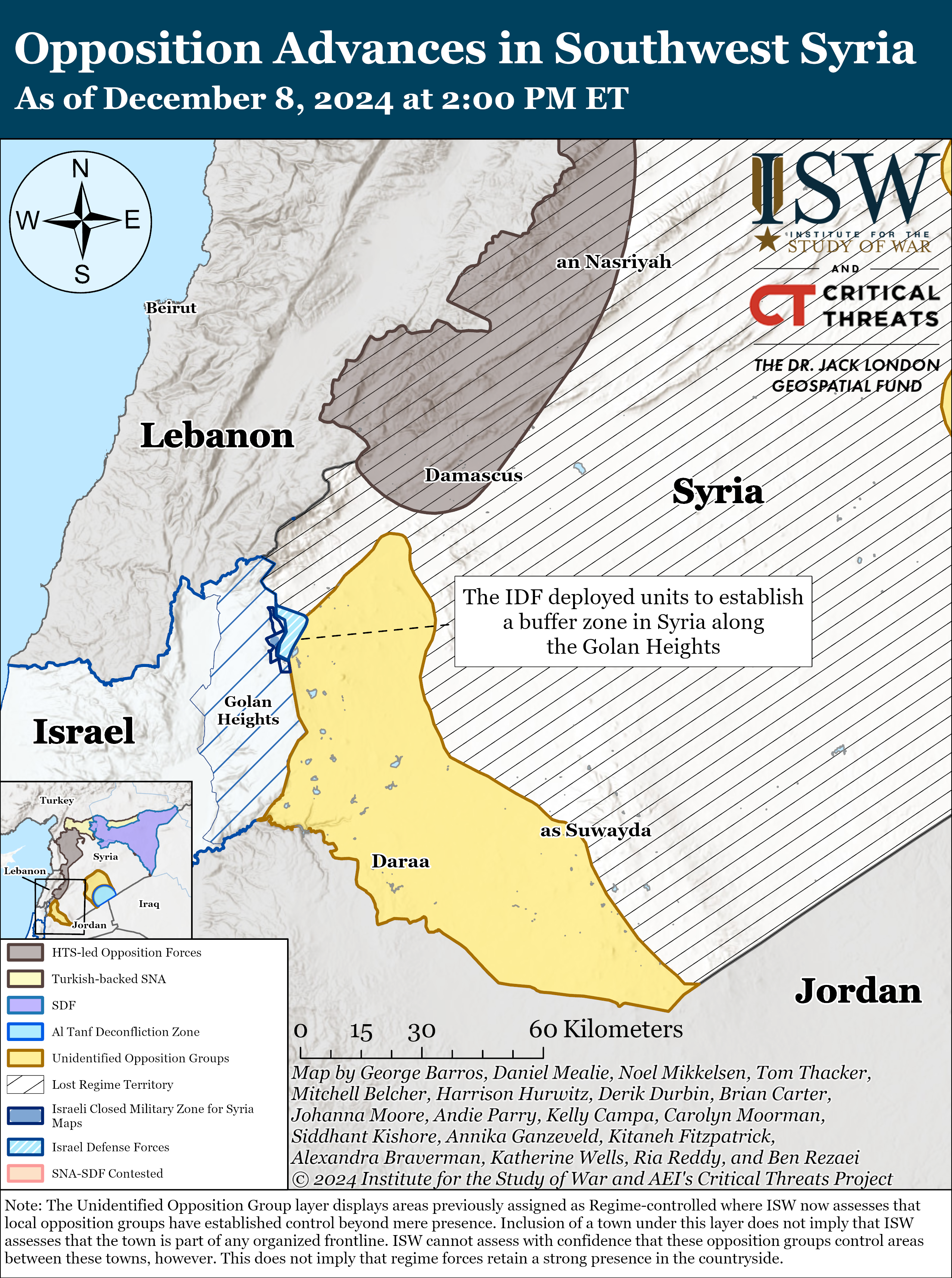 Click here to see CTP and ISW’s interactive map of Israeli ground operations, and here to see CTP and ISW’s interactive map of the ongoing opposition offensive in Syria. These maps are updated daily alongside the static maps present in this report.