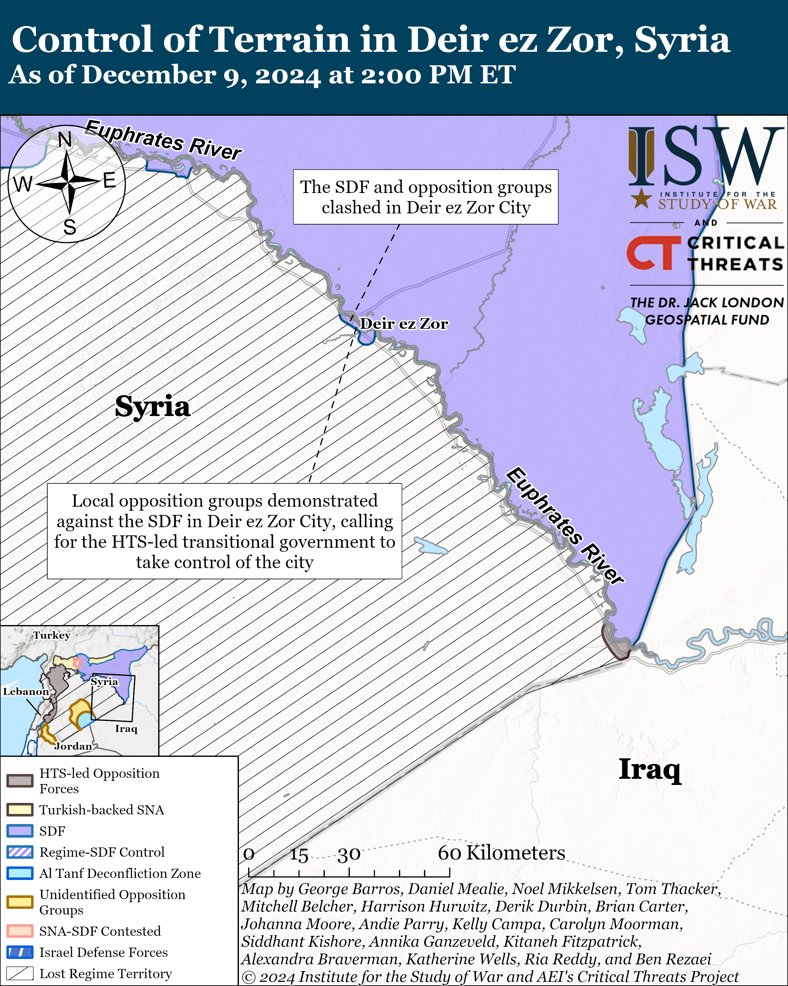 The SDF is also facing local dissent in the areas of Deir ez Zor Province that it seized from the Syrian regime on December 6.[22] Local opposition groups demonstrated in Deir ez Zor City on December 9, calling for the HTS-led transitional government to take control of the city.[23] Local media reported that the SDF opened fire on the demonstrators and killed several of them.[24] The HTS-affiliated Fateh Mubin operations room confirmed that its forces were operating in Deir ez Zor City on December 7 shortly before Assad fled the country.[25] Local media has since reported that convoys affiliated with Fateh Mubin are operating between Deir ez Zor and Albu Kamal, but few reliable sources are reporting direct clashes between the SDF and HTS-affiliated forces.[26] Engagements between the SDF and local opposition demonstrate that HTS-affiliated forces have not established full security control over the Deir ez Zor corridor.[27]
