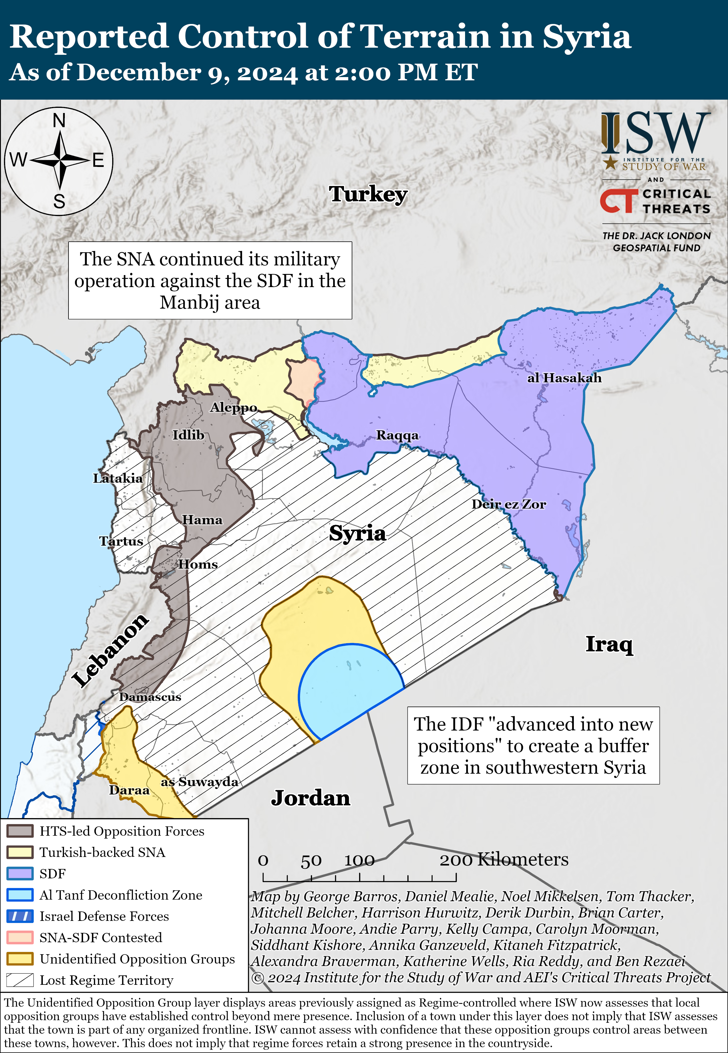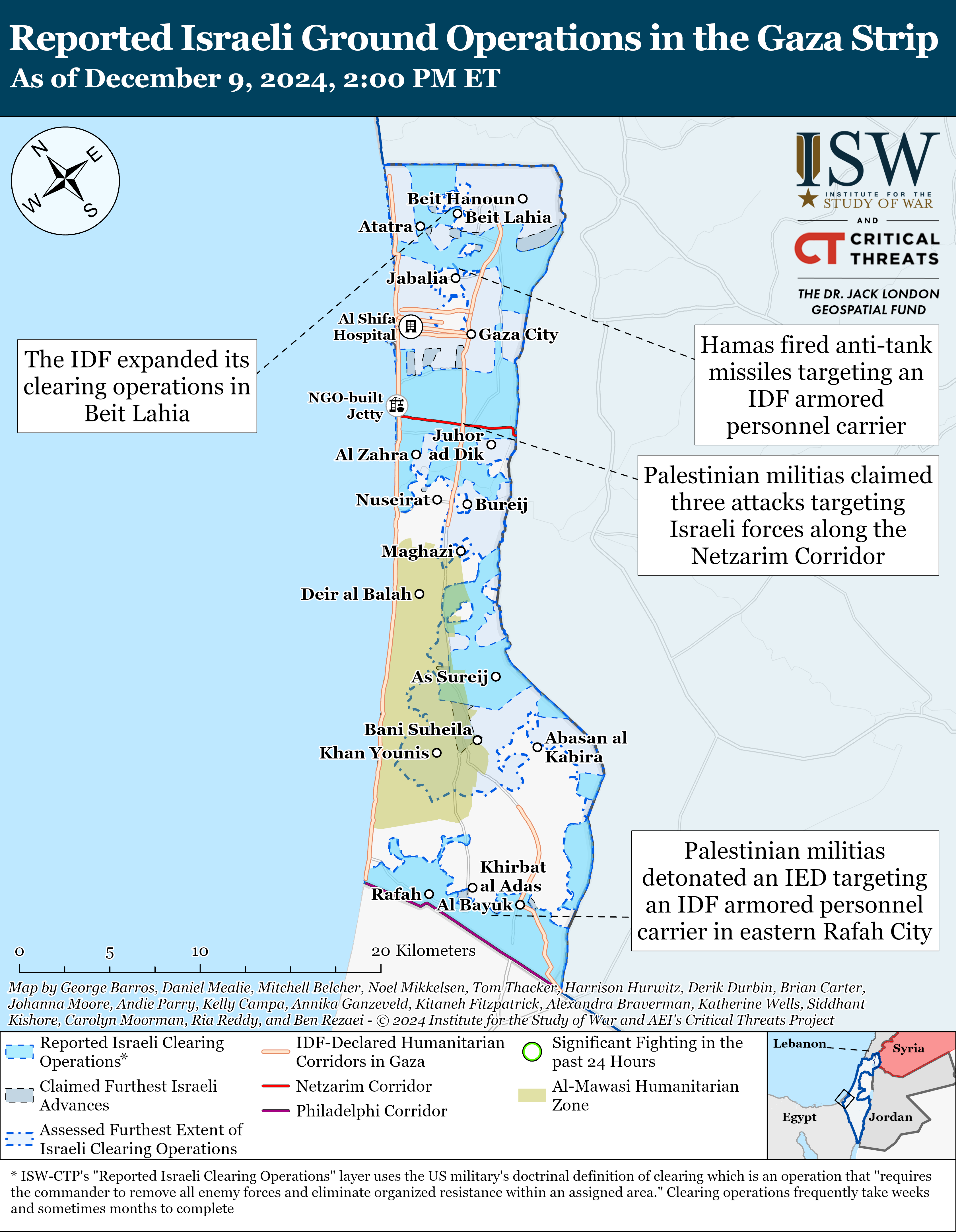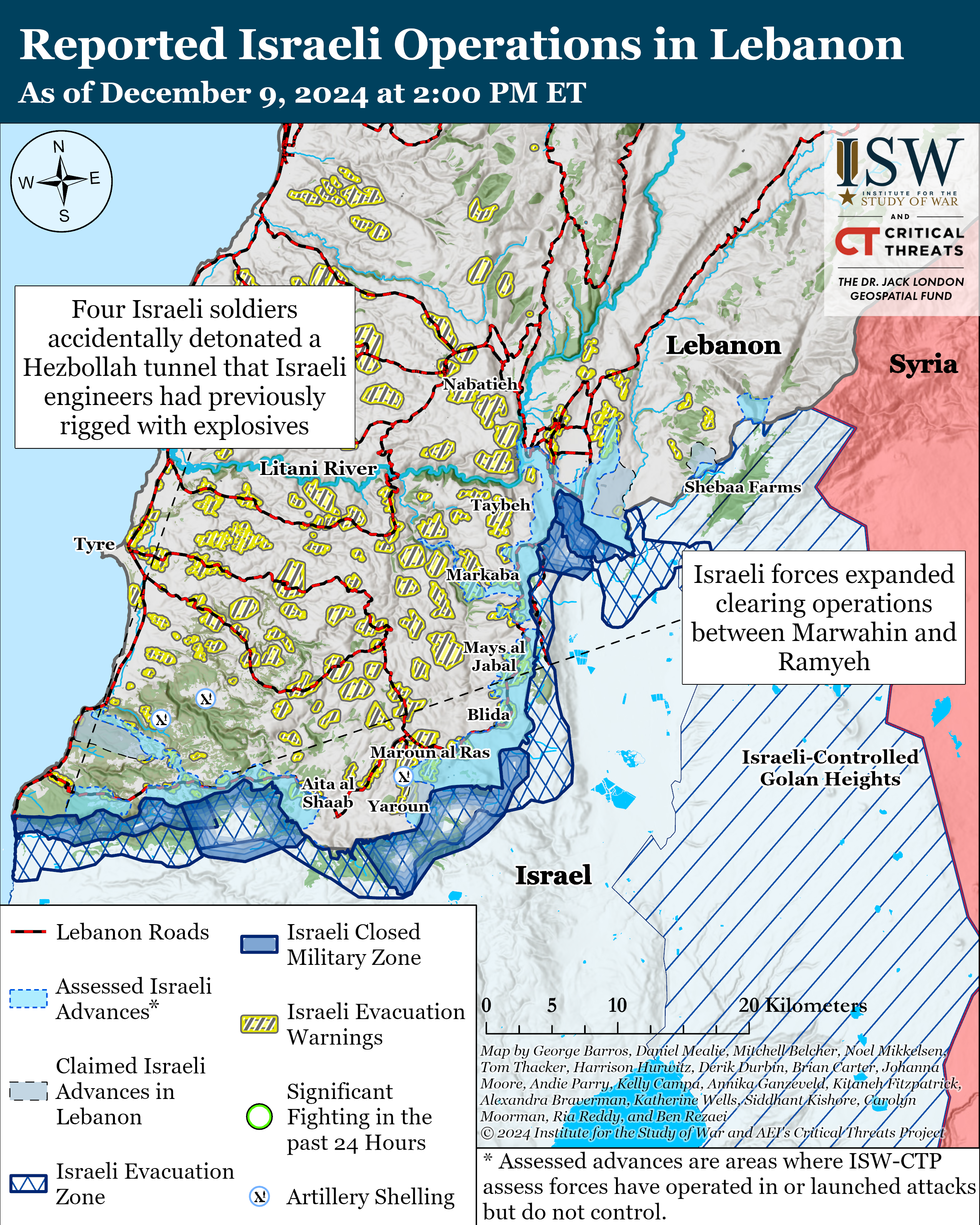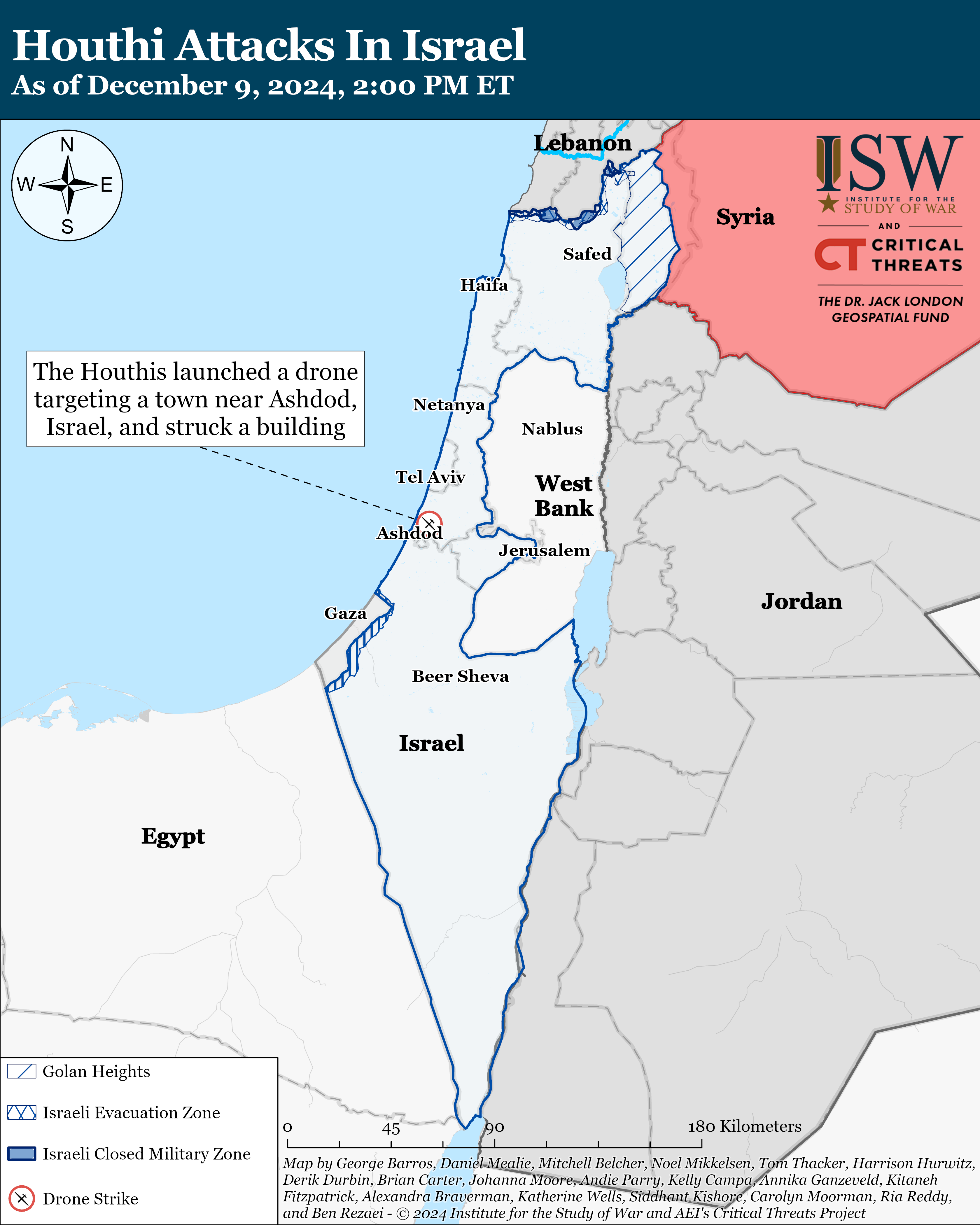 - Israel in Syria: The Israel Defense Forces (IDF) continued to establish a buffer zone in Syria along the Golan Heights on December 9. The IDF Air Force continued conducting airstrikes targeting former SAA and Lebanese Hezbollah sites in Syria on December 9.