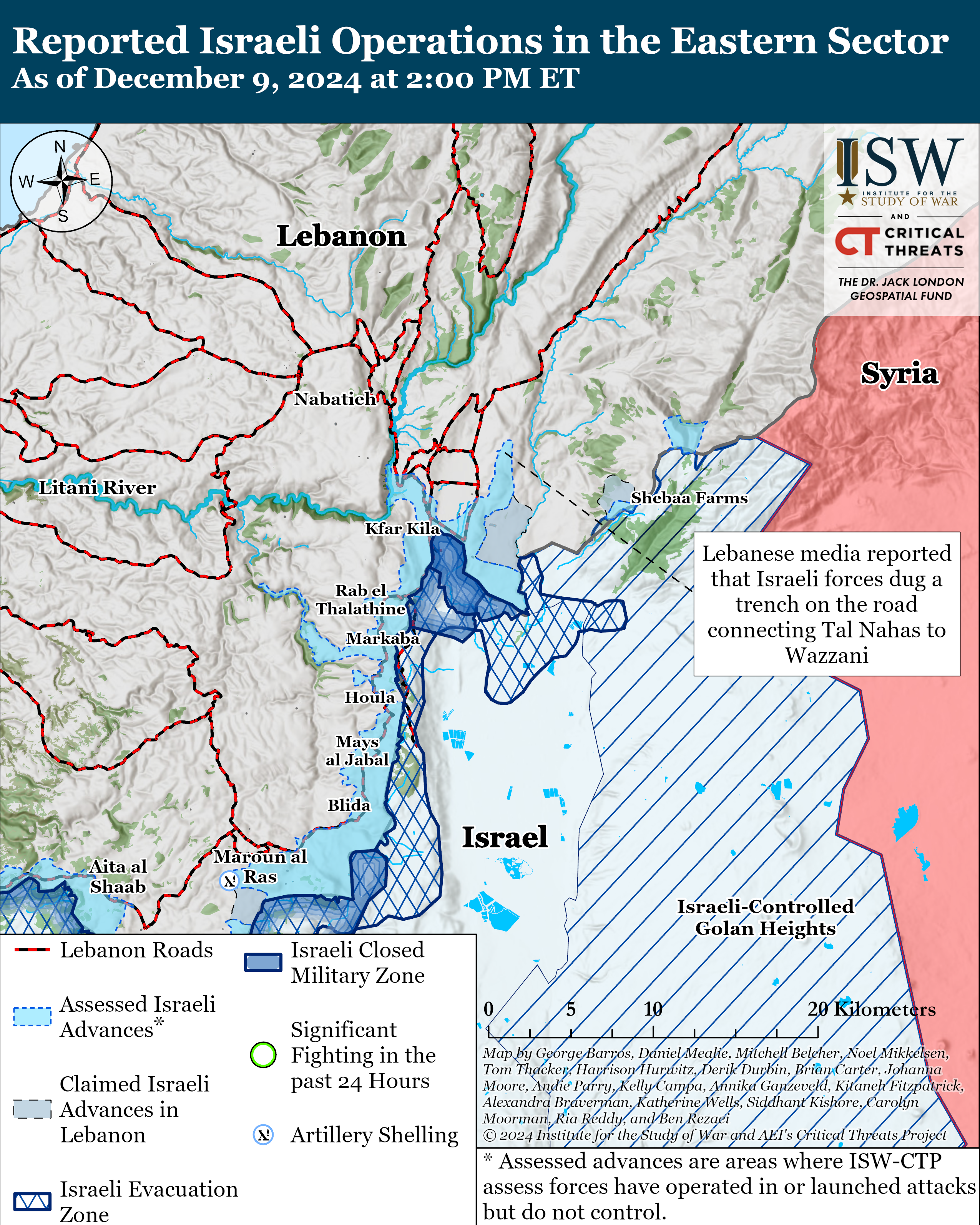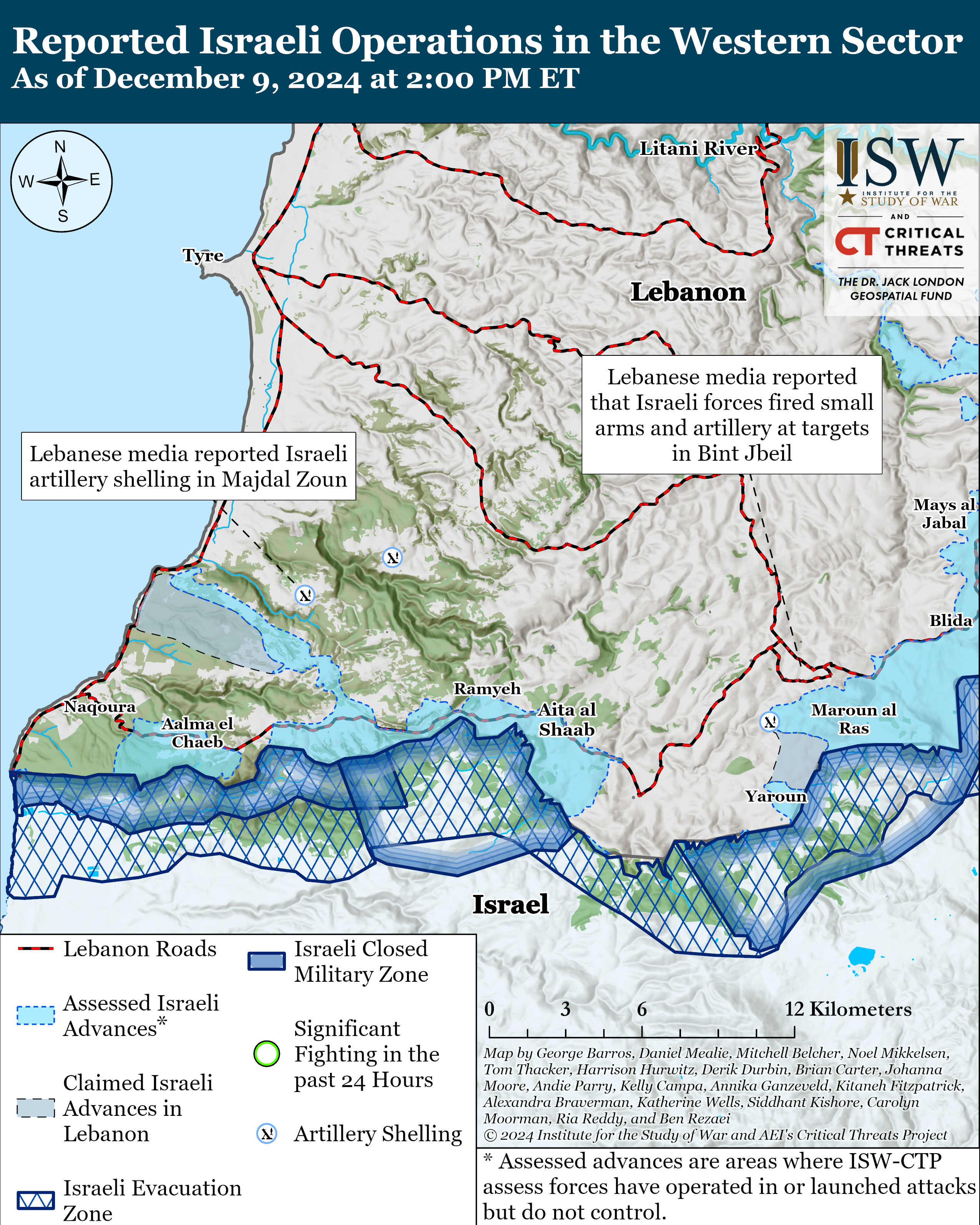 Lebanese media reported Israeli artillery shelling targeting Majdal Zoun and Zebqine, southwestern Lebanon, on December 9.[75] Israeli forces have operated south and west of Majdal Zoun and Zebqine in Chama and al Bayyada since November 15.[76]