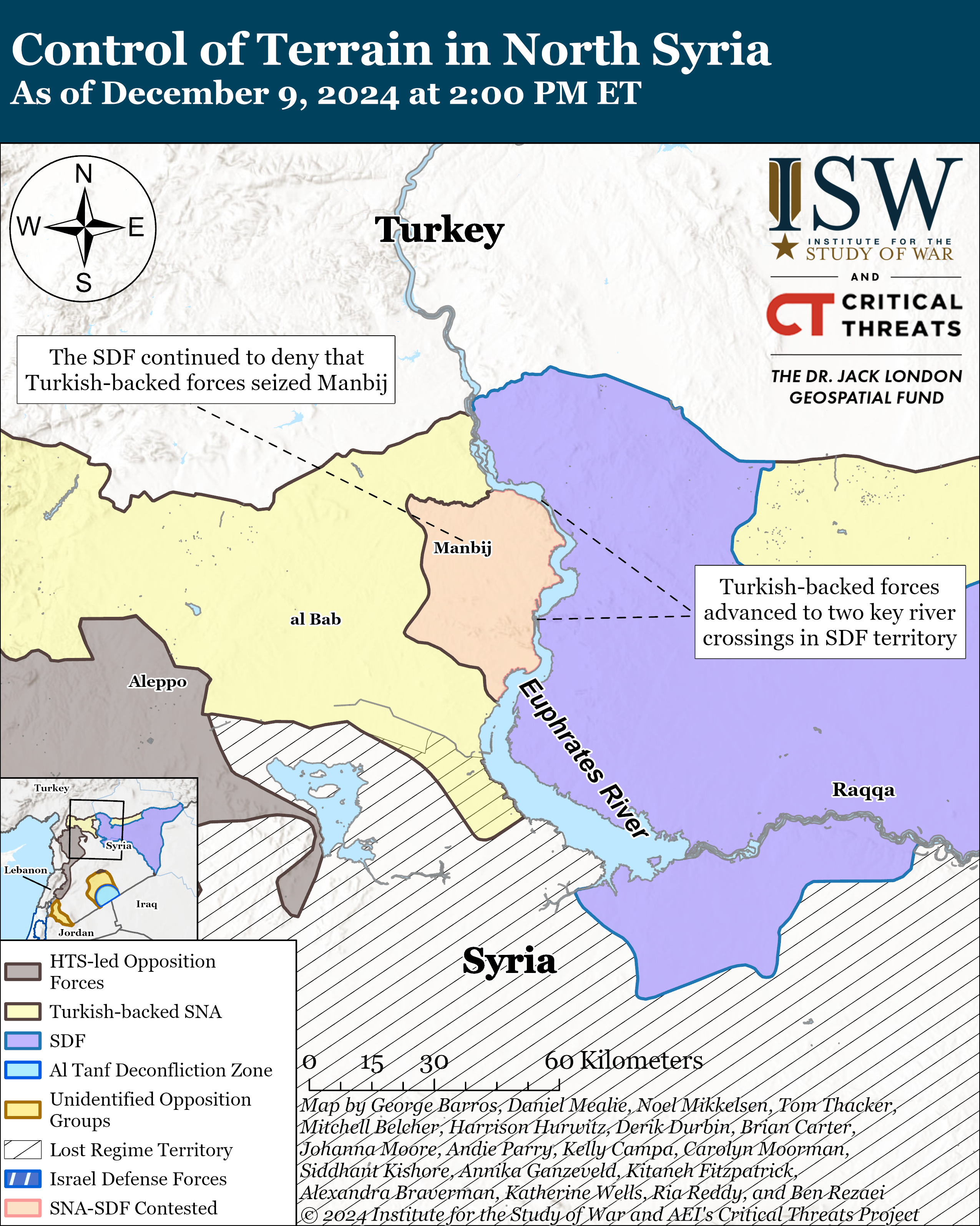The Turkish-backed Syrian National Army (SNA) is also attacking the SDF as the SDF contends with internal dissent. SNA forces advanced east of Manbij to Qara Qozak Bridge and Tishrin Dam, which are two key river crossings in SDF territory.[28] The SDF confirmed that its forces engaged SNA fighters at both sites and did not acknowledge that its forces lost control over the river crossings.[29] Opposition media claimed that the SNA took control of the Qara Qozak Bridge and posted a video from the site, however.[30] The SDF continued to dispute that SNA forces seized full control of Manbij on December 9.[31] The SNA claimed that it seized Manbij on December 8.[32]