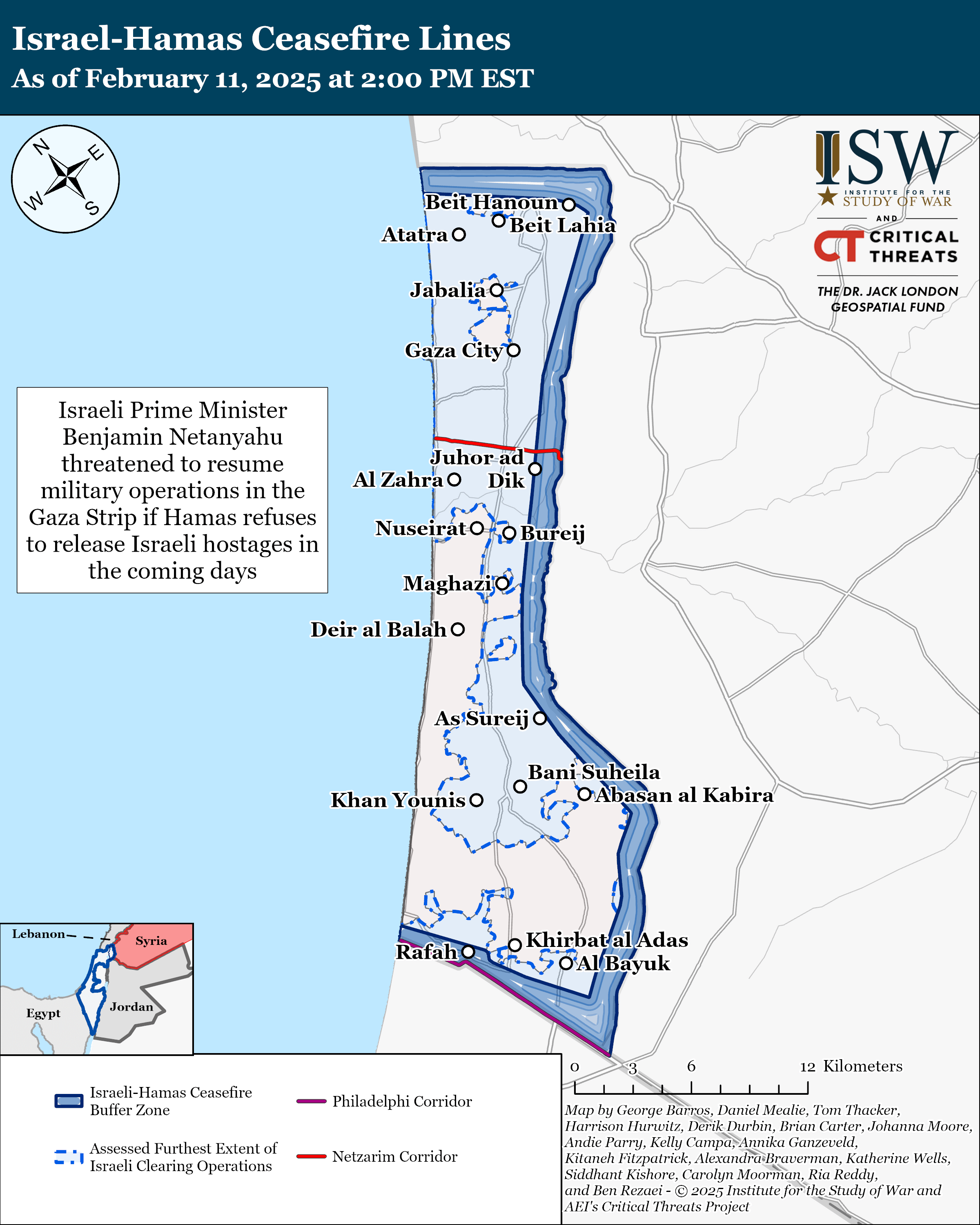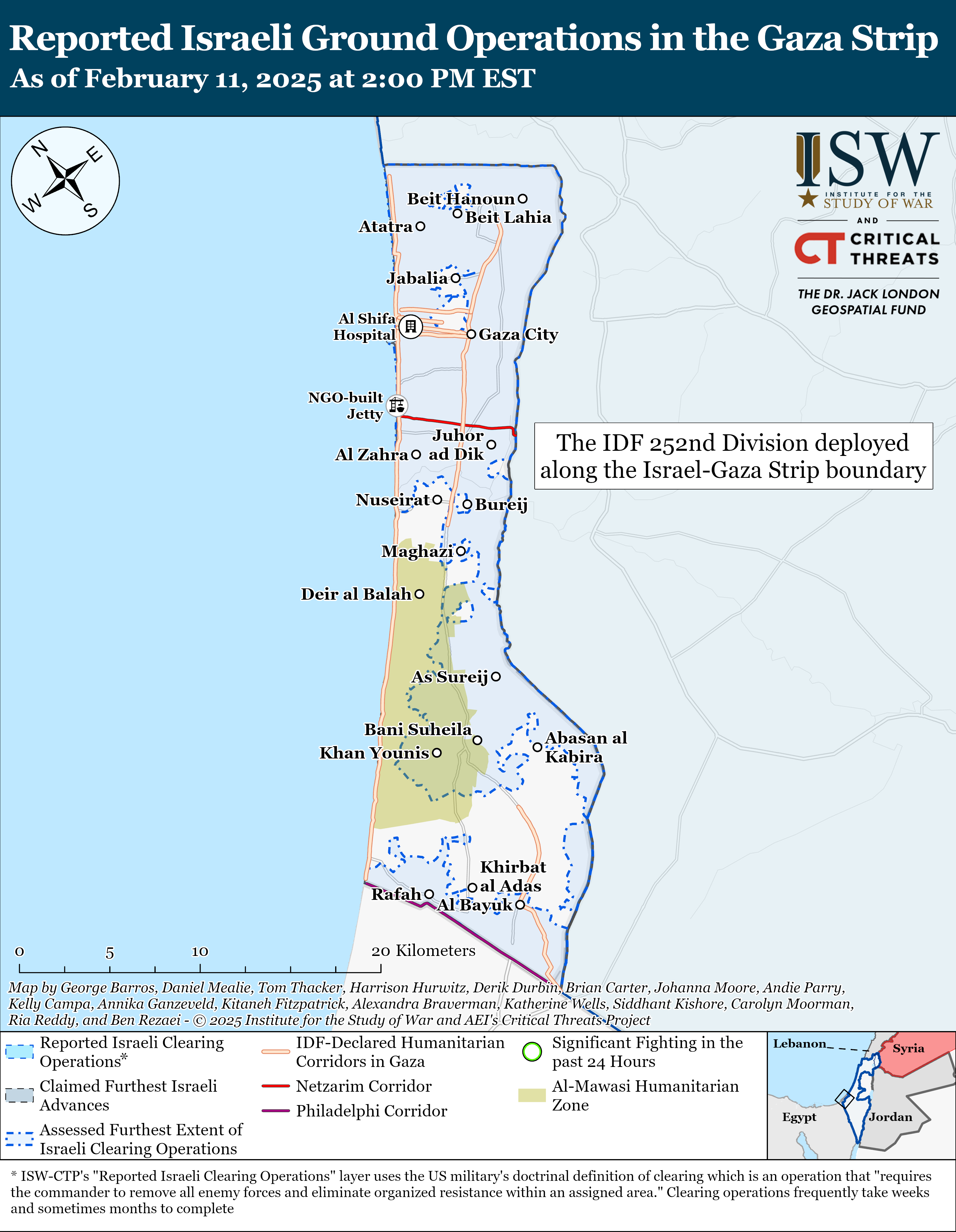 Israeli Prime Minister Benjamin Netanyahu threatened to resume military operations in the Gaza Strip if Hamas fails to release Israeli hostages on February 15.[1] Netanyahu made this announcement after he convened a security cabinet meeting on February 11 to discuss the second phase of the Israel-Hamas ceasefire agreement.[2] Hamas stated on February 10 that it would postpone the release of Israeli hostages, which would be a violation of the ceasefire agreement.[3] Israeli Defense Minister Israel Katz instructed the Israel Defense Forces (IDF) on February 10 to prepare for any “possible scenario” in the Gaza Strip.[4] The IDF deployed its 252nd Division to the buffer zone along the Israel-Gaza Strip boundary on February 11, bringing the total number of divisions there to three.[5] Hamas could use the remaining hostages to pressure Netanyahu to negotiate again if the IDF resumed operations in the Gaza Strip.