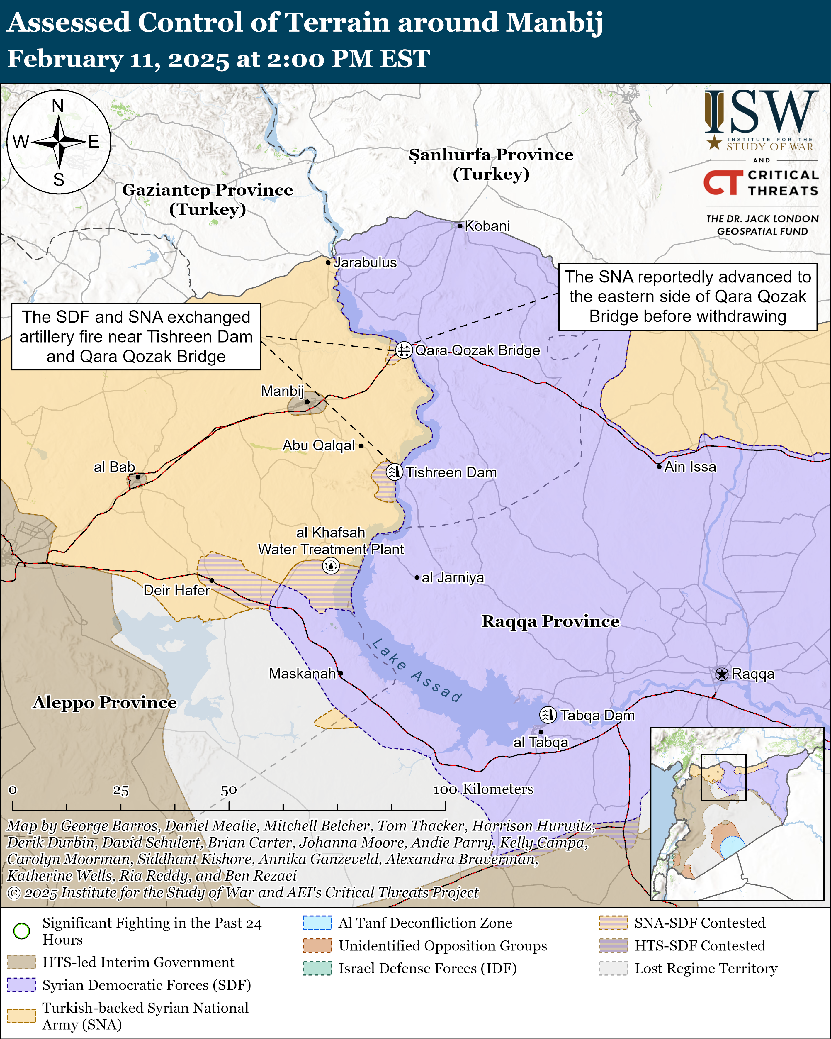 The Turkish-backed Syrian National Army (SNA) has engaged the US-backed Syrian Democratic Forces (SDF) near Tishreen Dam and Qara Qozak Bridge east of Aleppo since CTP-ISW’s last data cutoff on February 10.[23] The SNA and SDF exchanged artillery fire on both sides of the bridge and dam.[24] Turkish aircraft conducted at least 15 airstrikes targeting SDF positions near the bridge and dam.[25] Turkish drones also targeted SDF positions east of the dam.[26] An anti-SDF source reported that SNA forces advanced to the eastern side of Qara Qozak Bridge before withdrawing.[27]