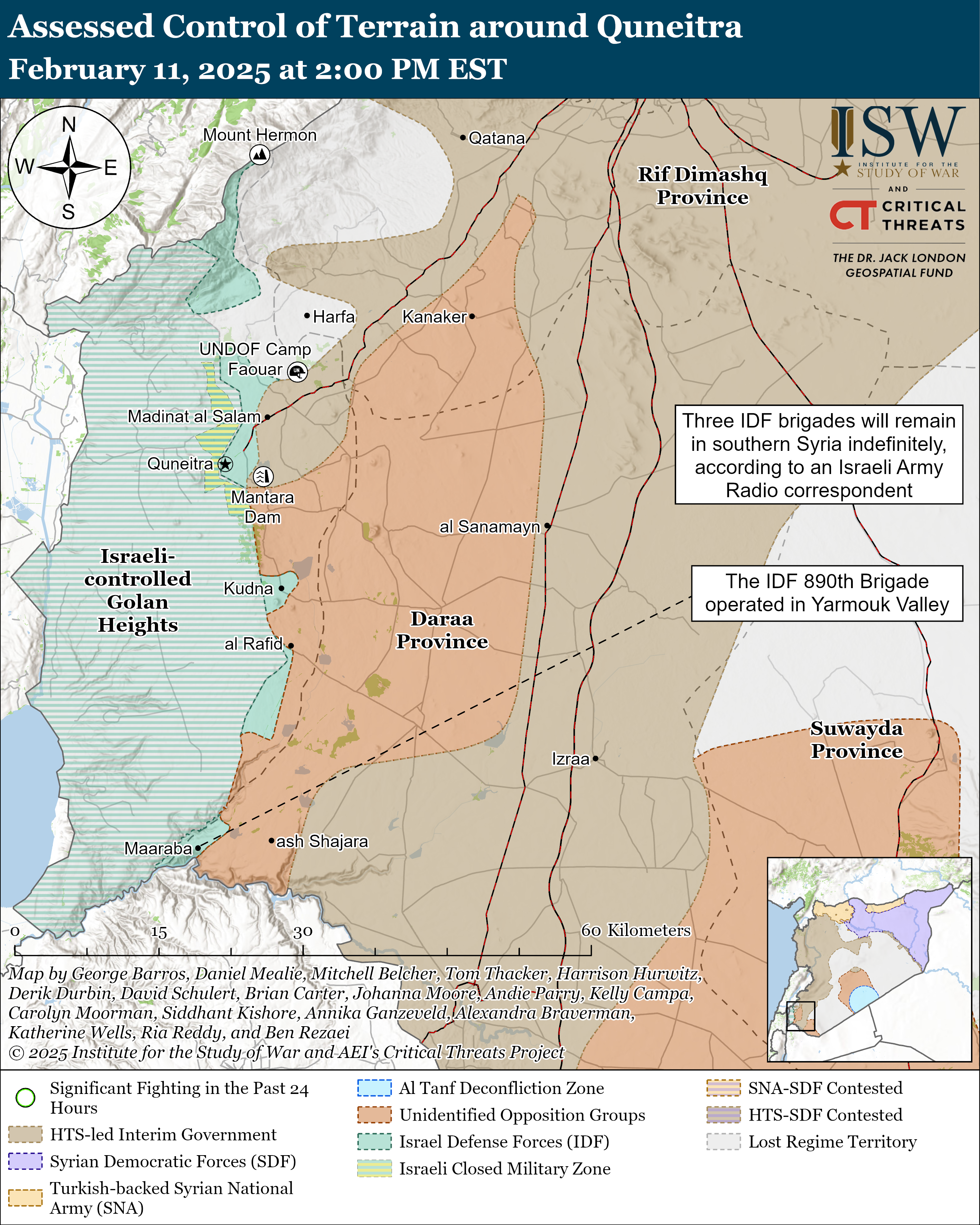 Three IDF brigades will remain in southern Syria indefinitely, according to a correspondent for the state-funded, IDF-supported Israeli Army Radio.[28] The correspondent visited IDF outposts in Yarmouk Valley along the Syria-Golan Heights-Jordan border with the 890th Paratroopers Brigade on February 11.[29] The correspondent reported that the IDF is constructing nine outposts along the Syria-Golan Heights border.[30] Israeli forces are staying in abandoned Assad regime military infrastructure during the construction.[31] The IDF has placed markers to indicate the boundaries of closed military zones and established checkpoints at the entrances of Syrian villages to ”direct movements.”[32] The correspondent said that Israeli forces have ”quiet, unofficial coordination” with local security forces and coordinate fully with Jordanian border forces.[33] Syrian Interim President Ahmed al Shara emphasized in January 2025 that Israeli forces must return to the 1974 disengagement line in the Golan Heights and that UN forces should deploy to the buffer zone.[34]