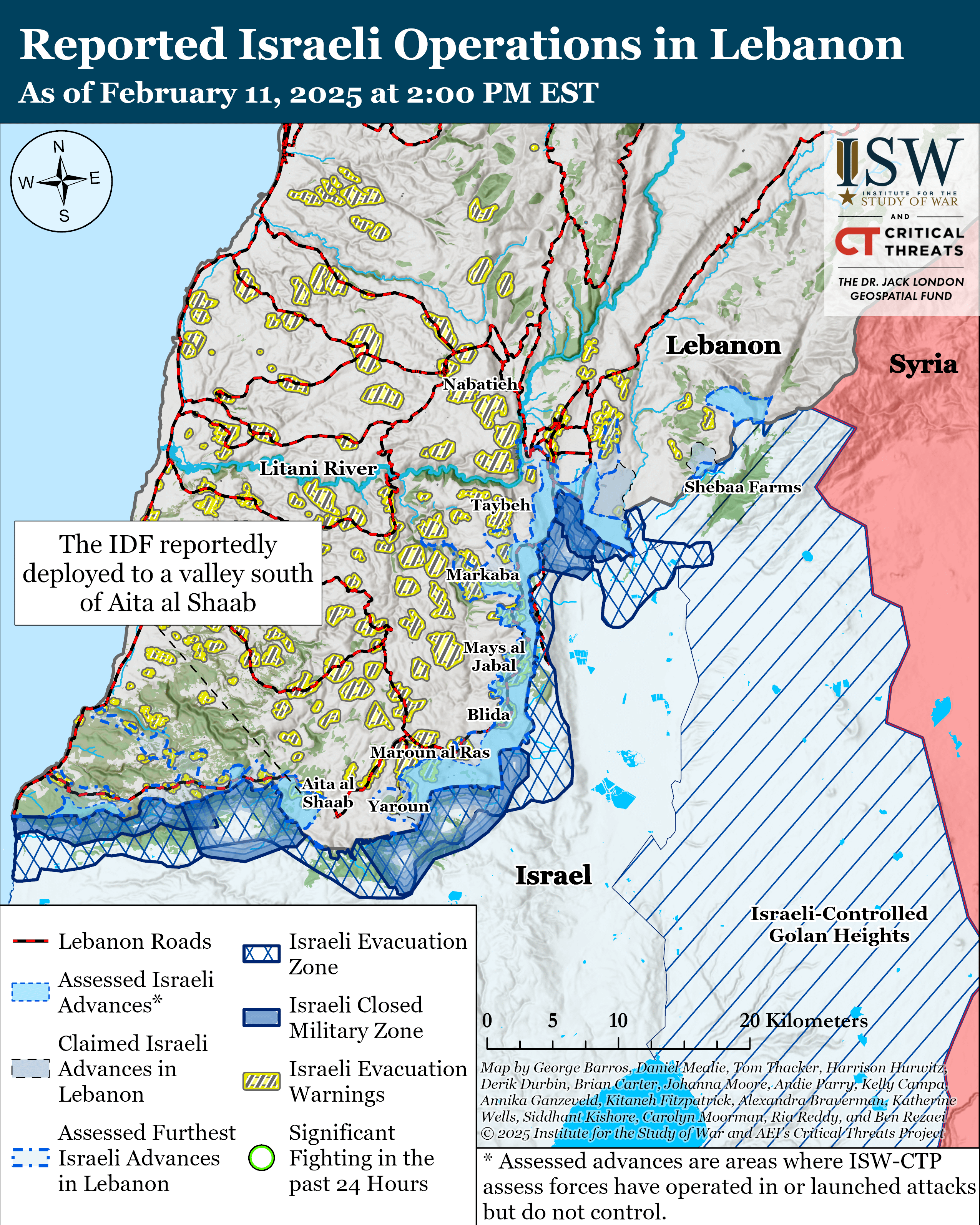 Israeli media reported on February 11 that the United States rejected an Israeli request to further extend the Israel-Lebanon ceasefire agreement, which would enable the IDF to maintain positions in Lebanon.[59] The United States announced on January 25 a ceasefire extension that requires the IDF to withdraw from Lebanon by February 18.[60]